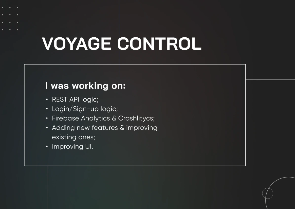 I was working on: REST API logic; Login/Sign-up logic; Firebase Analytics & Crashlitycs; Adding new features & improving existing ones; Improving UI. In addition, I participated in work on GPS and maps.