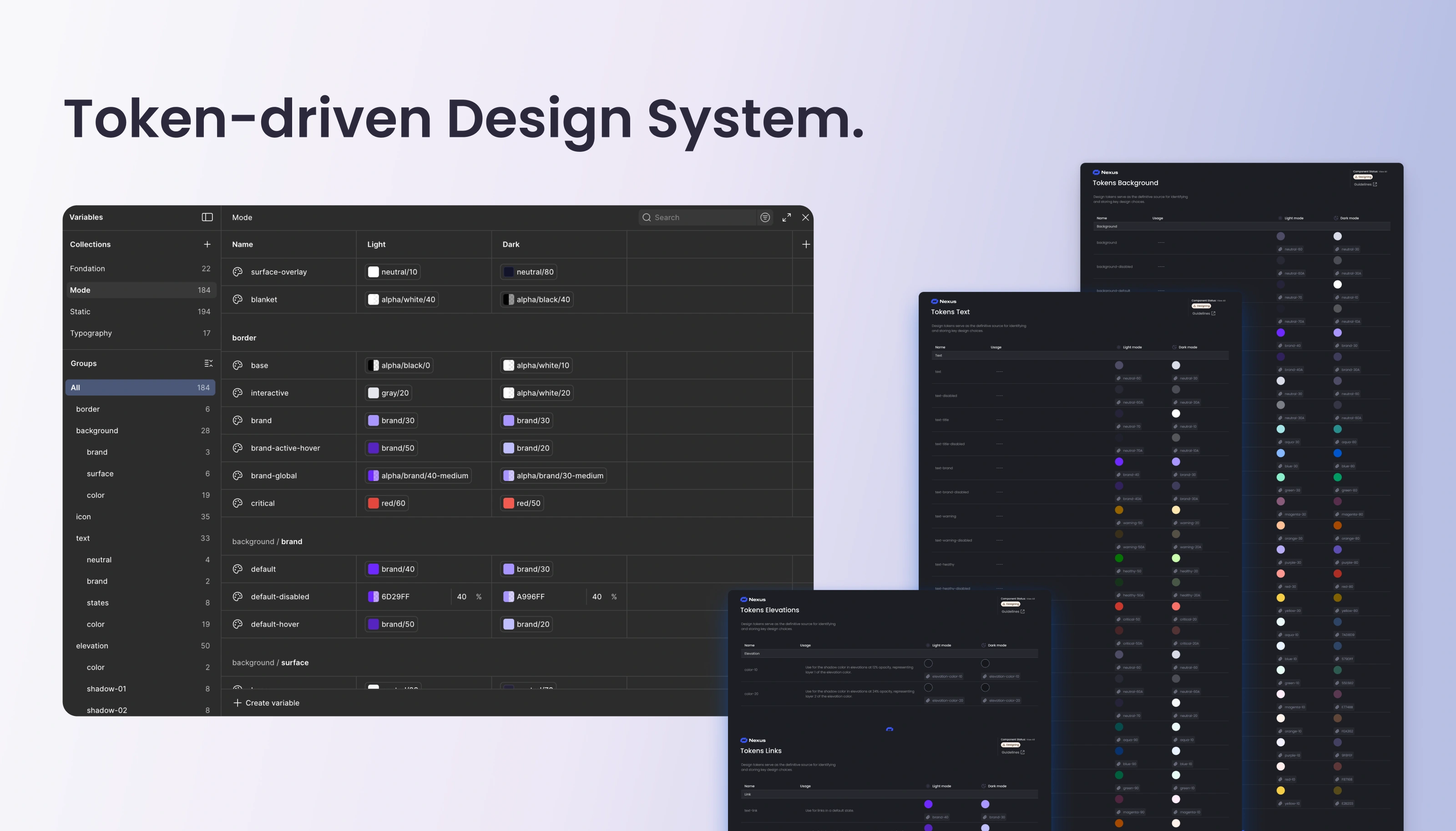 Instead of relying on local overrides, the system introduced semantic design tokens for color, spacing, typography, and component states. This approach aligned design and engineering workflows while continuing to leverage the existing component library.