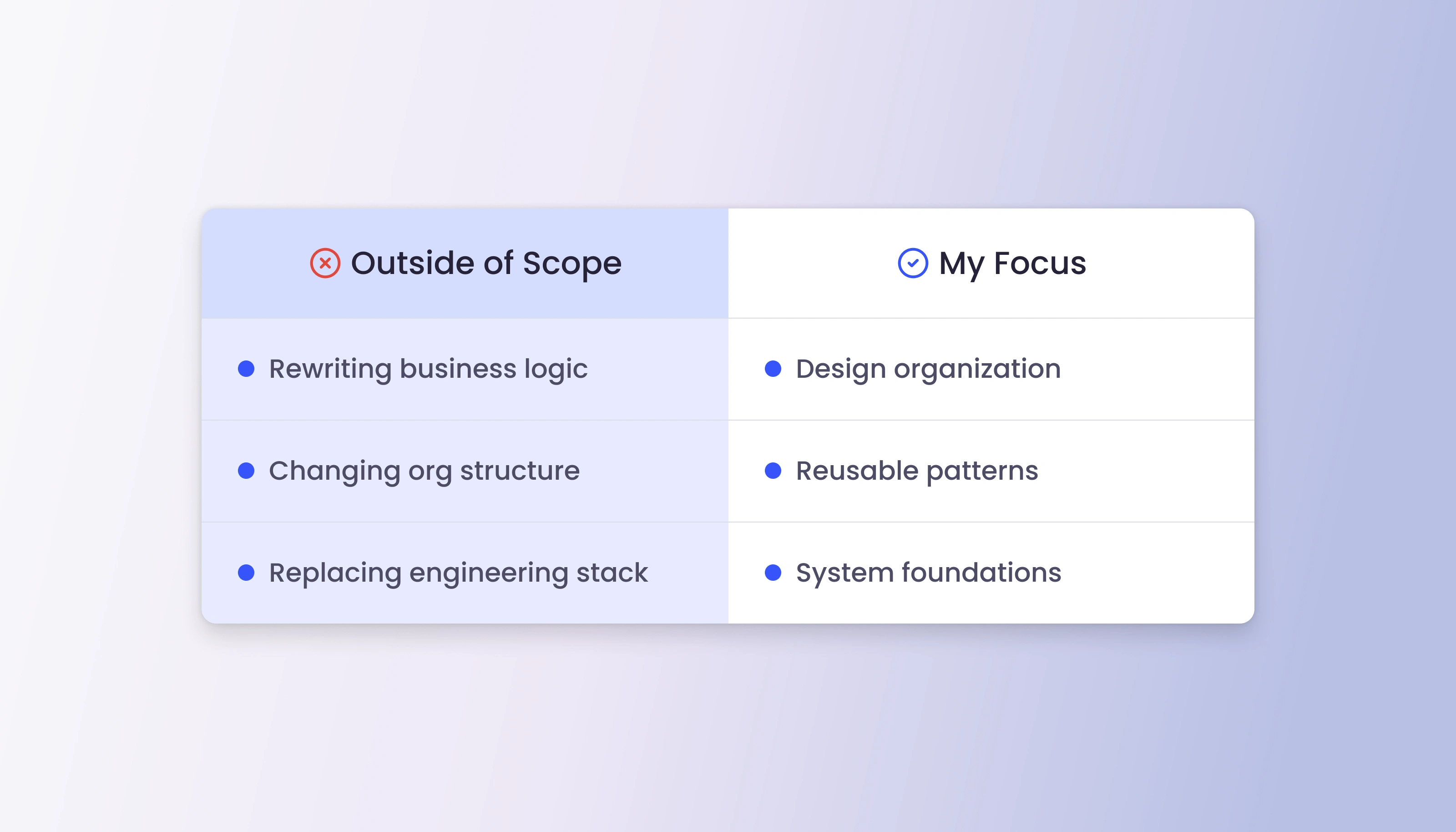 Clear definition of responsibilities, explicitly separating out-of-scope technical decisions from my focus on design organization, reusable patterns, and system foundations.