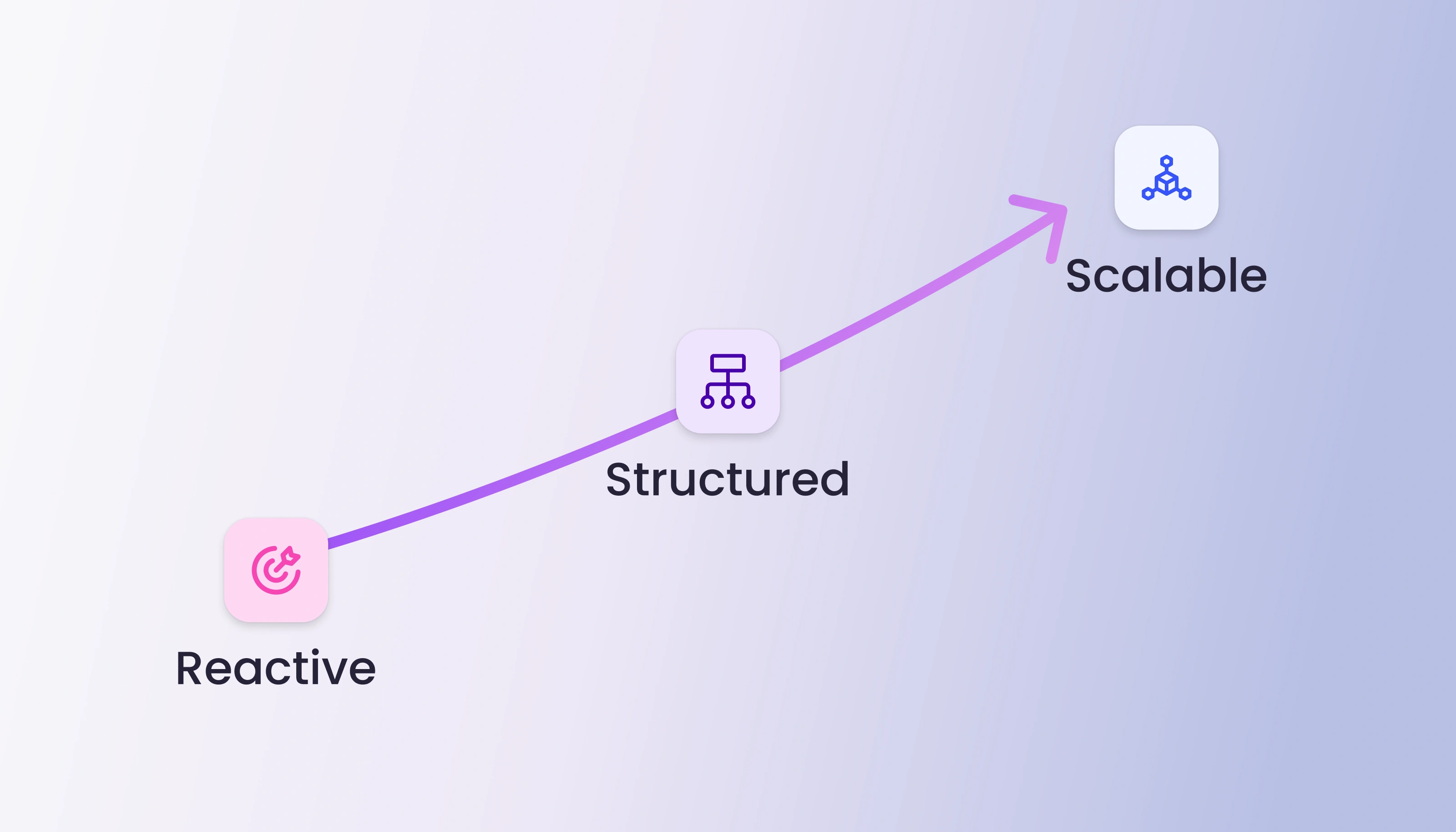 A progression from reactive design practices to a structured system, ultimately supporting scalable product development through governance and shared foundations.