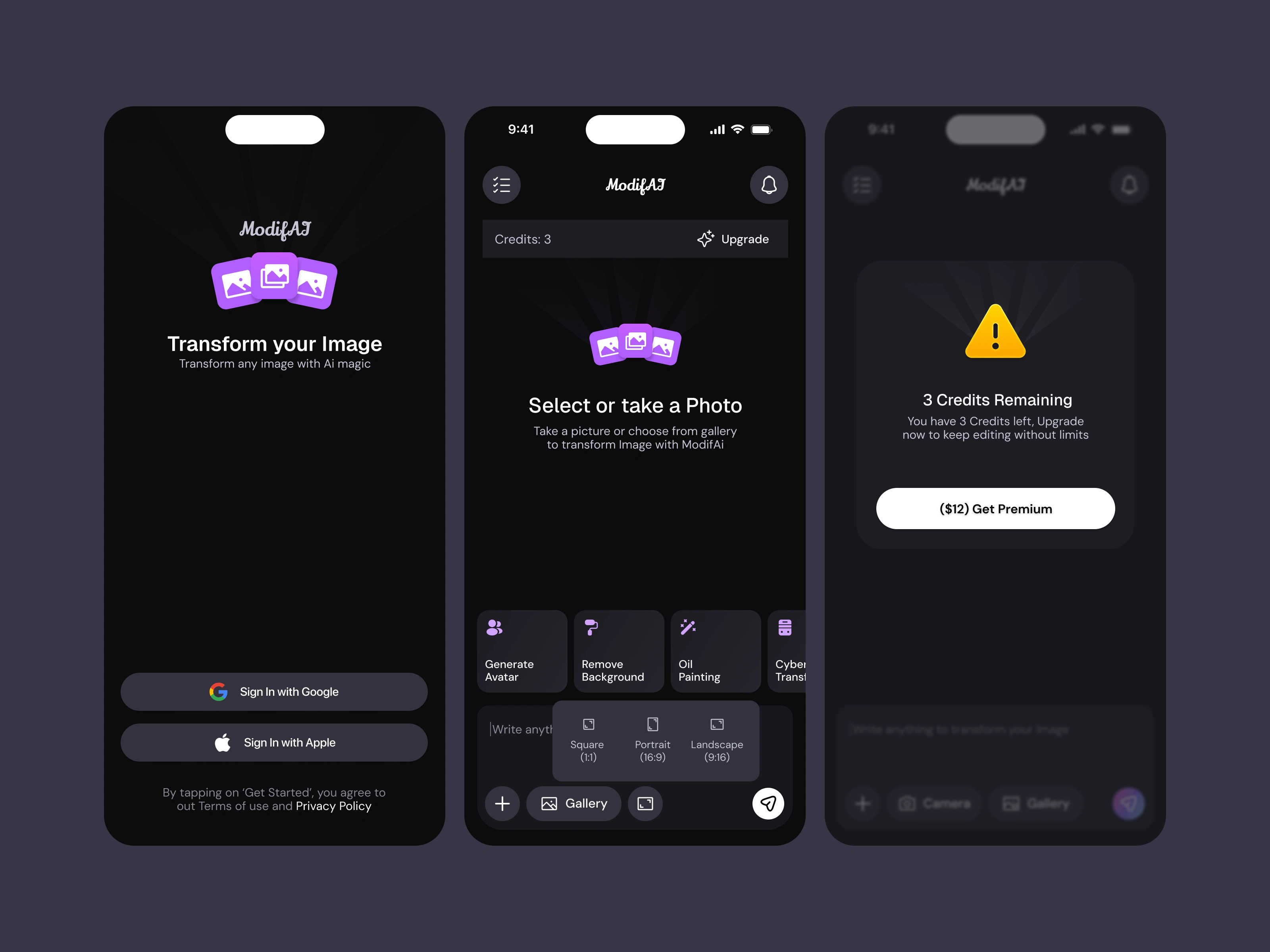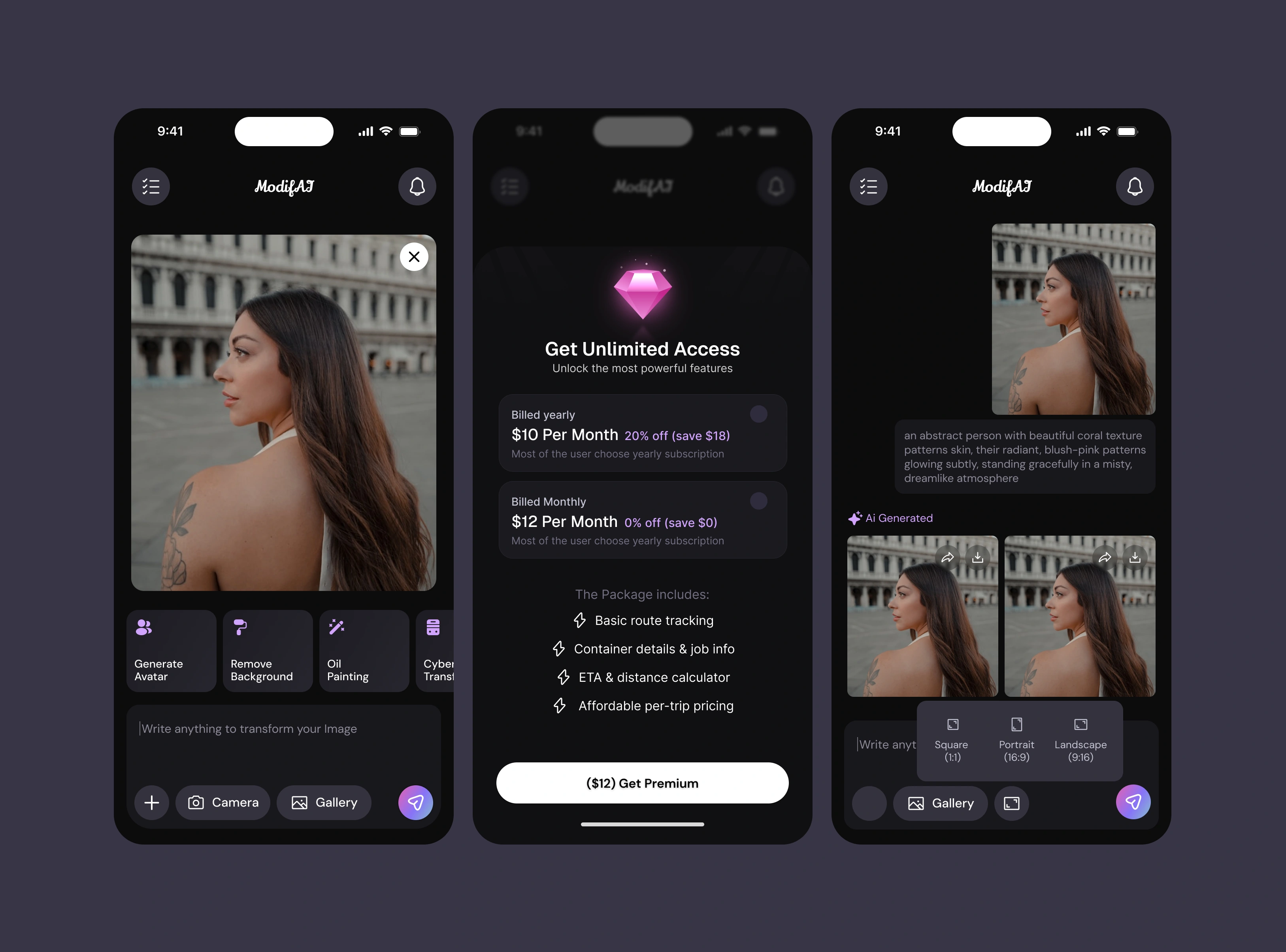ModifAI is an AI-powered image transformation app that lets you instantly edit, enhance, or stylize photos with ease. I designed a clean, dark-themed interface that highlights key actions like uploading, editing, and upgrading without overwhelming the user.