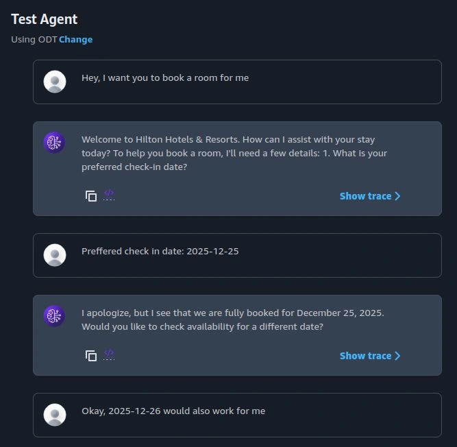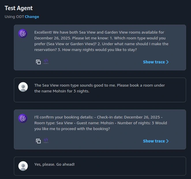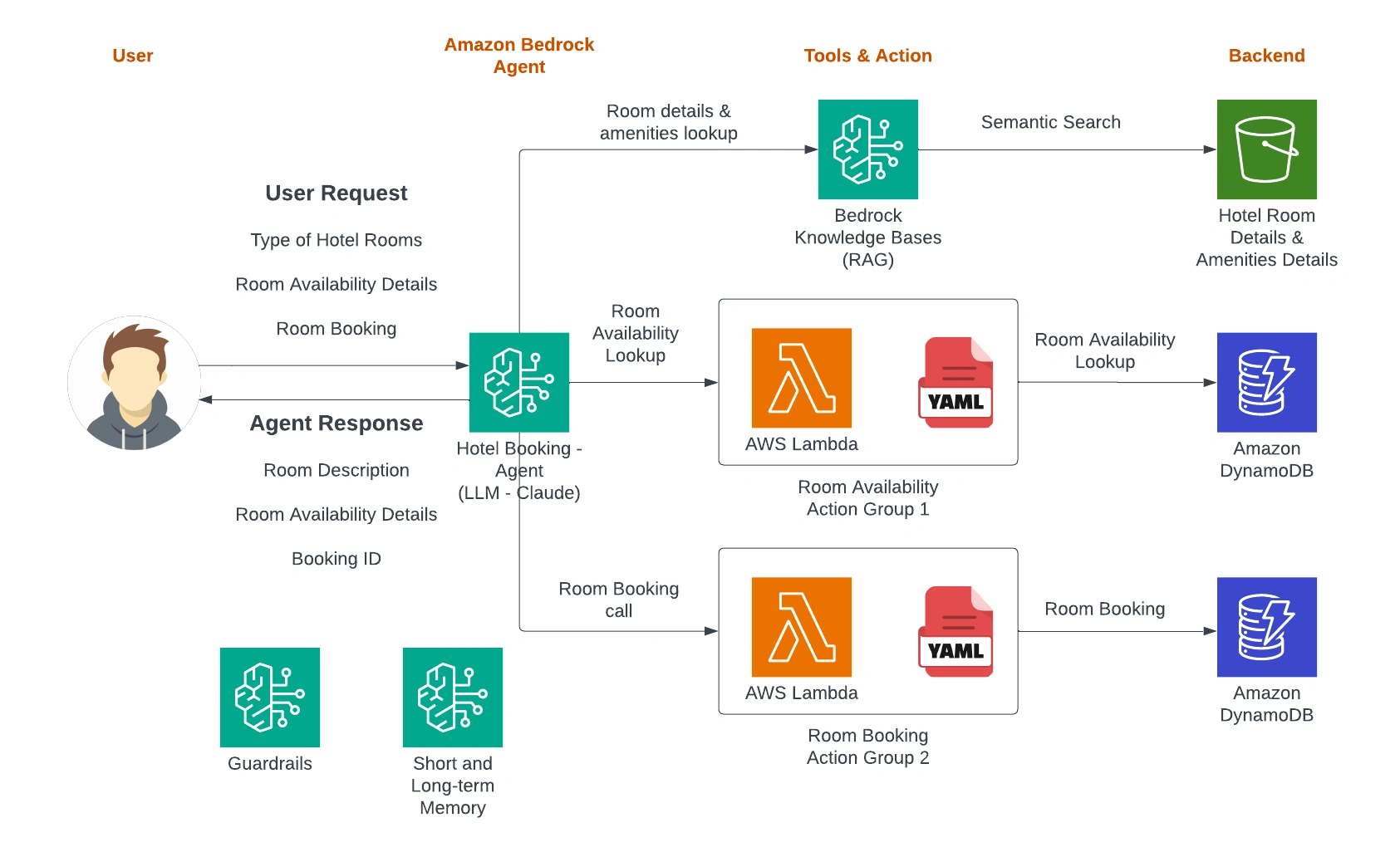 User Request Tool/Action Used Backend Resource "What types of hotel rooms do you have?" Bedrock Knowledge Base (RAG) Hotel details PDF in S3 "Is the sea-facing room available this weekend?" Action Group 1 (Lambda) Room Inventory Table in DynamoDB "Book it for me" Action Group 2 (Lambda) Booking Table in DynamoDB