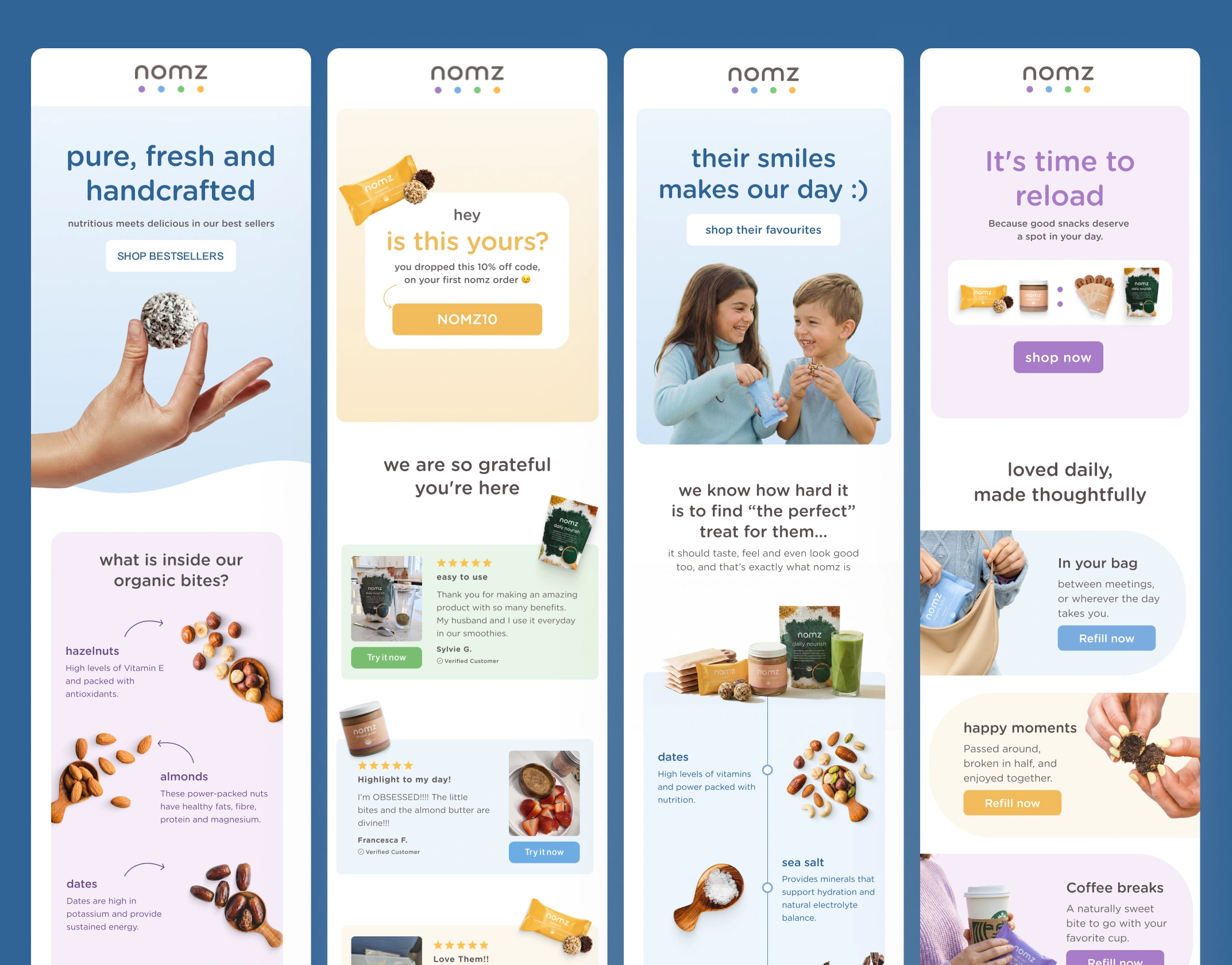 Nomz klaviyo email marketing flows design and setup. Each flow was designed to guide customers from discovery to loyalty while keeping communication intentional, helpful, and visually soothing. #emaildesign #emailmarketing #klaviyo