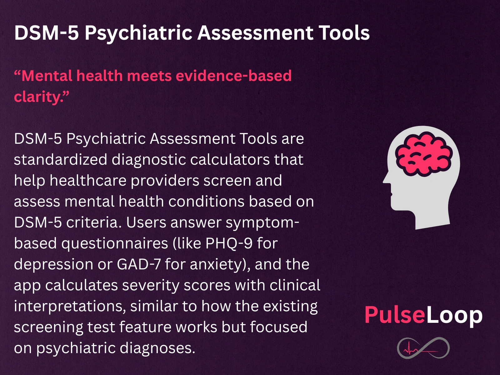 DSM-5 tools let users complete symptom-based quizzes (like PHQ-9, GAD-7) to screen, score, and interpret mental health conditions with clinical accuracy.