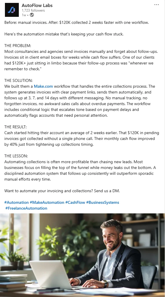 We successfully leveraged this authority to launch the AutoFlow Inner Circle (currently 500+ members) and filled a Paid Training Cohort.