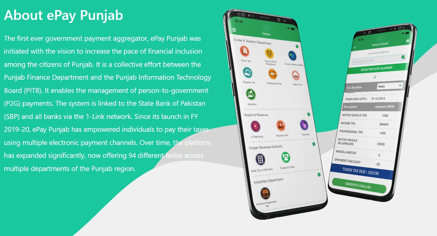ePay Punjab is Pakistan’s first government digital payment aggregator, enabling citizens to pay taxes, fees, and utility bills online through a unified platform. It integrates multiple banks and payment gateways, including 1Link, JazzCash, and EasyPaisa, offering both mobile app and web-based access.