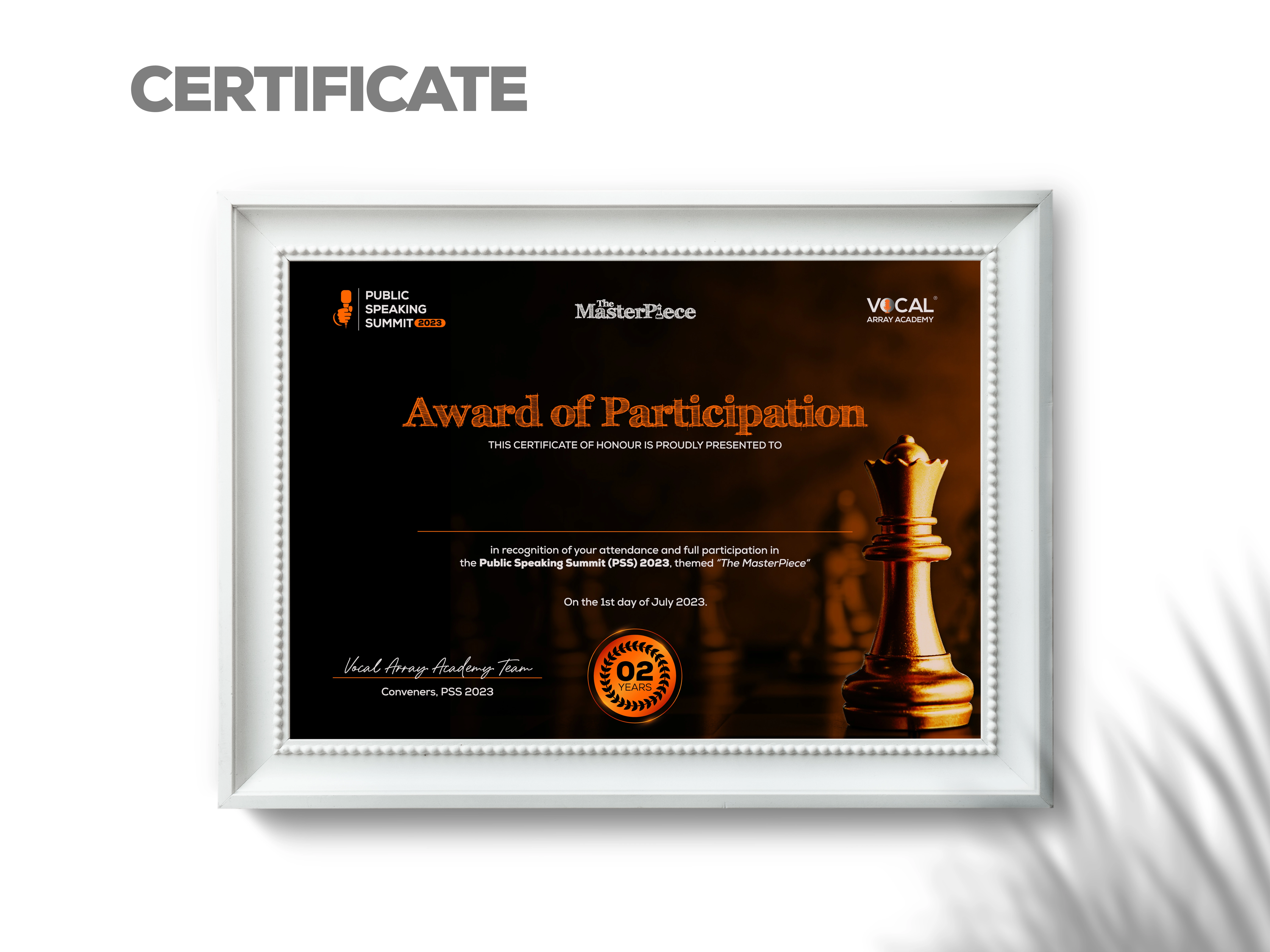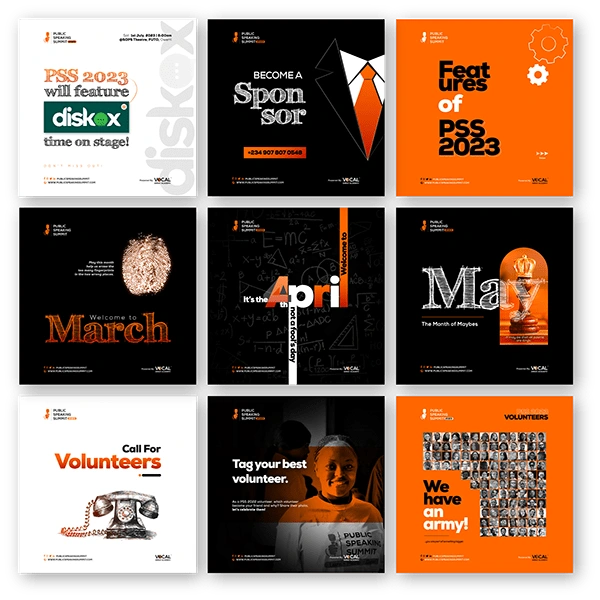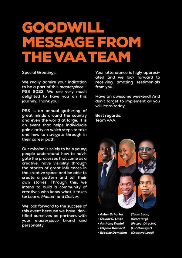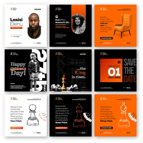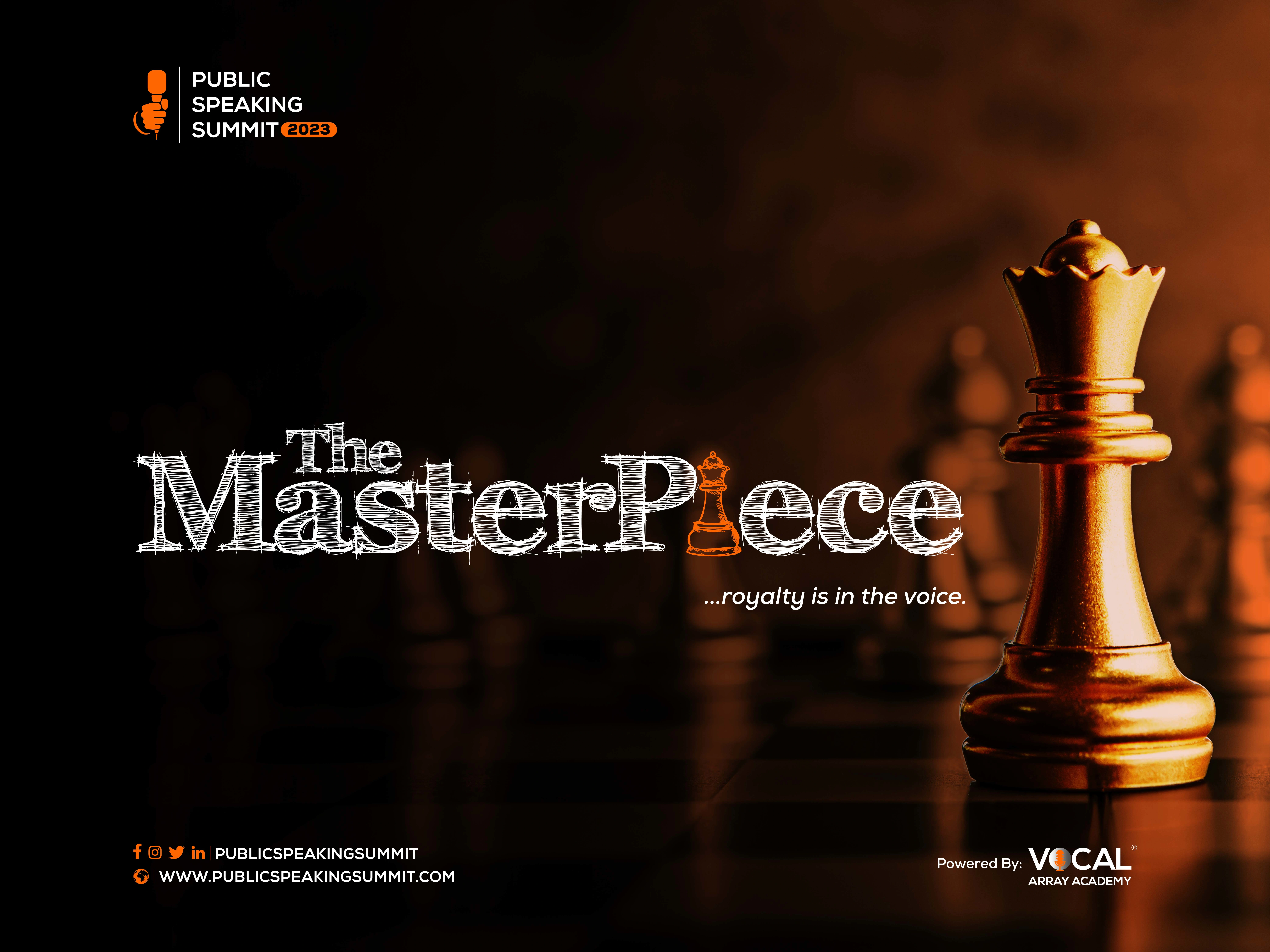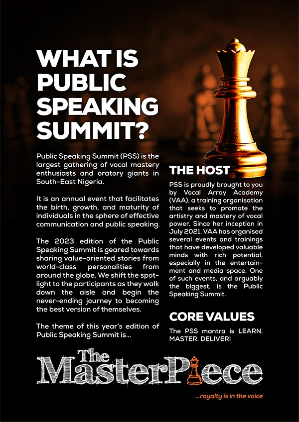 In a bid to creatively animate the theme of PSS 2023, "The Masterpiece", I strategically created an event logo that reflected the artistic nature of masterpieces crafted with extraordinary skill. Moving on, I associated the central icons in the branding to the game of chess, hoping to portray the delicate sacrifices required when making and playing chess [master] pieces.