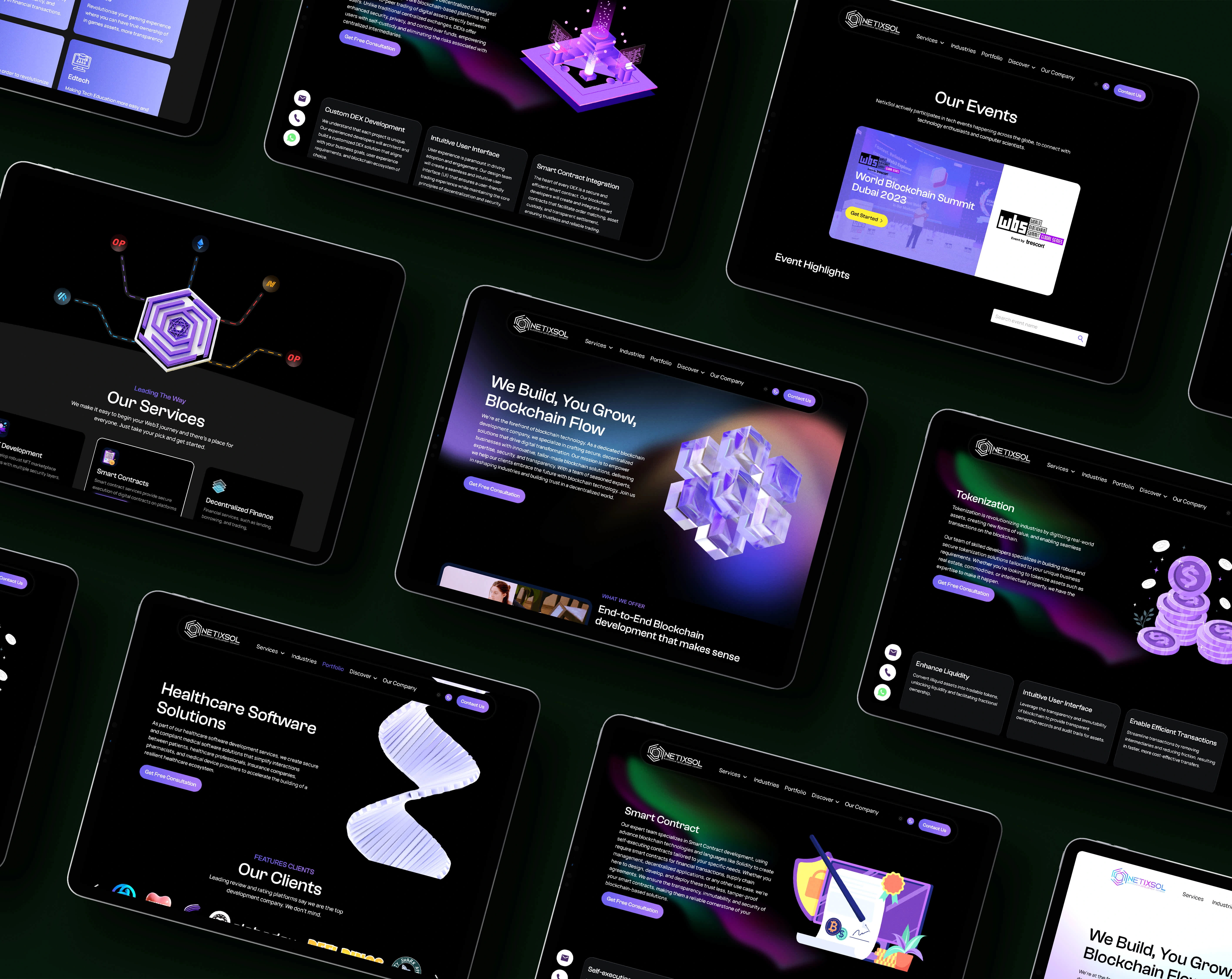 The interface follows a structured, minimal layout with bold typography, strategic use of space, and a dark-modern color palette tailored for blockchain, crypto, and DeFi platforms. 3D elements and animations enhance user engagement, while motion graphics bring energy and depth to the brand narrative.