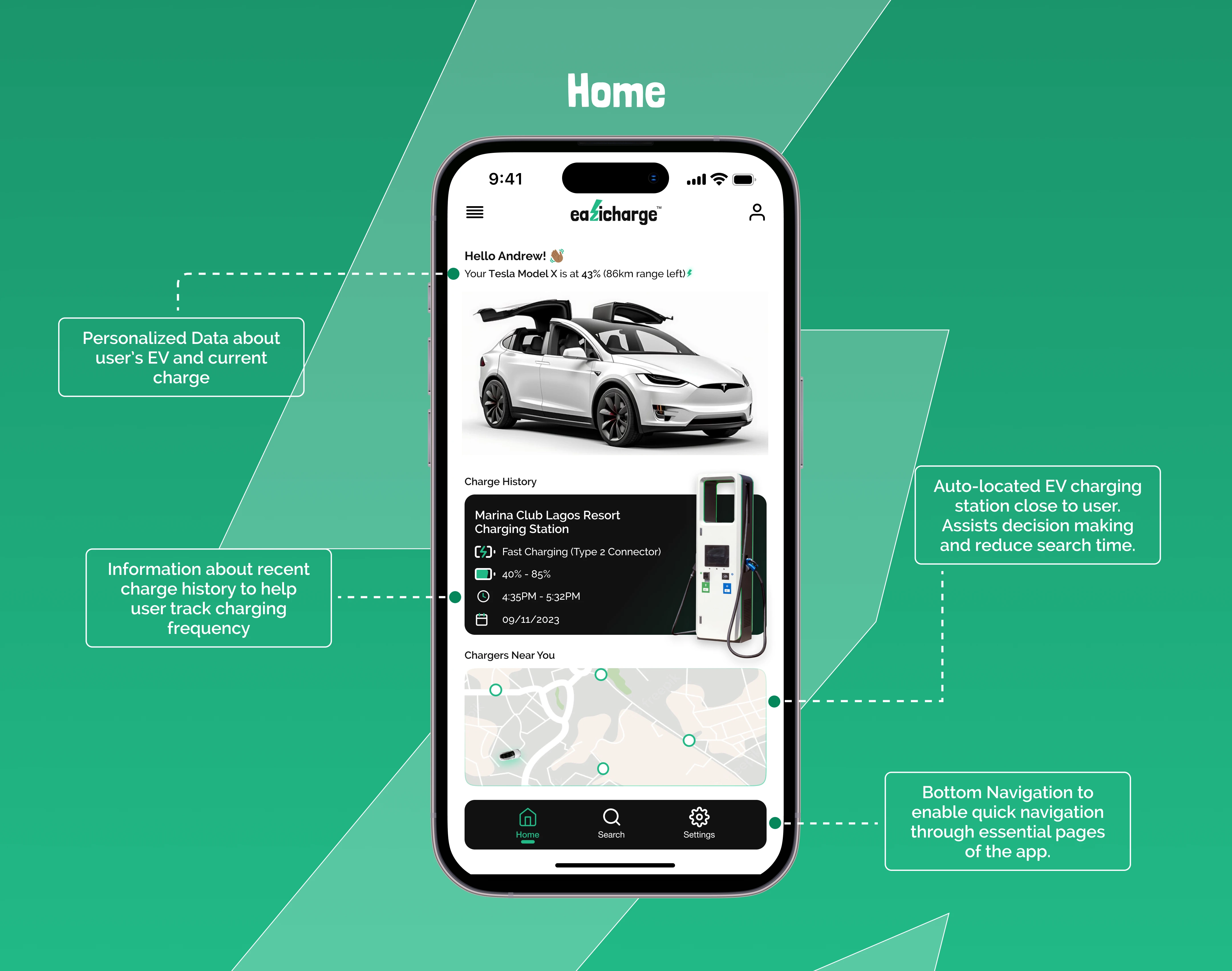 The Eazicharge project focused on designing a mobile app that helps users quickly find and navigate to nearby EV charging stations.