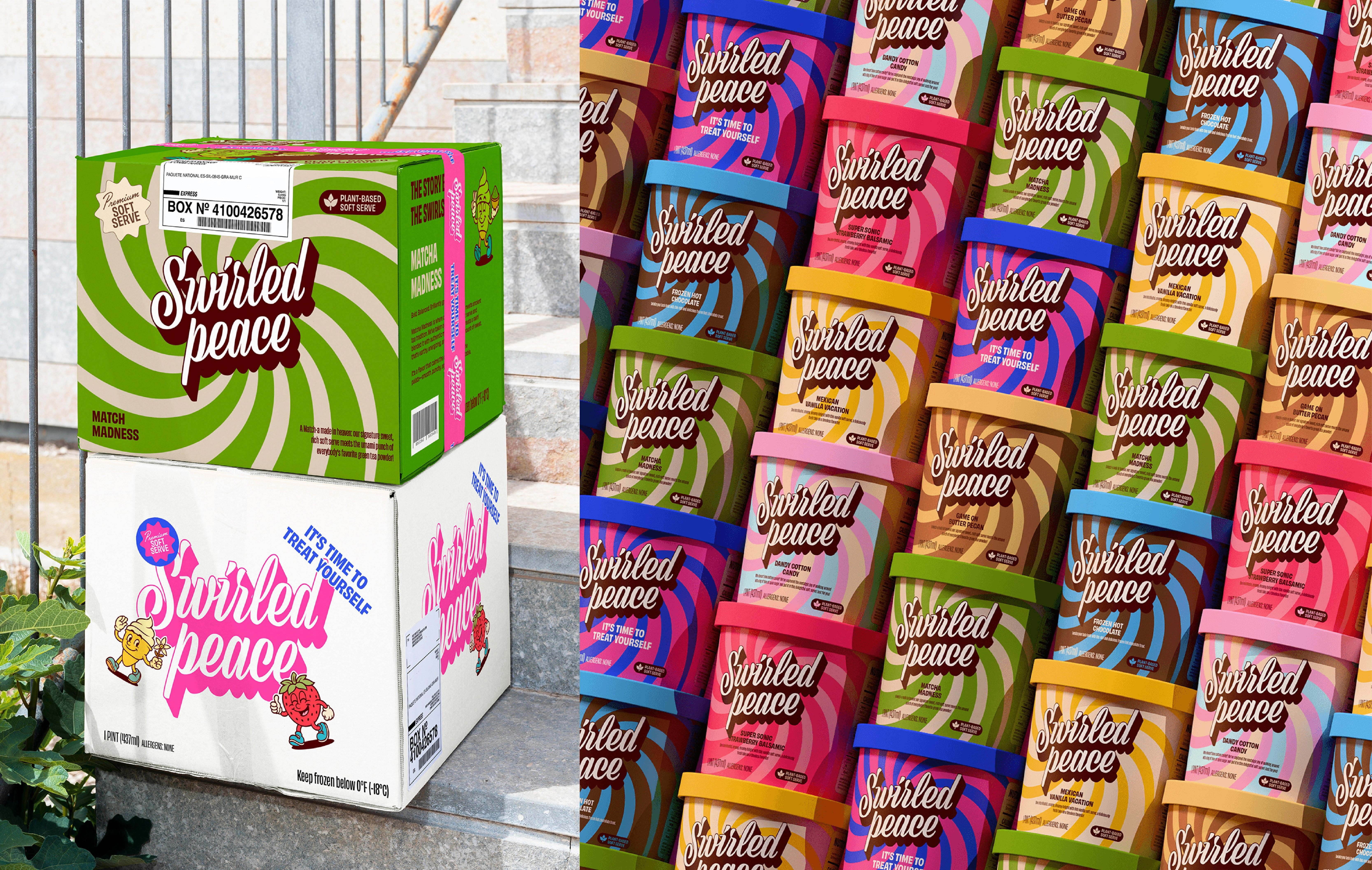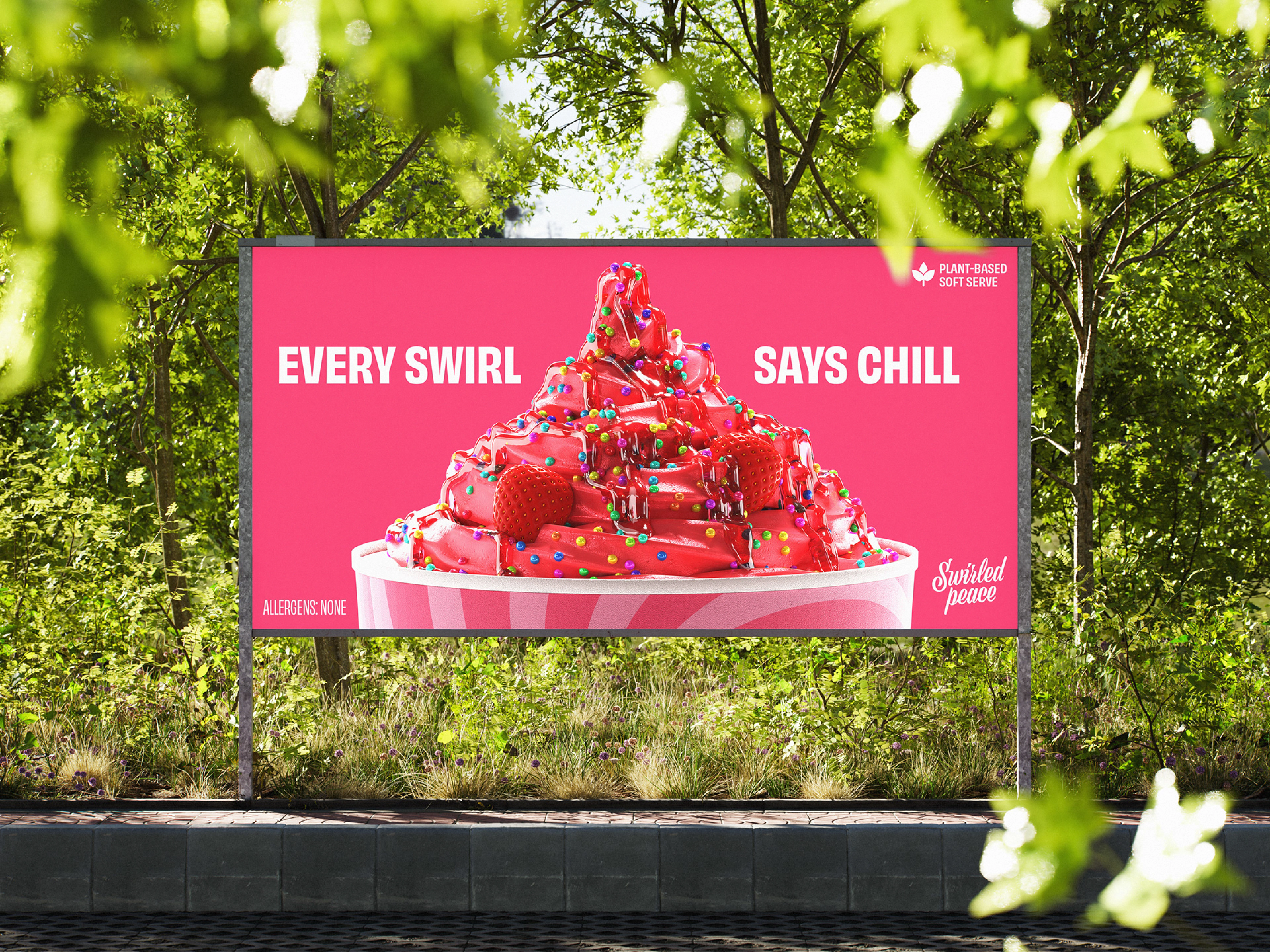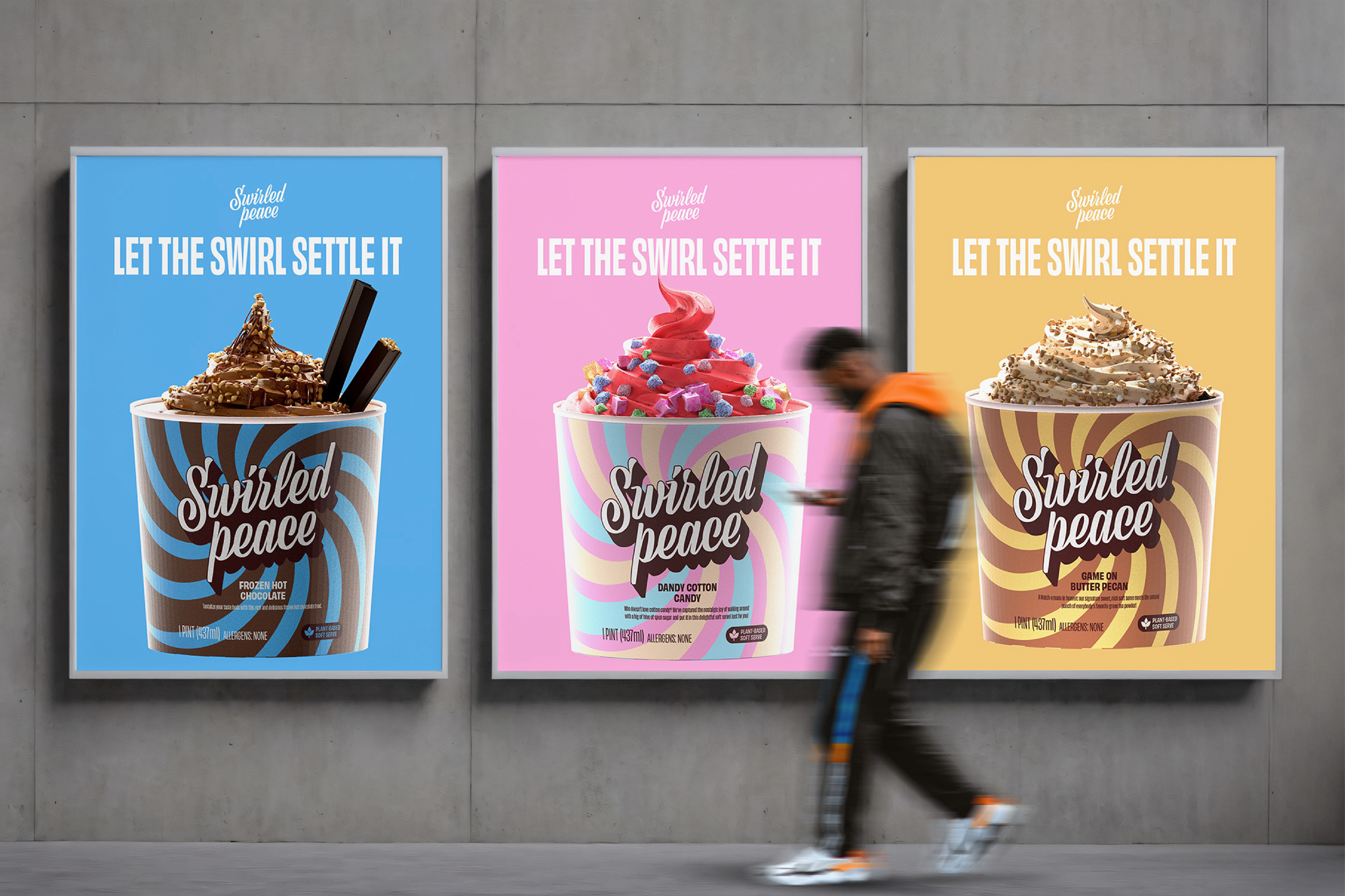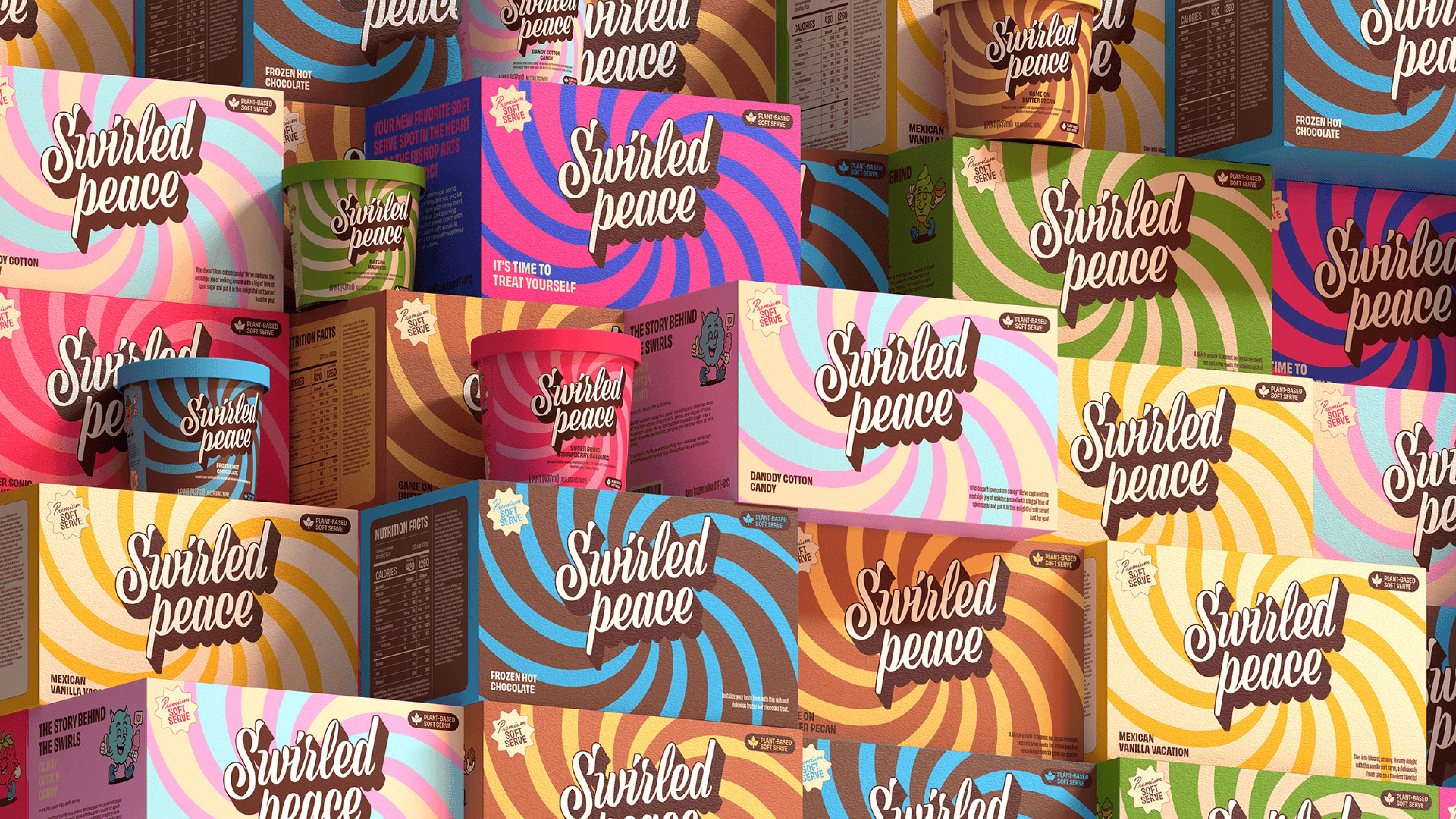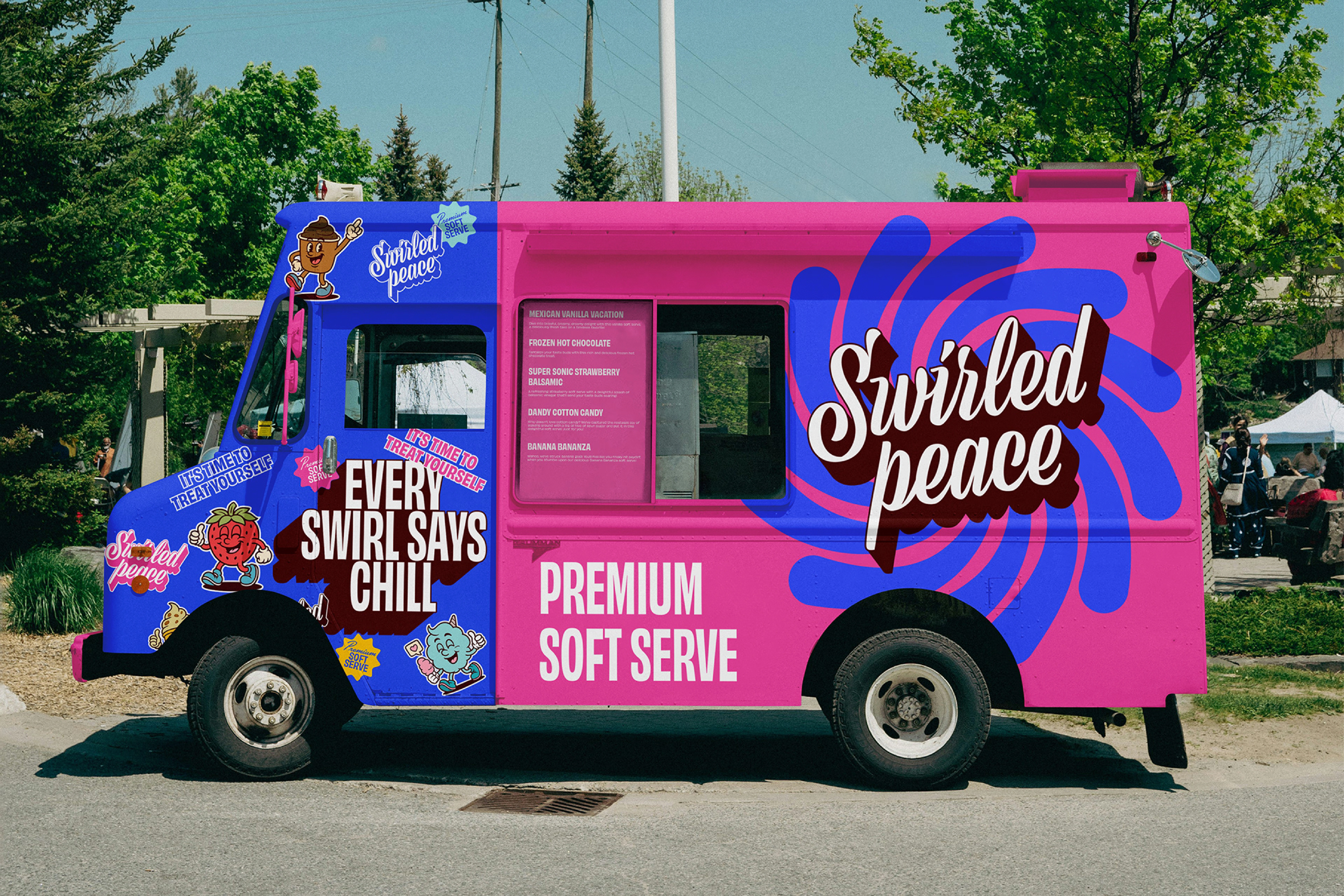 Swirled Peace is a community-first soft-serve ice cream brand with a heart — founded on childhood nostalgia, inclusivity, and plant-based joy. The challenge was translating that warmth into a visual identity that could compete on shelf, connect emotionally with customers, and scale across packaging, apparel, and out-of-home.