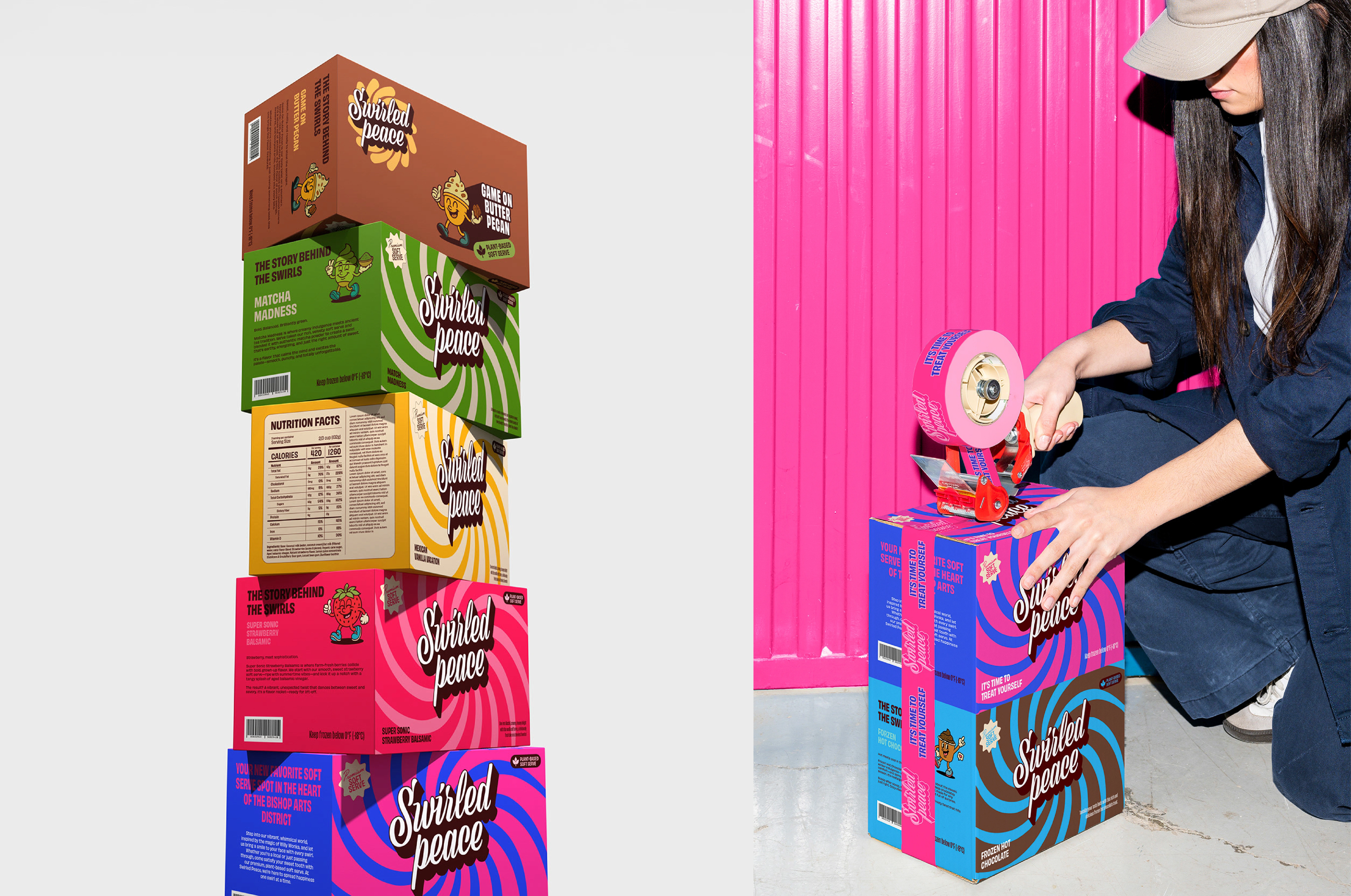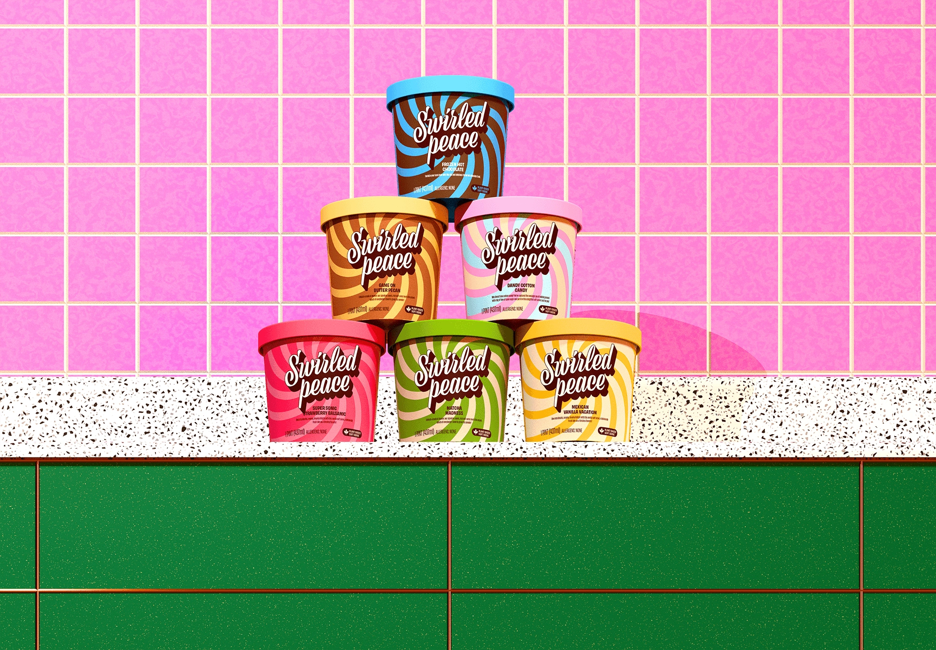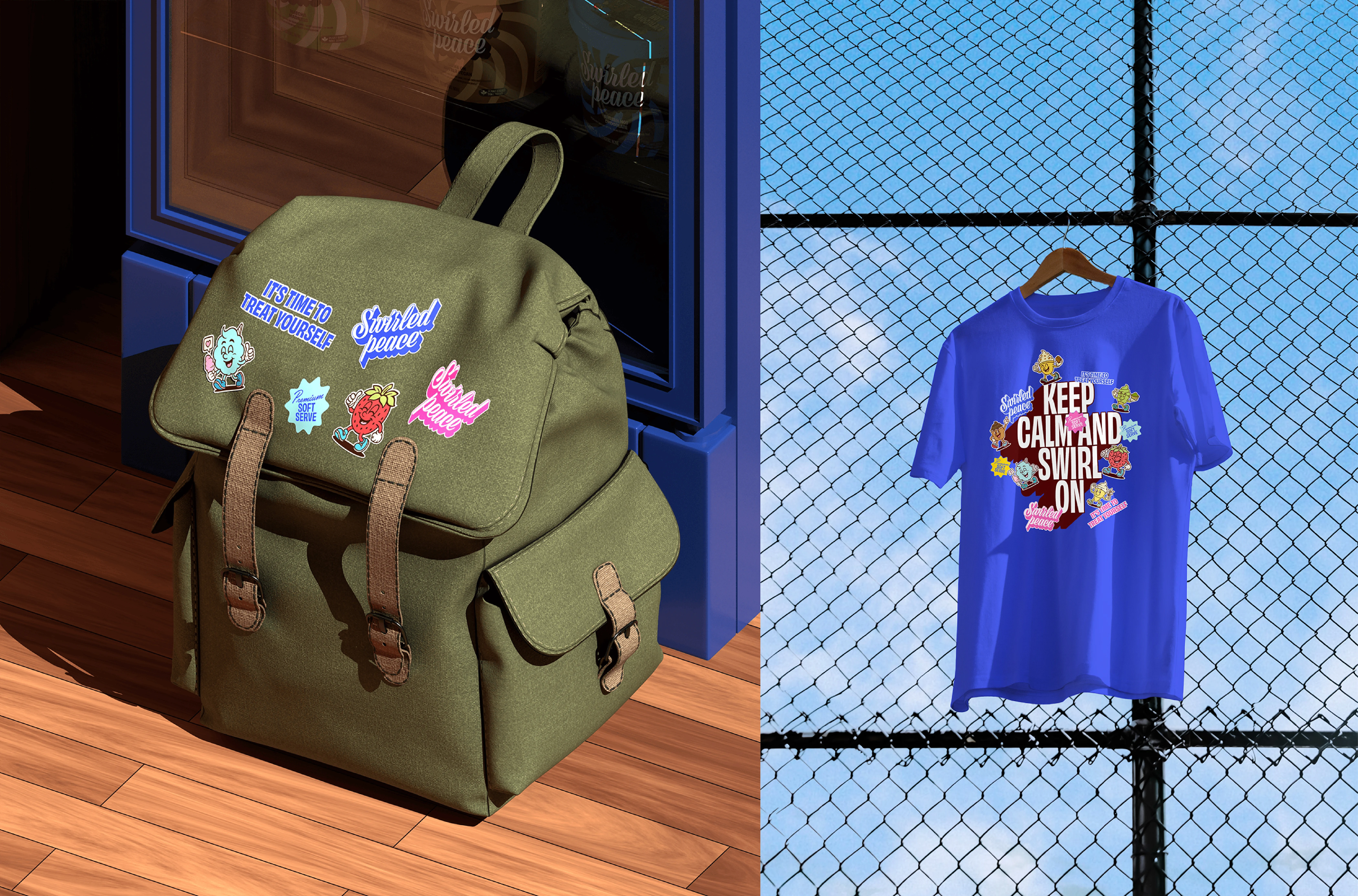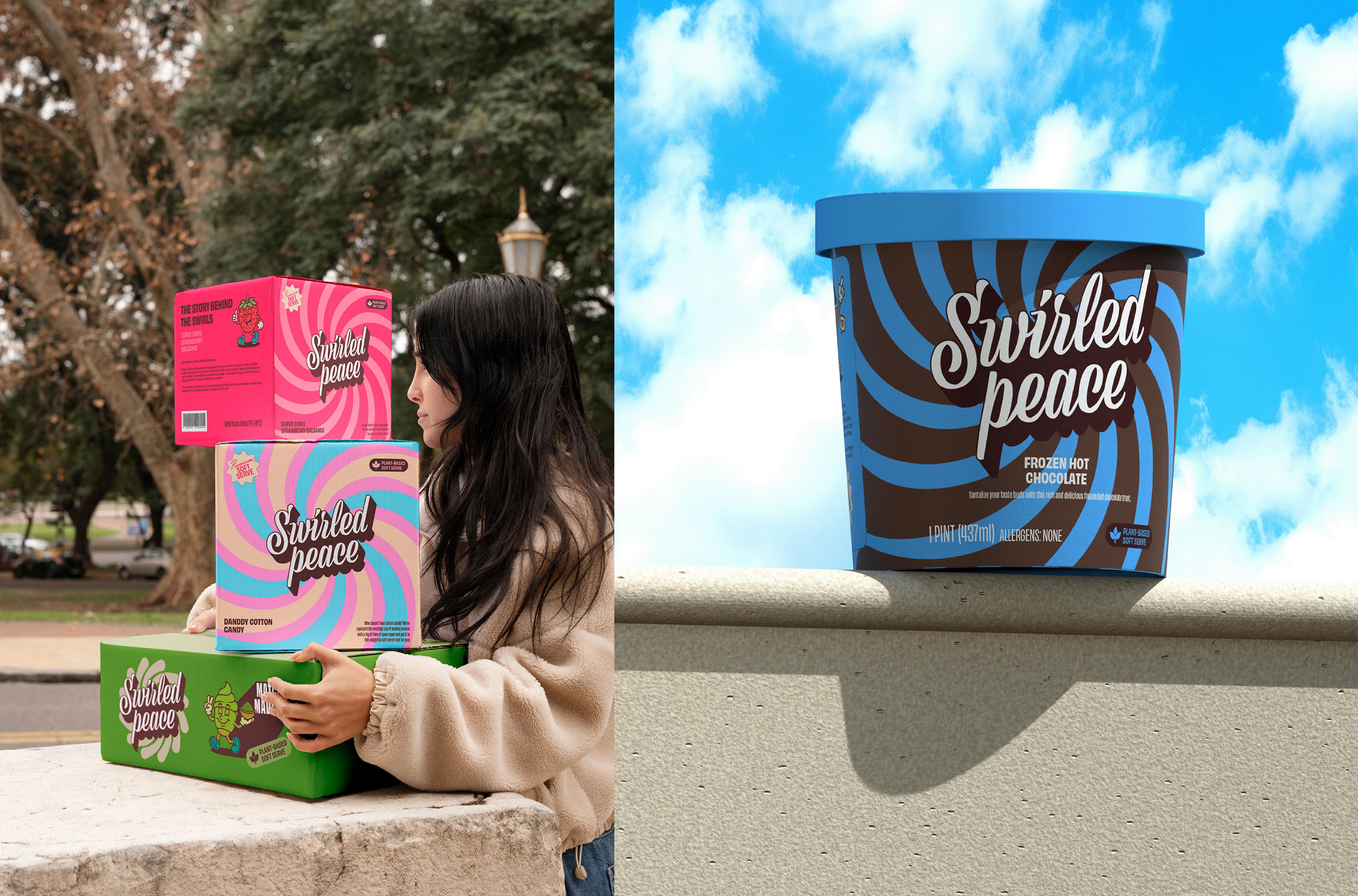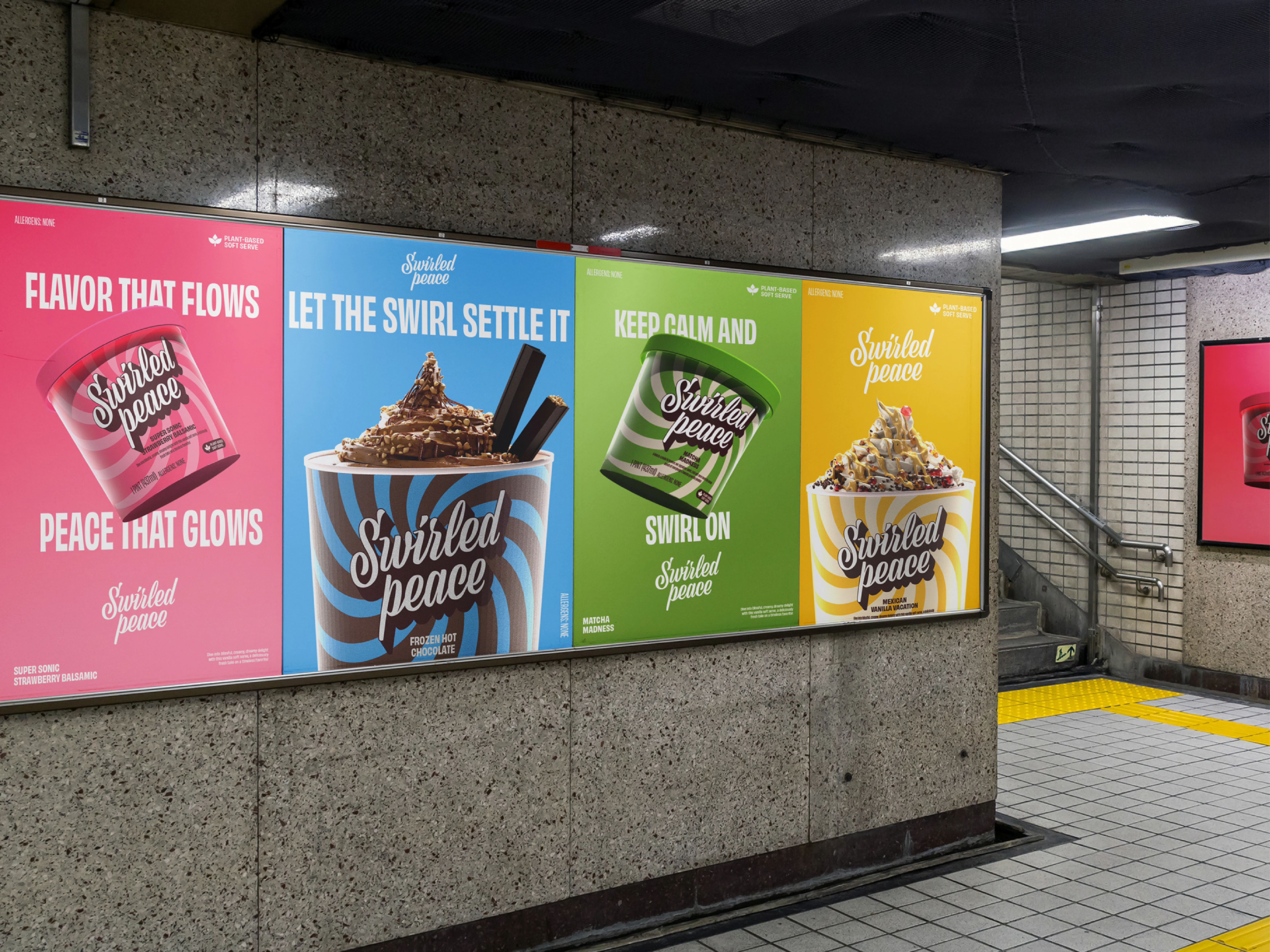 Swirled Peace is a community-first soft-serve ice cream brand with a heart — founded on childhood nostalgia, inclusivity, and plant-based joy. The challenge was translating that warmth into a visual identity that could compete on shelf, connect emotionally with customers, and scale across packaging, apparel, and out-of-home.