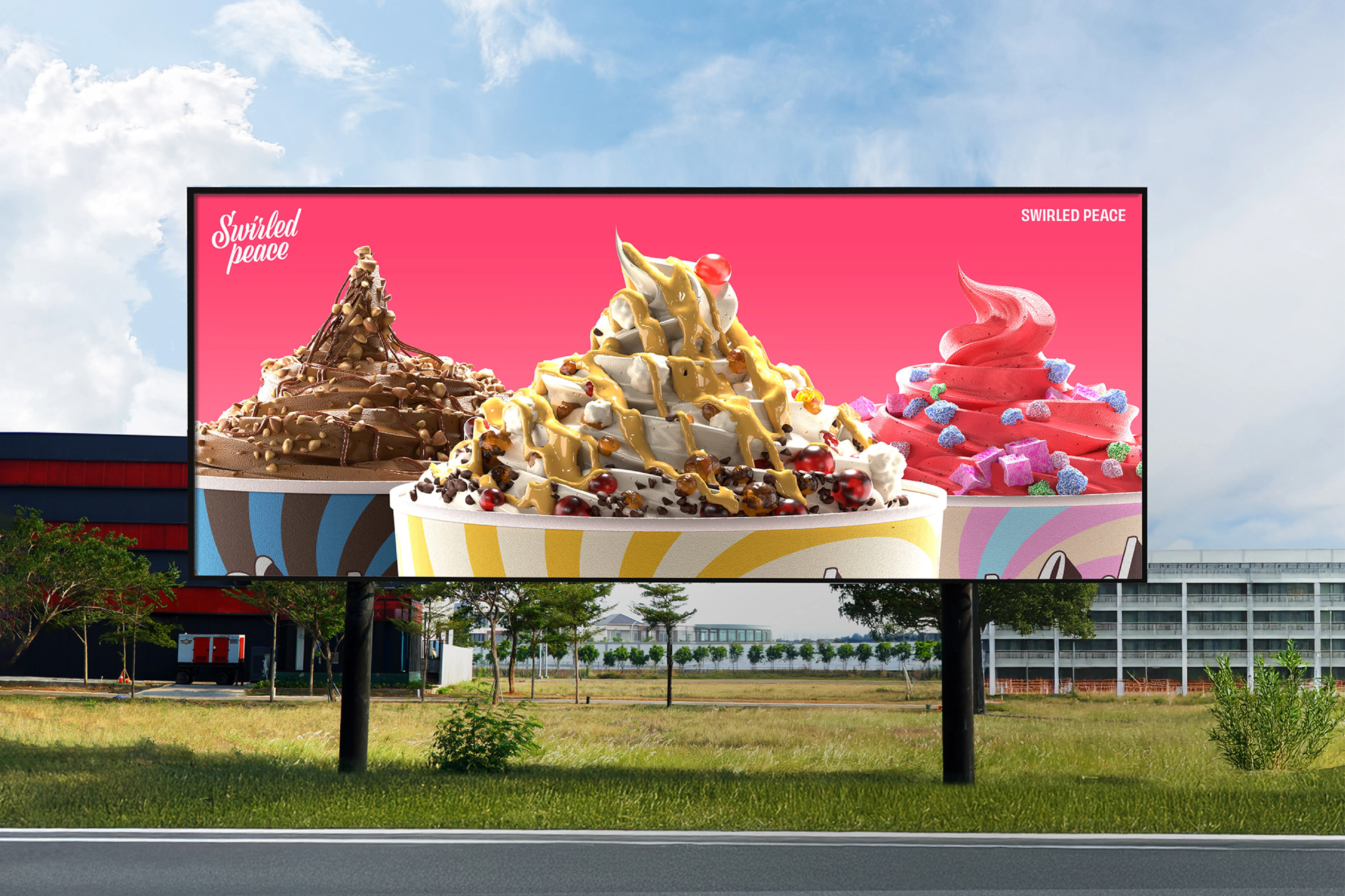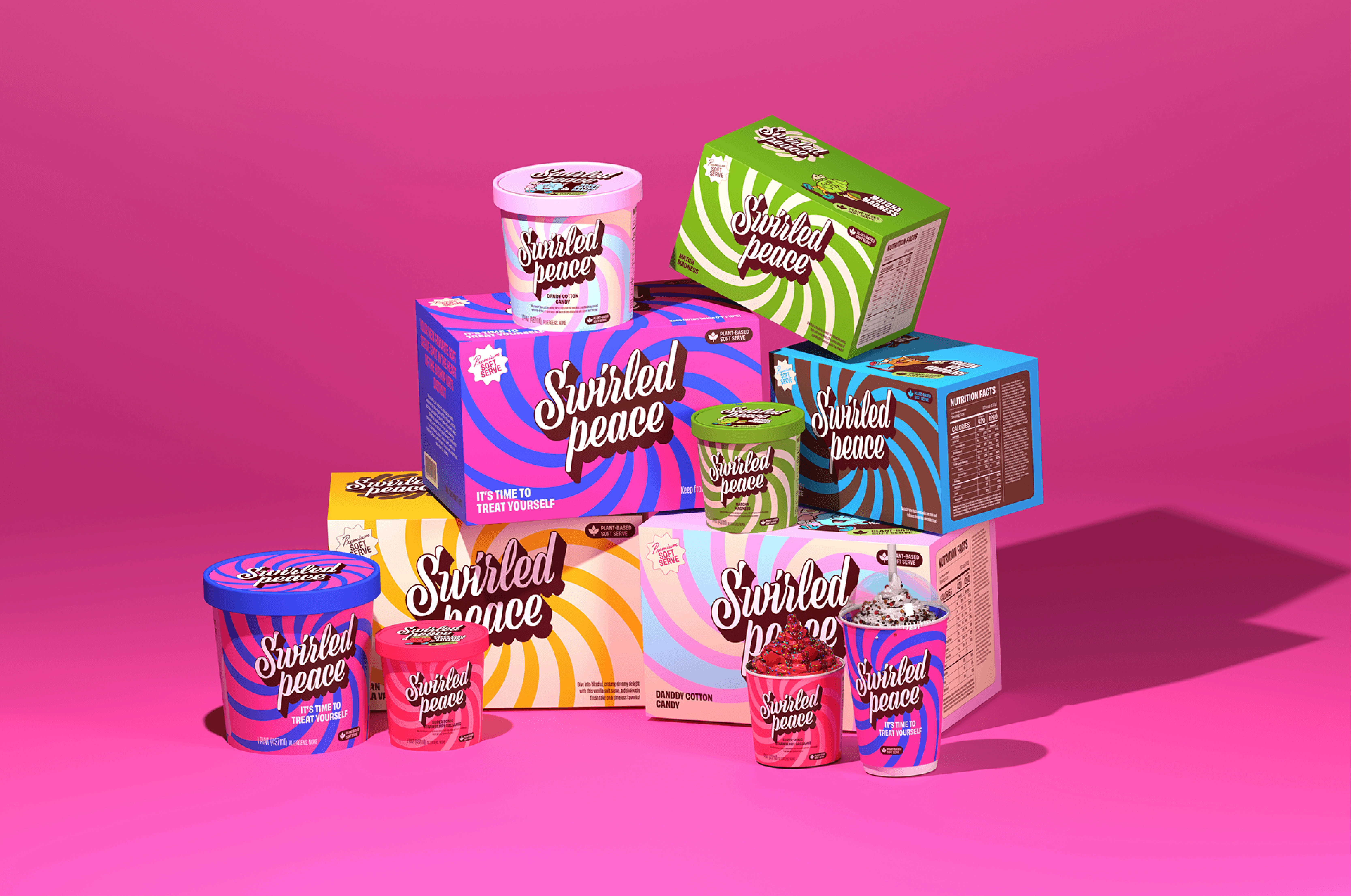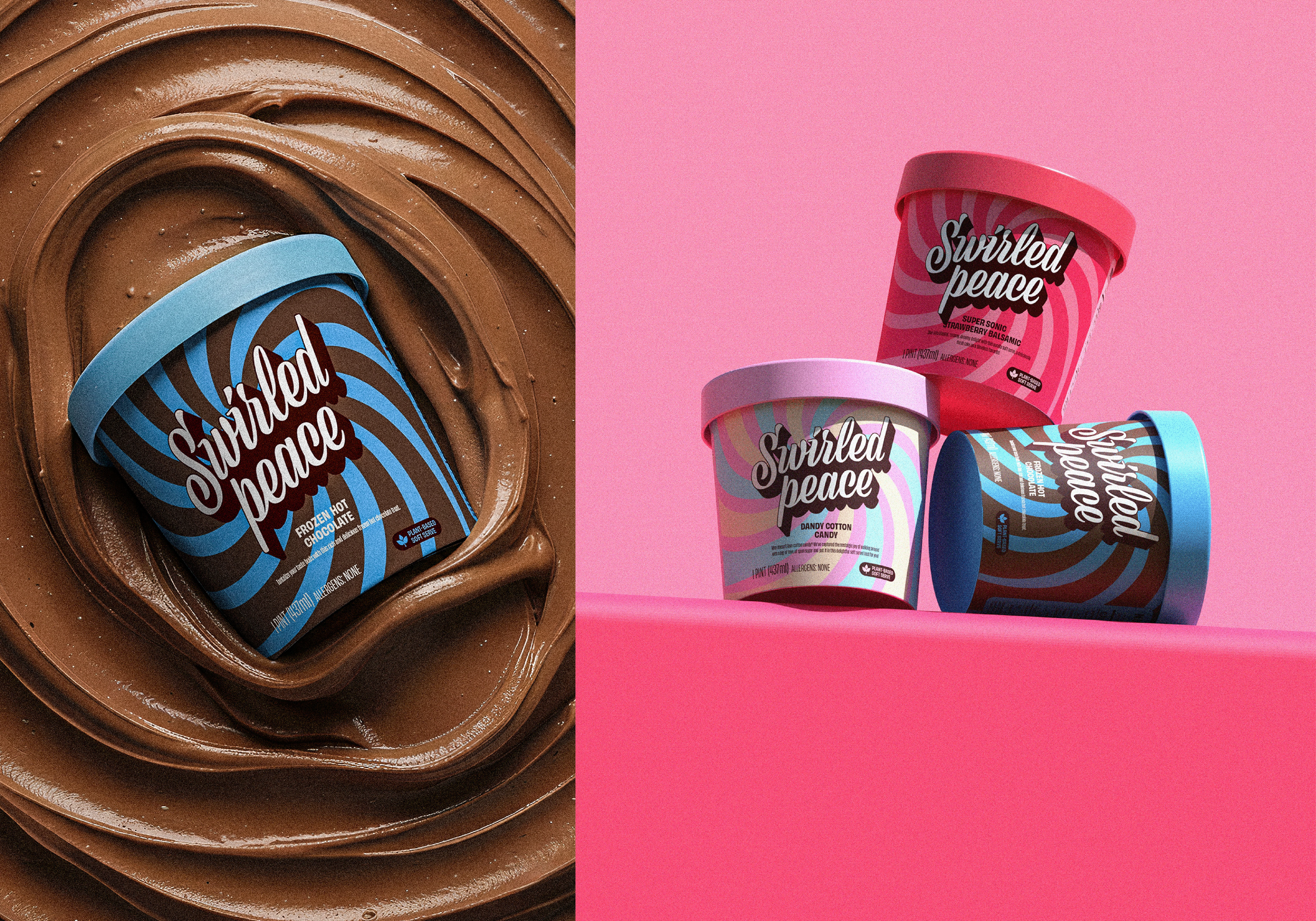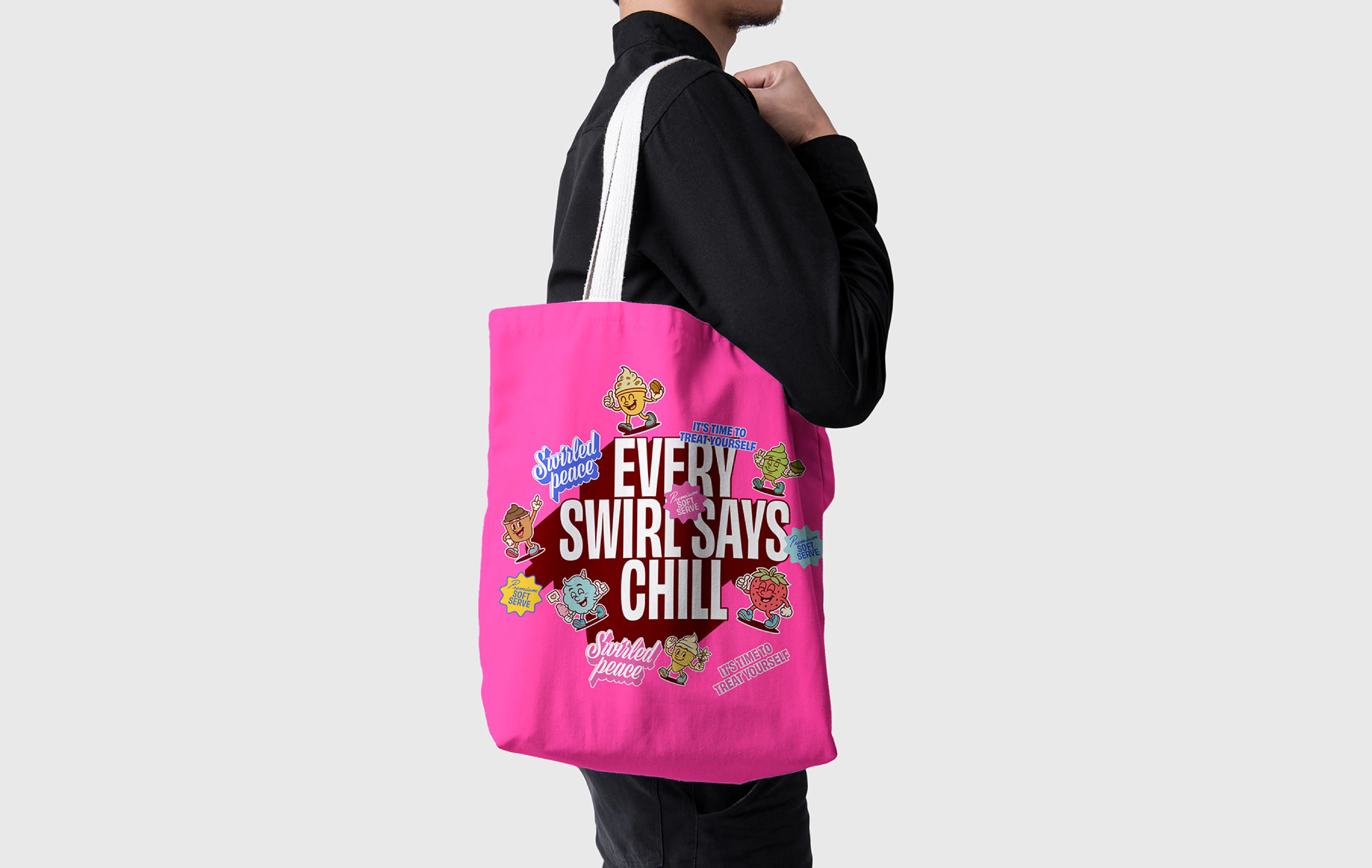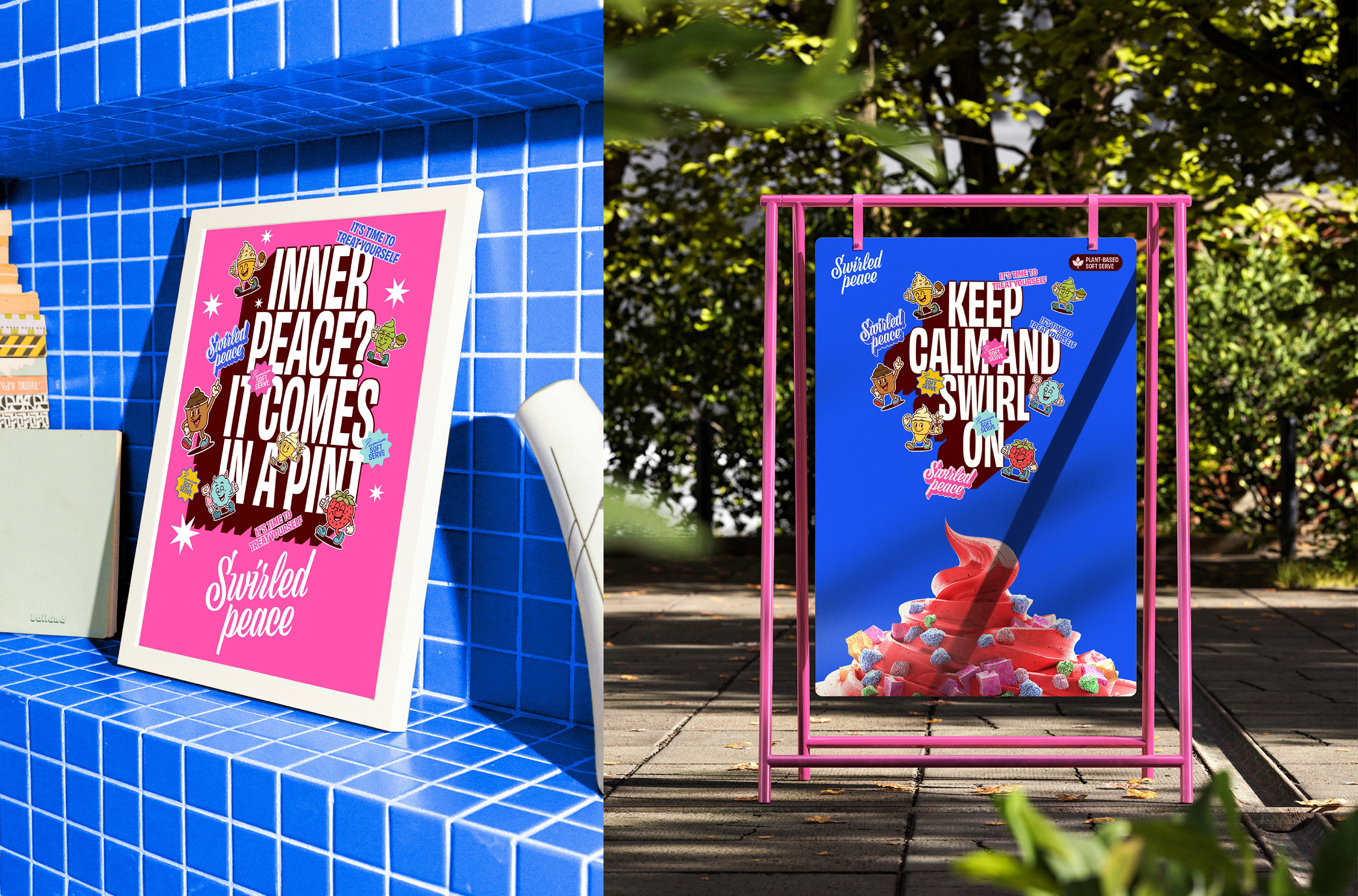 Swirled Peace is a community-first soft-serve ice cream brand with a heart — founded on childhood nostalgia, inclusivity, and plant-based joy. The challenge was translating that warmth into a visual identity that could compete on shelf, connect emotionally with customers, and scale across packaging, apparel, and out-of-home.