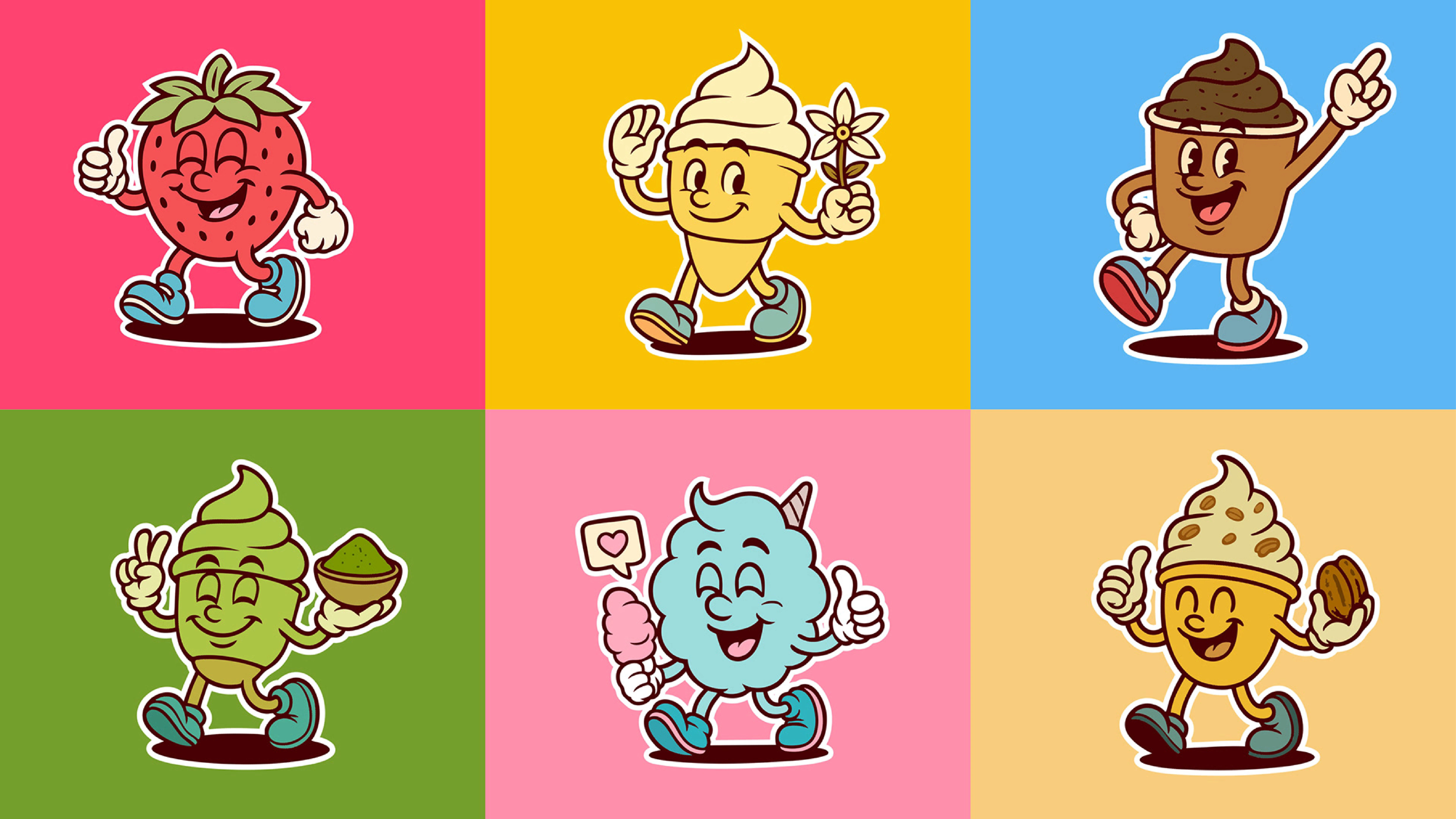 Playful ice cream brand identity with flavor mascots, bold typography, and vibrant packaging designed to stand out on the shelf and delight at every touchpoint.