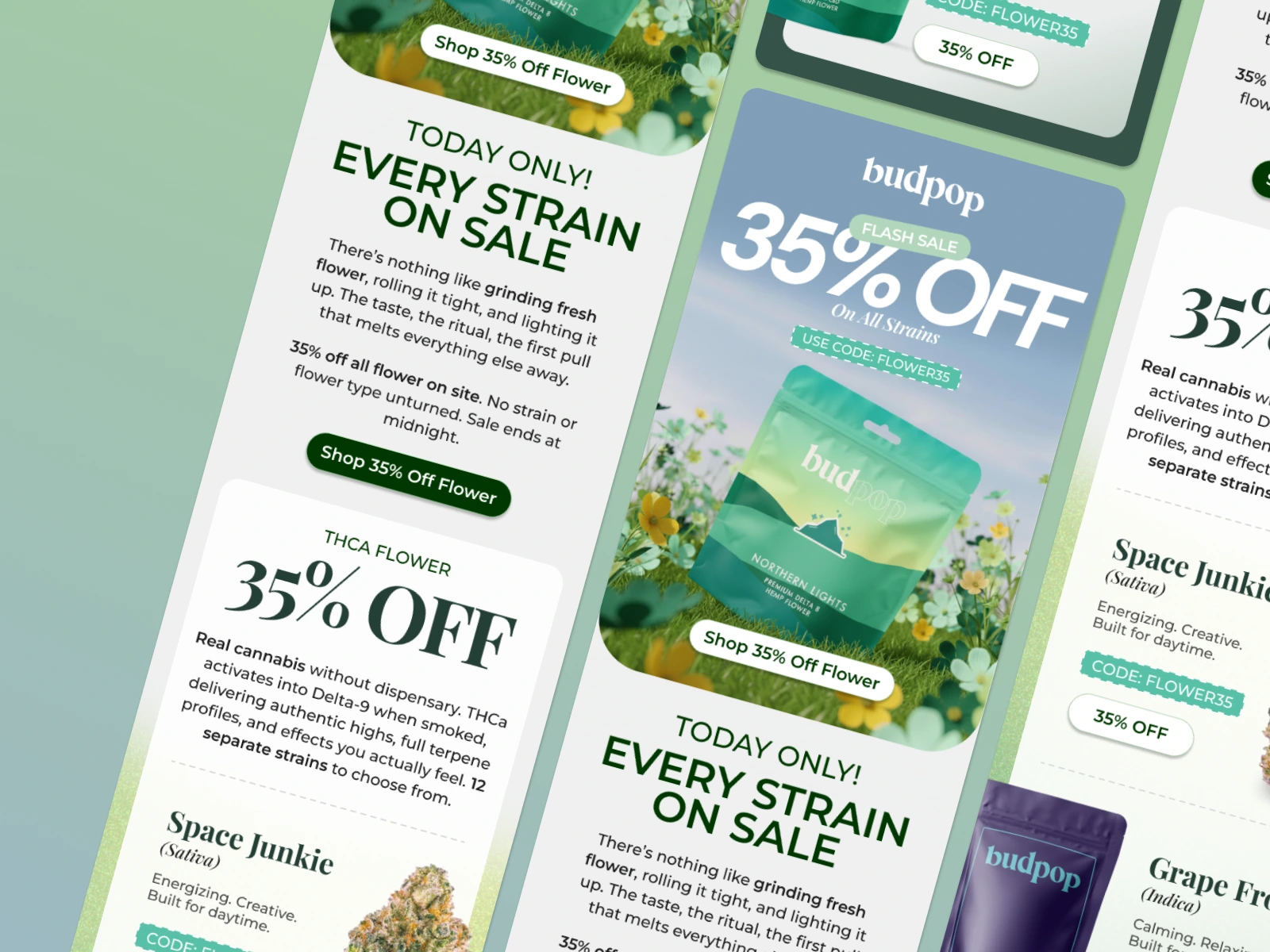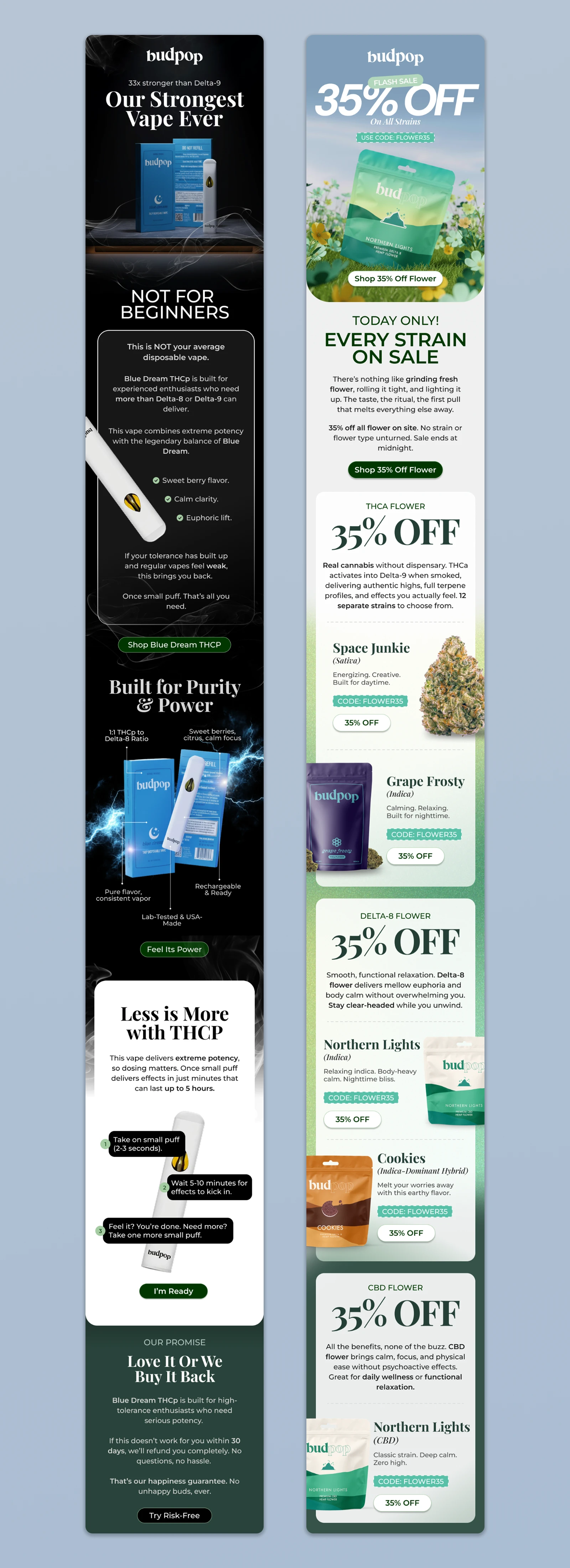 Budpop is a fast-growing e-commerce brand in the wellness and vape space. I was brought in to design marketing emails that aligned with their evolving visual direction, specifically a shift toward a more premium, 3D, product-forward look while remaining clear and effective in email.