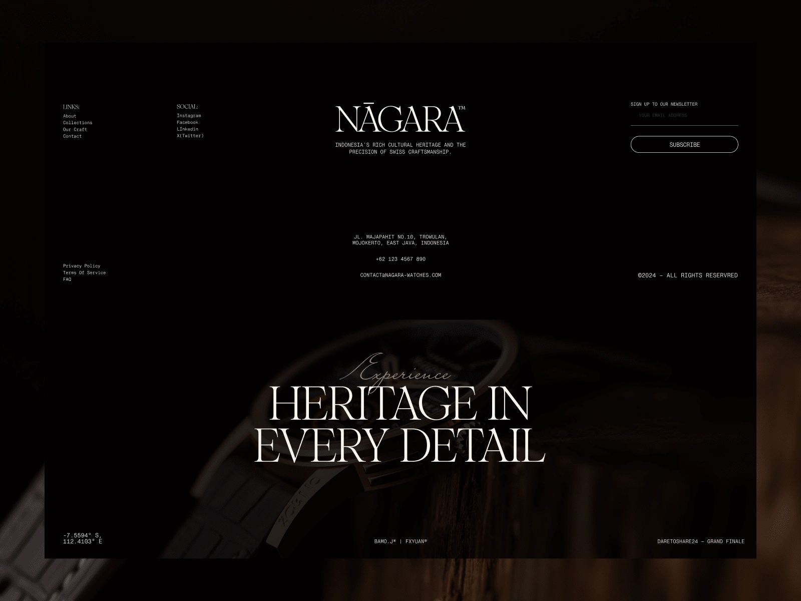 Nagara Timepieces is a luxury watch brand that fuses the precision of Swiss watchmaking with the profound cultural heritage of the Majapahit Empire. Each watch is an eulogy to the artistic and historical legacy of Majapahit, meticulously crafted to reflect its grandeur and elegance.