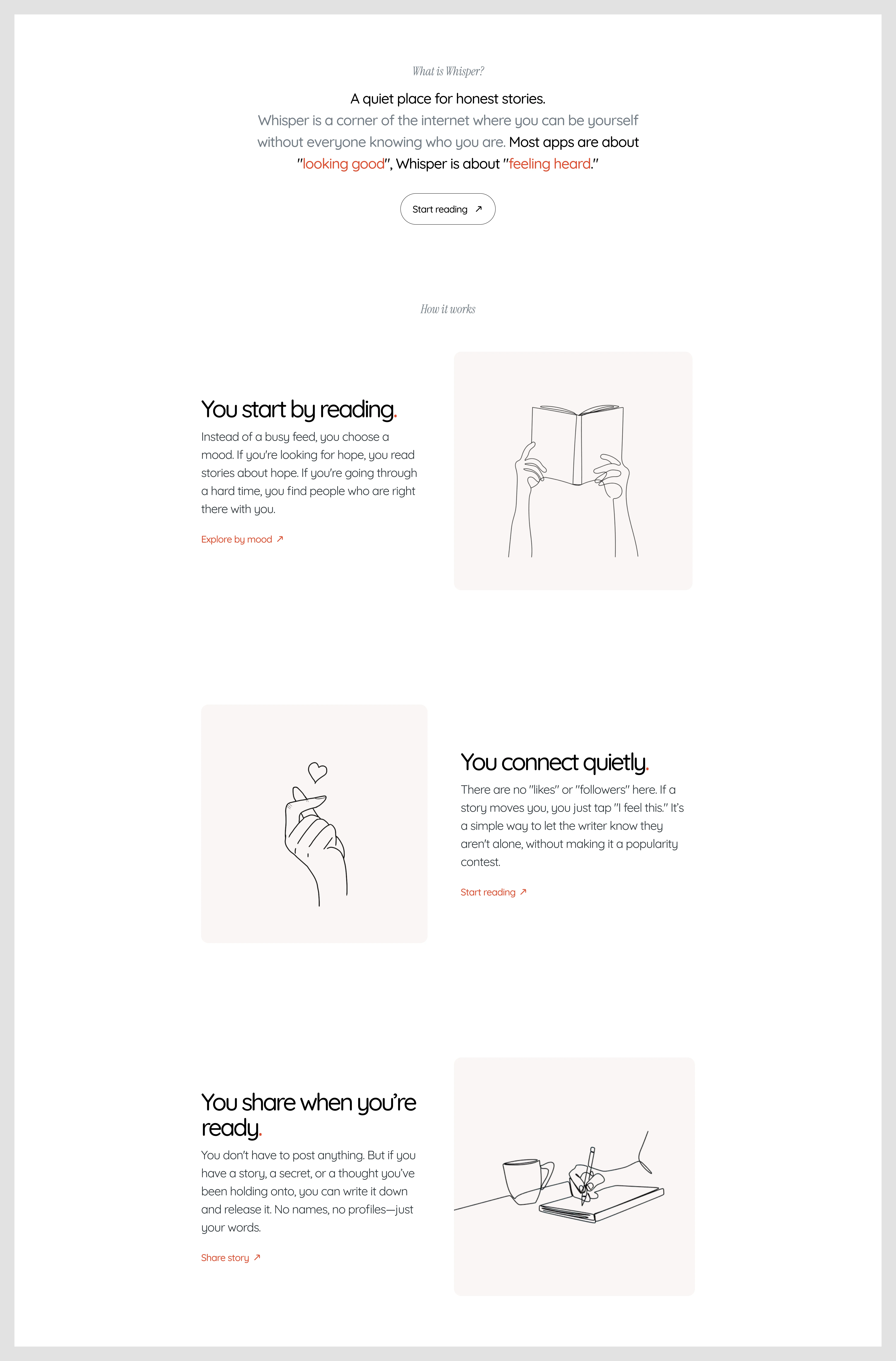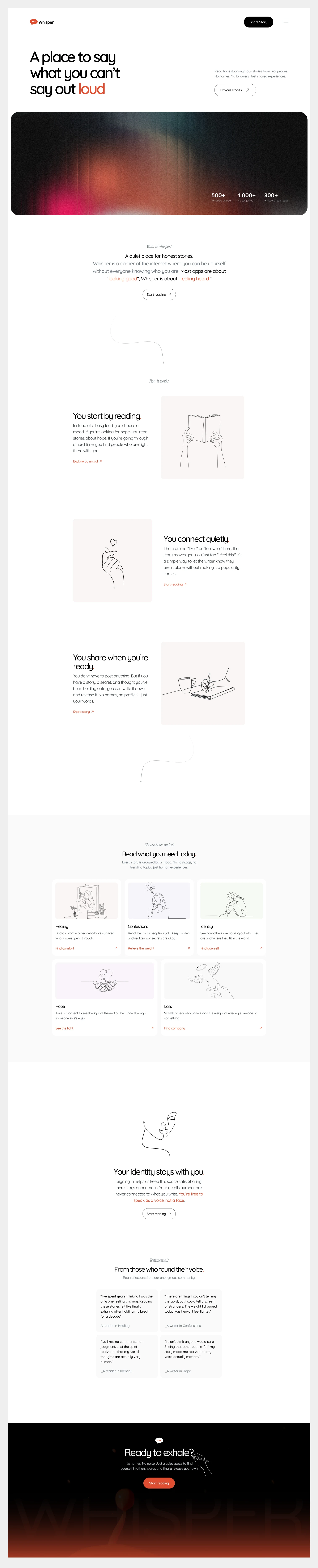Social media today is loud and performative. For people going through loss, healing, or major life changes, that noise can feel overwhelming. Whisper was designed to feel like a quiet room; safe, minimal, and personal.