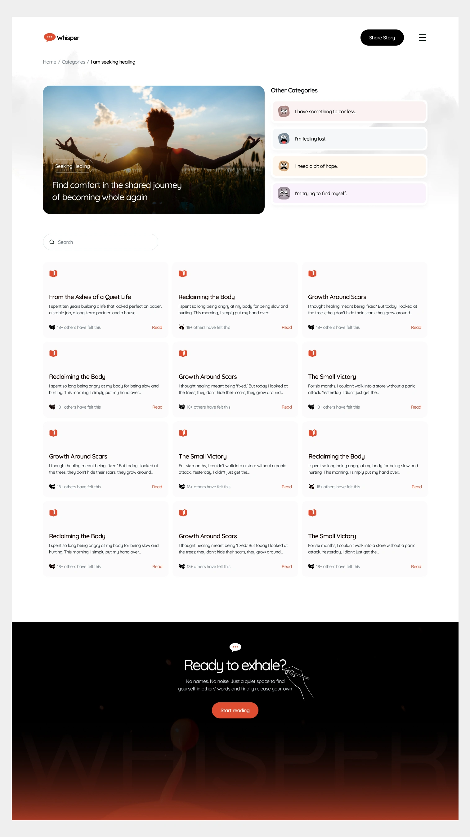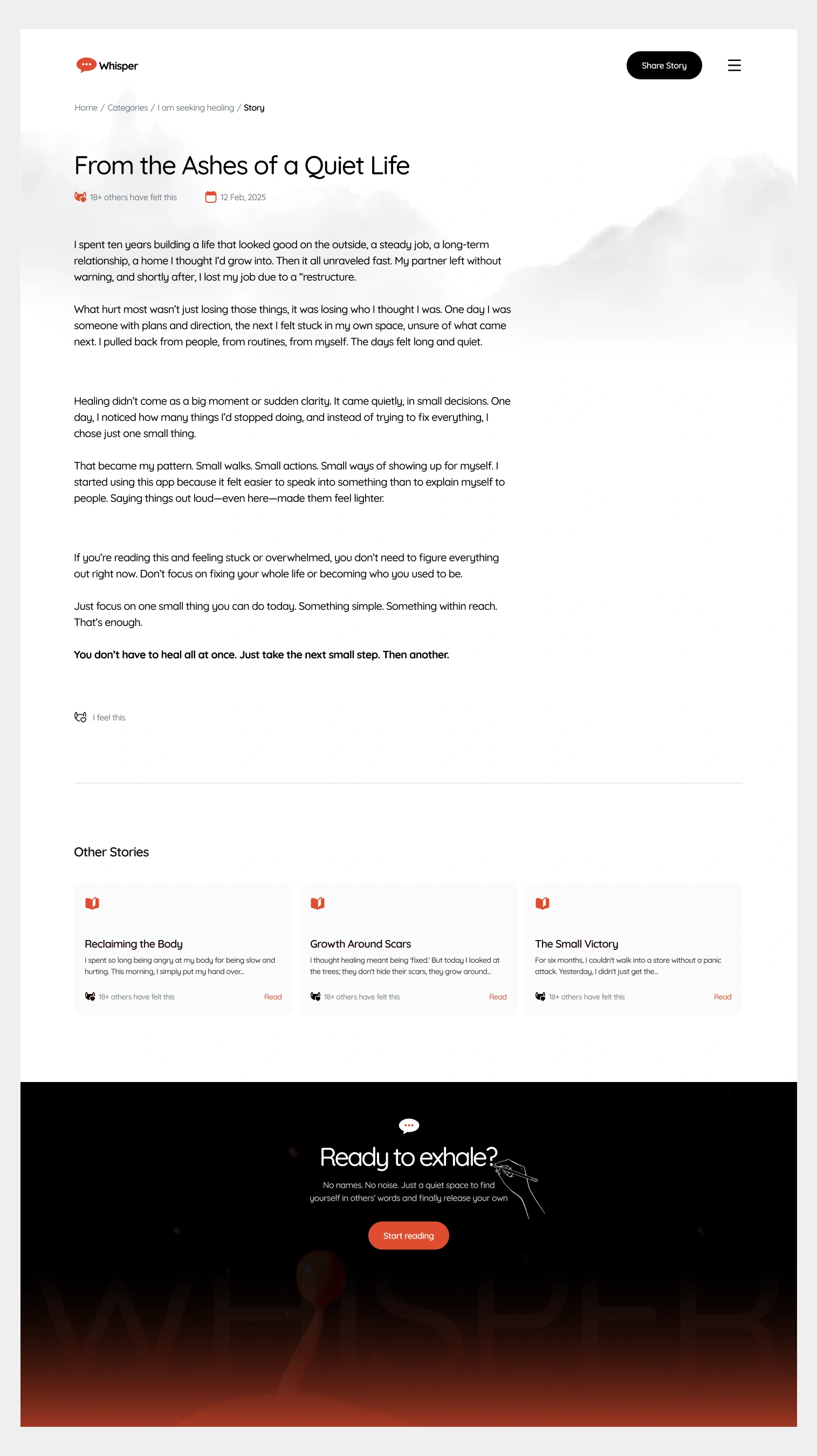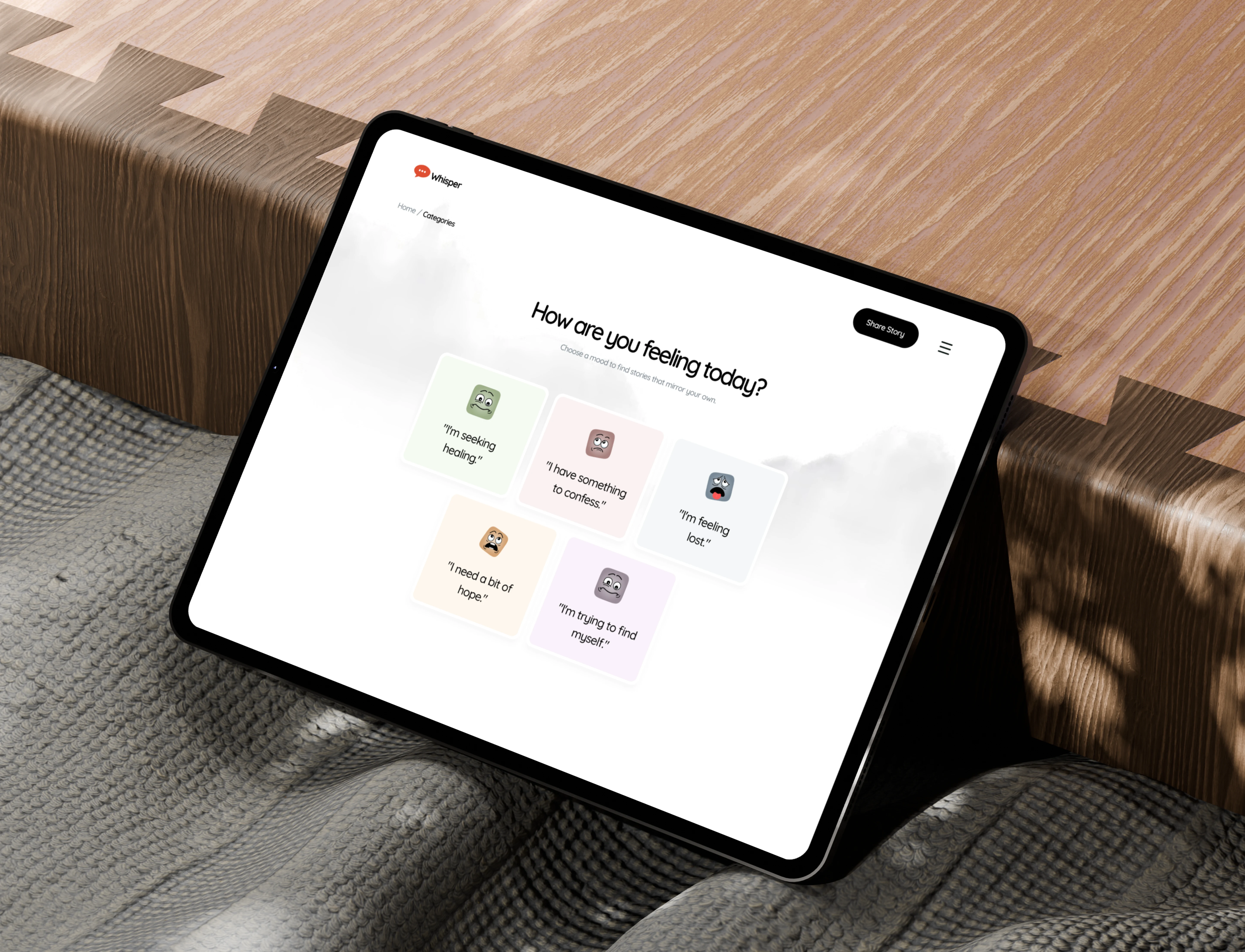 Whisper is a human-centered digital sanctuary designed for people going through life transitions like loss, healing, and self-rediscovery.