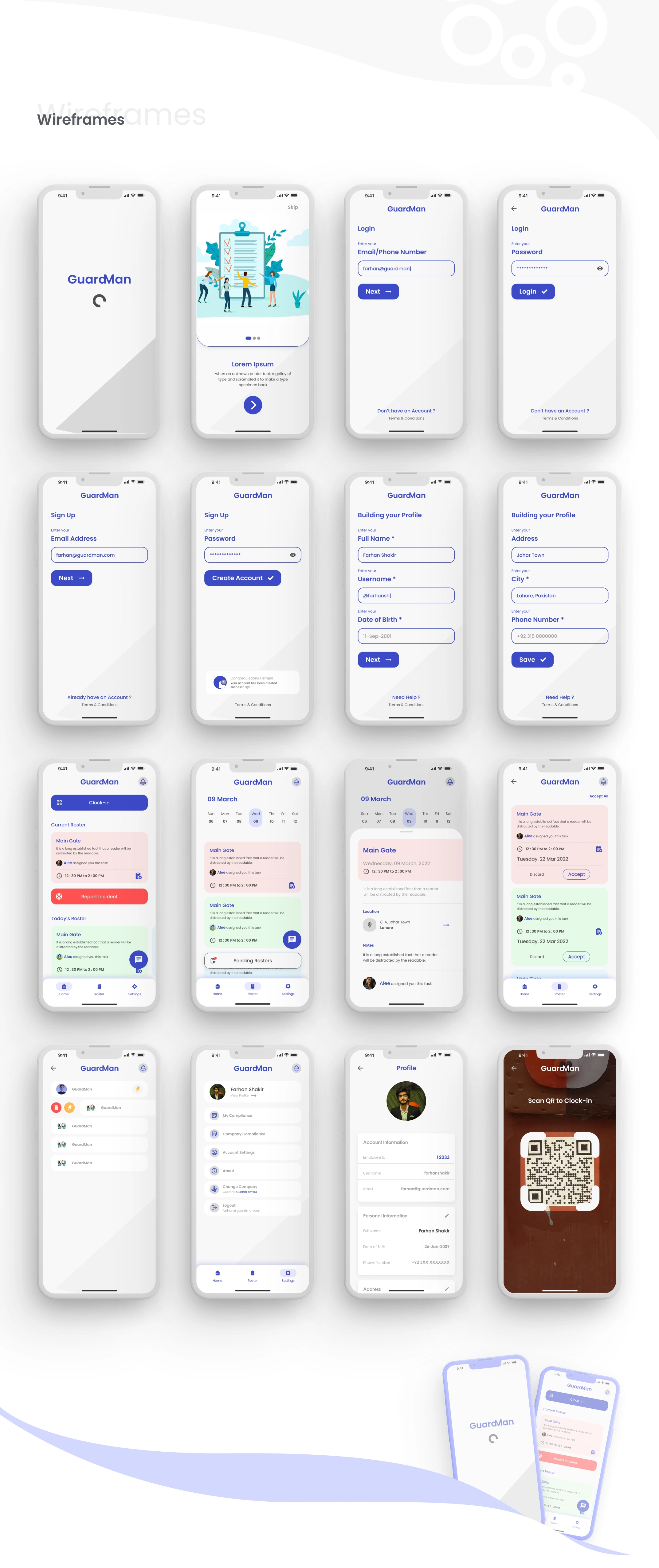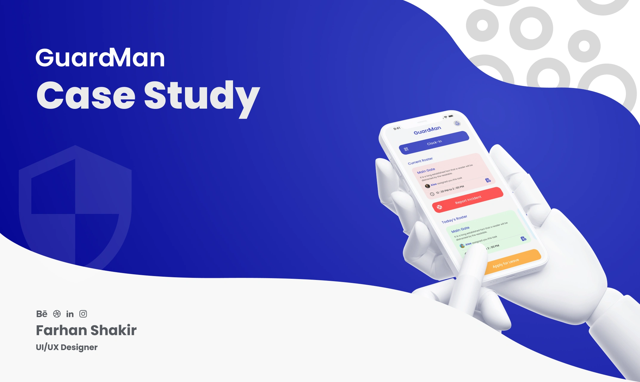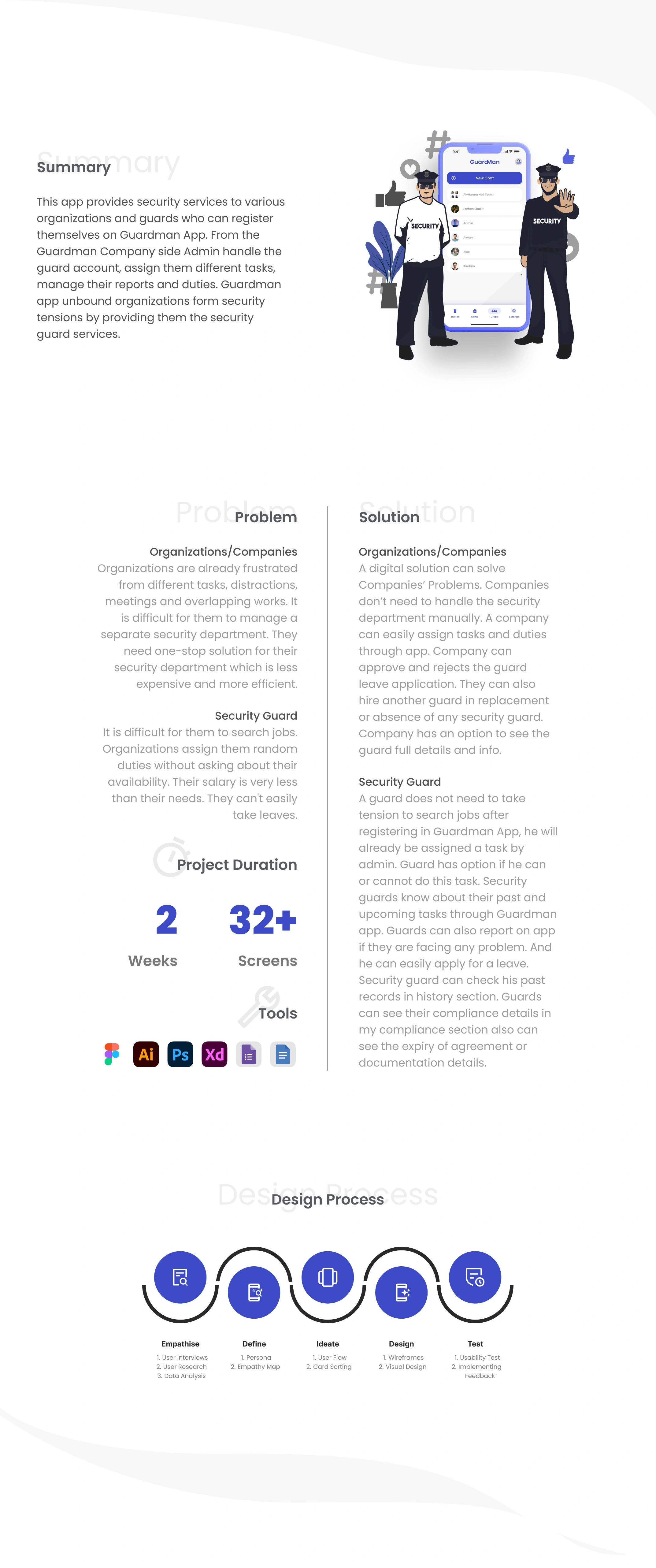 GuardMan provides security services. Guards register via app, while admins manage accounts, assign tasks, and handle reports from the company side.
