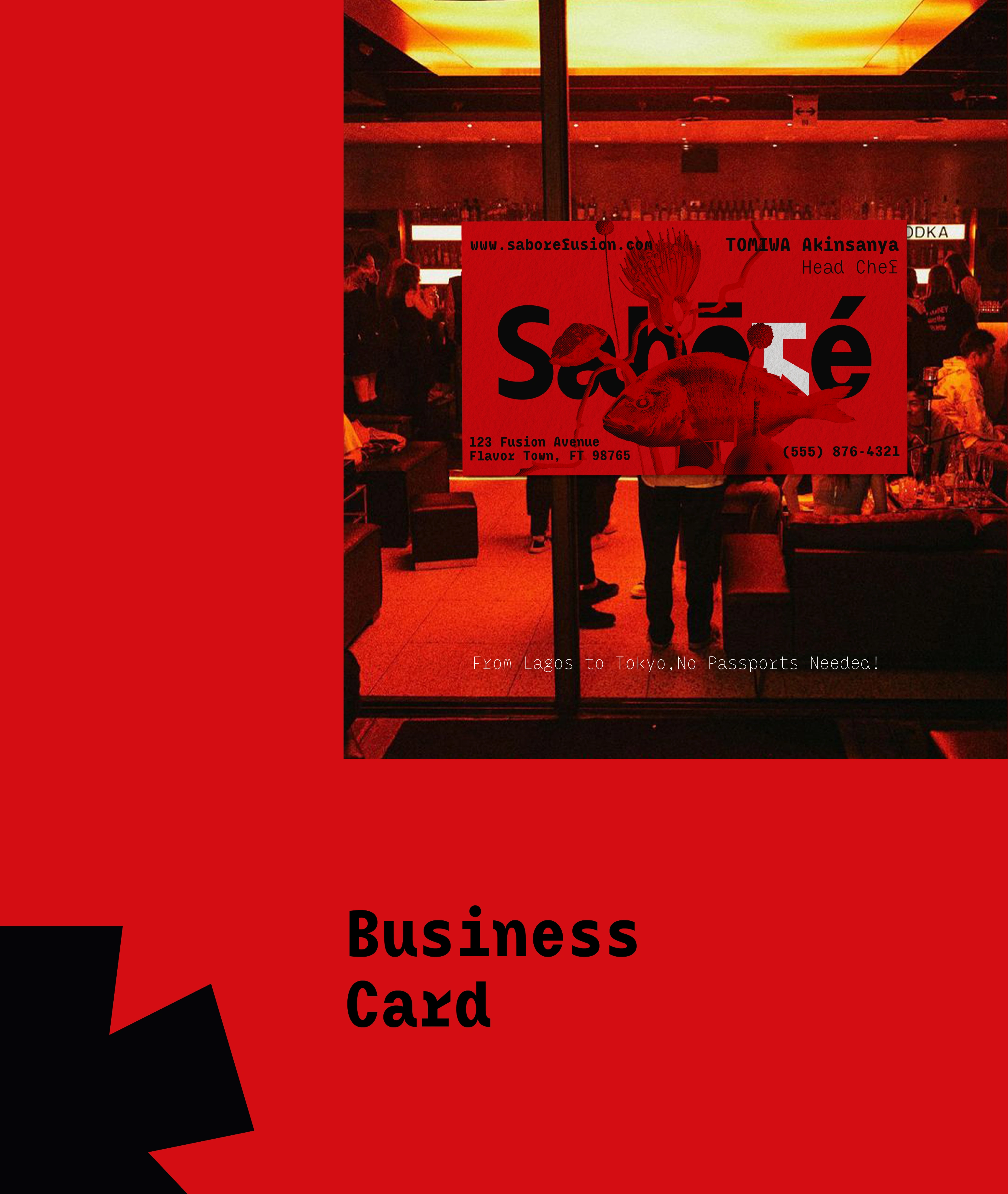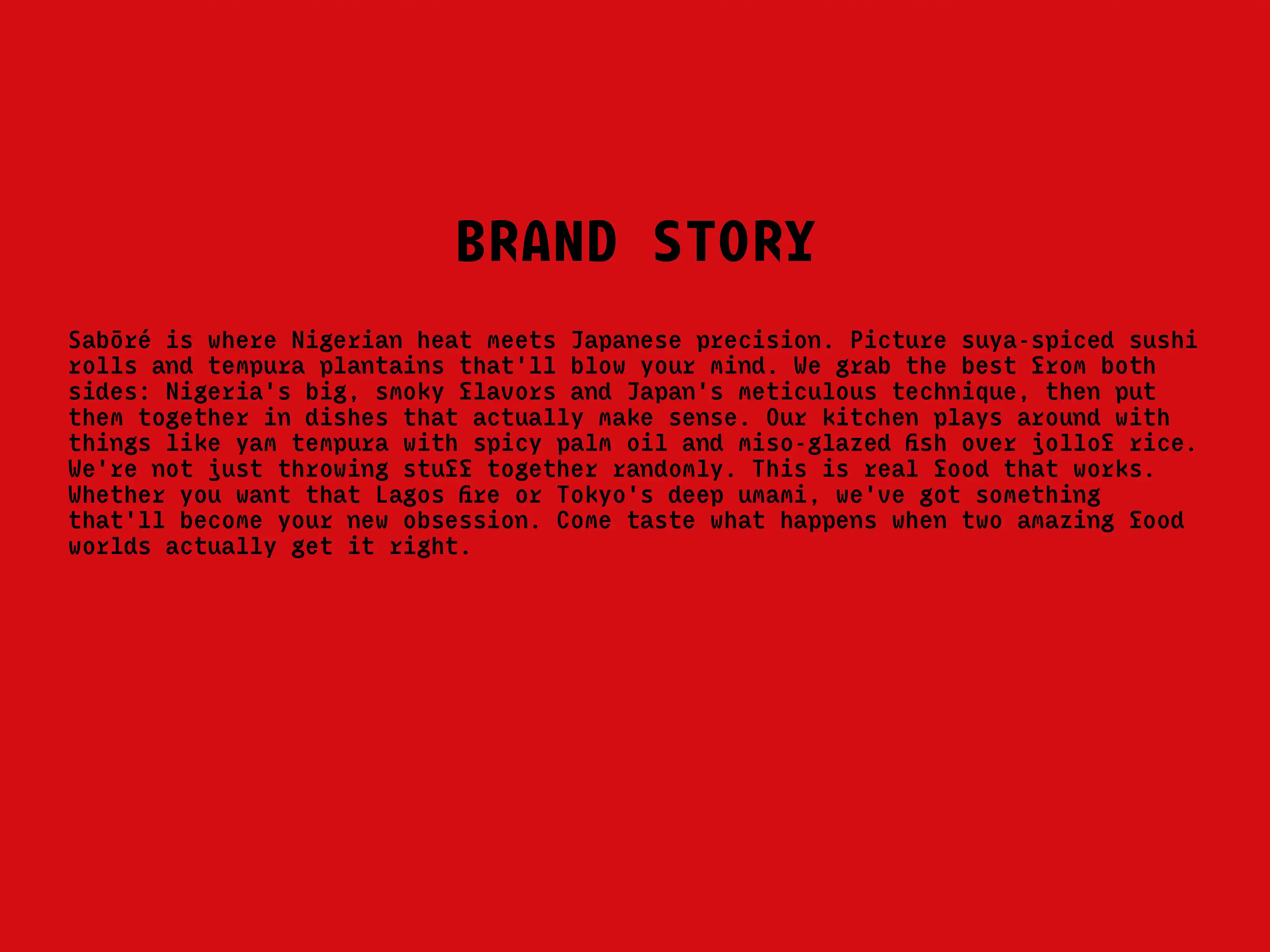 Designed brand identity for Nigerian-Japanese fusion restaurant, using deconstructed food visuals and balanced design to merge two distinct culinary traditions.