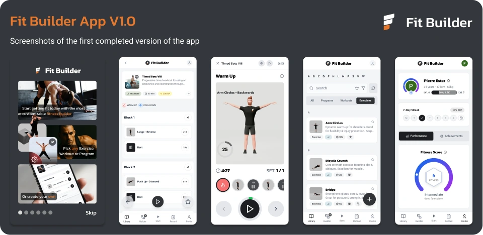 Fit Builder is a modular fitness app which gives users the ability to create custom exercises, workouts, and programs. Other core features include progress tracking, personal record with journal, custom quick workouts and a growing Library with 70+ exercises, +80 workouts, and 4 training programs based on real 10-week programs used to train high-performance athletes and the military. It has partial offline support, themes, dark mode, and comes in a web version (accessible for all devices) and mobile version, for Android. No sign-up or credit card is required for guest users, and premium subscribers have access to all features.