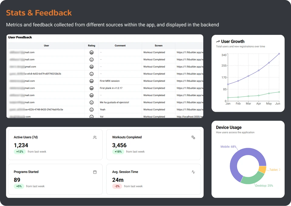 To monitor metrics, different sources exist in the app and externally: the custom-made analytics dashboard in the admin backend, Microsoft Clarity, Google Analytics, and Google Play Console.