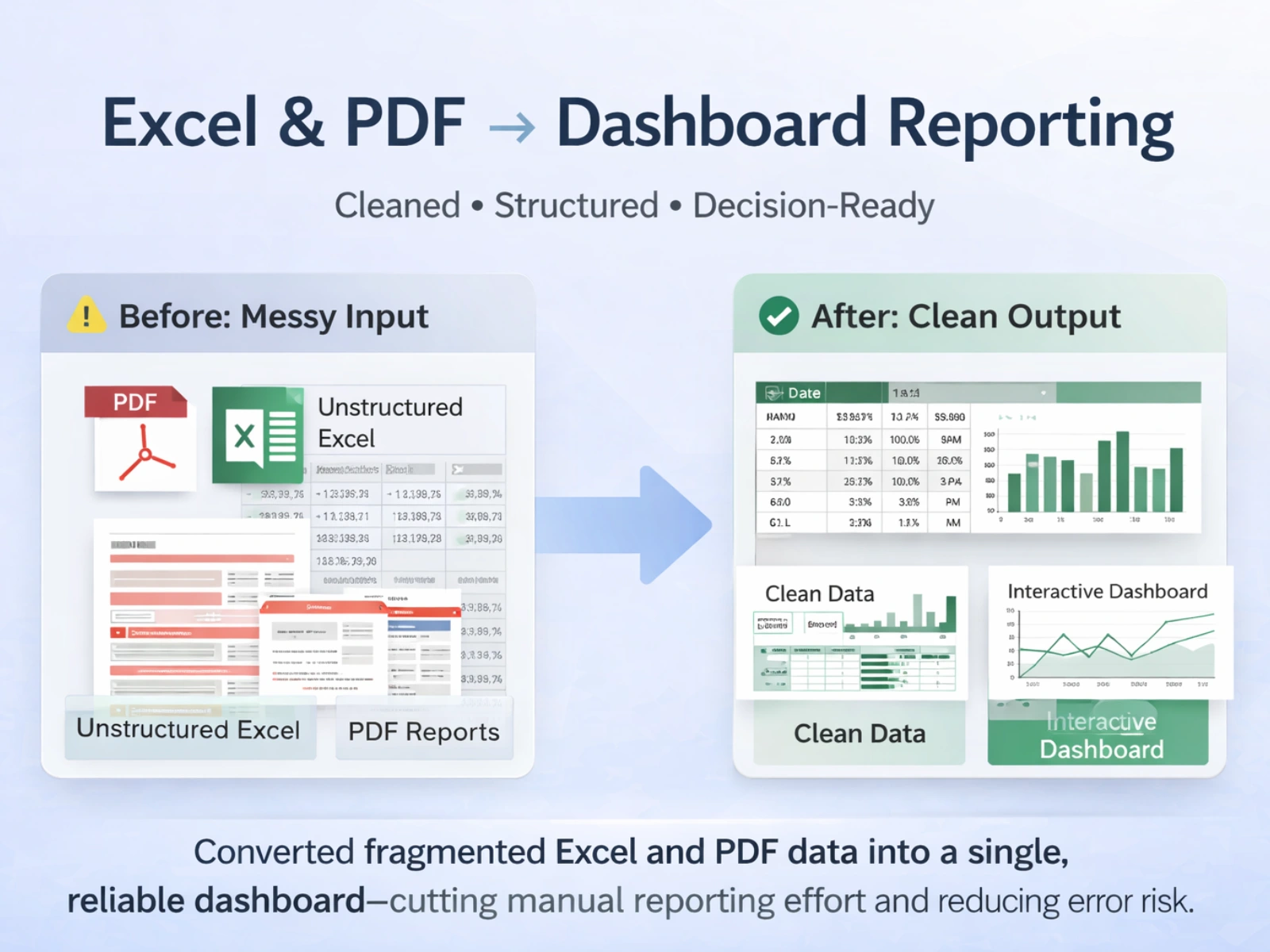 Converted fragmented Excel and PDF data into a single, reliable dashboard—cutting manual reporting effort and reducing error risk.