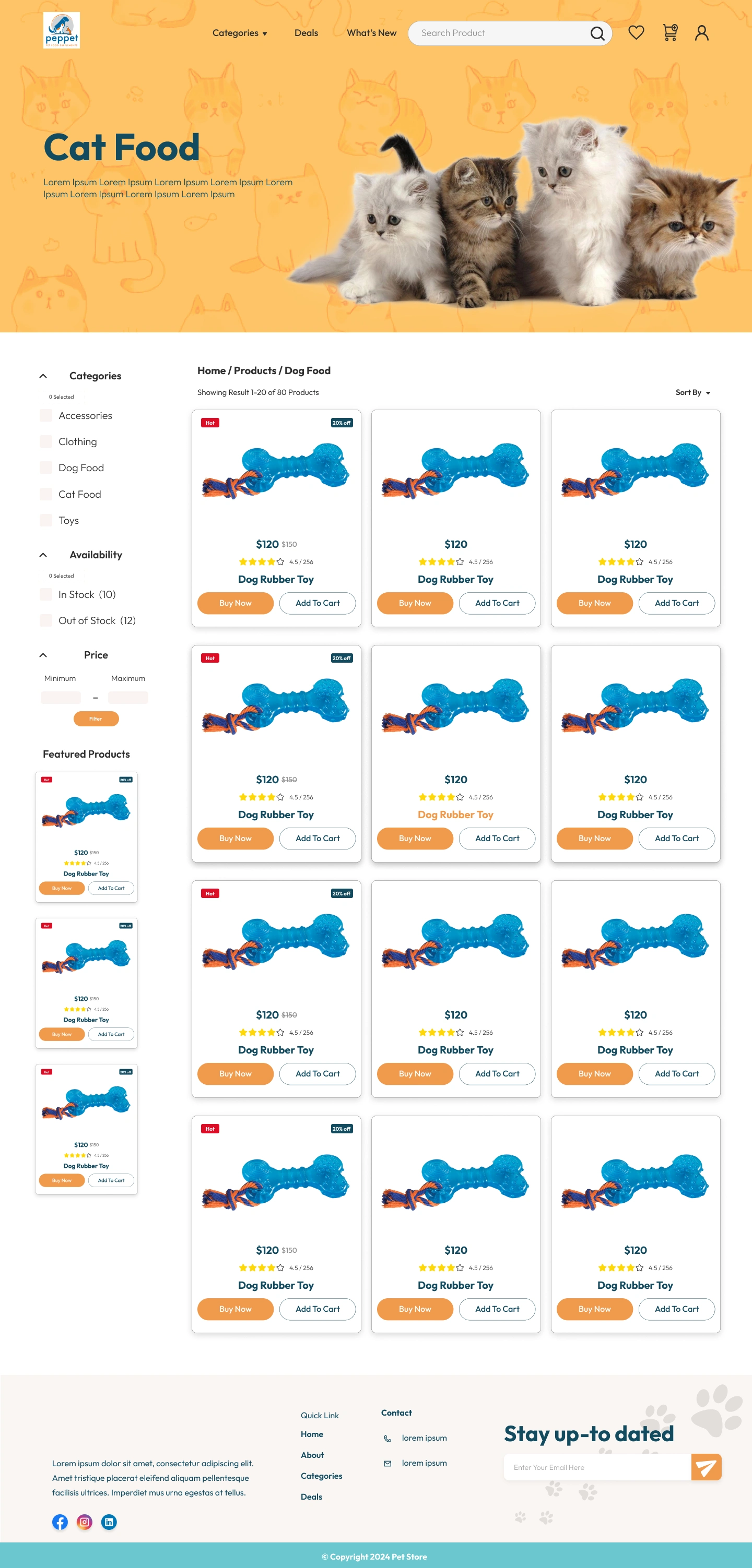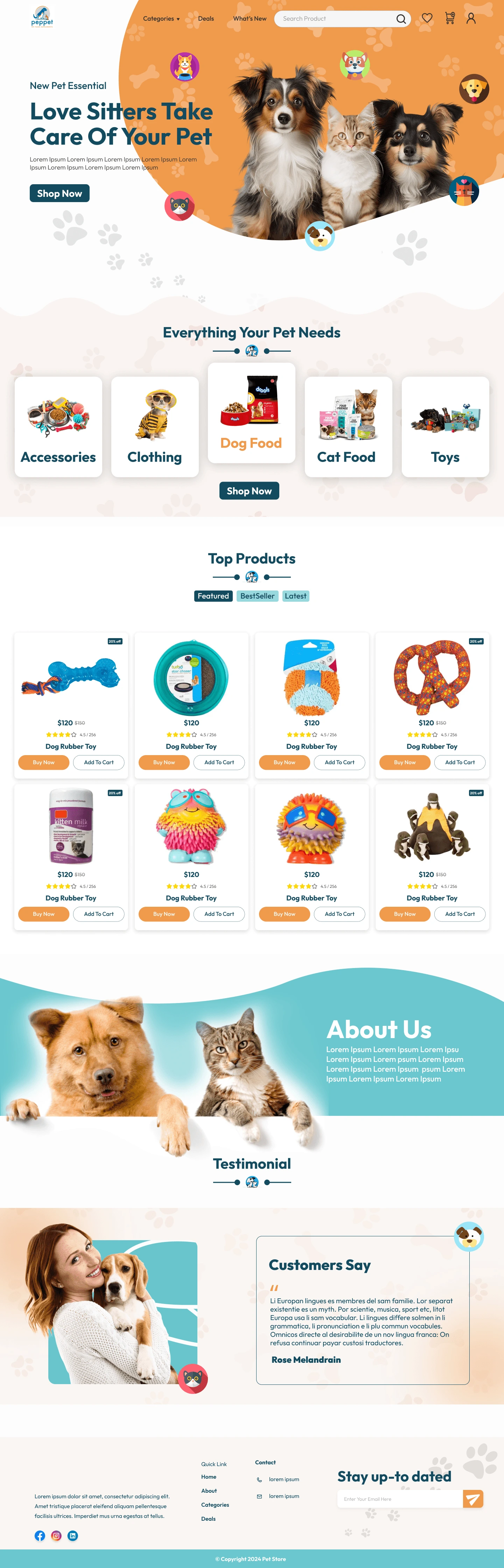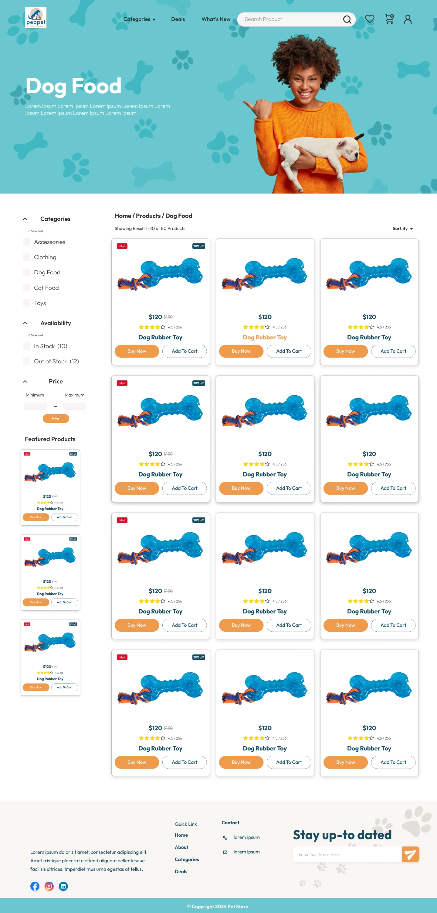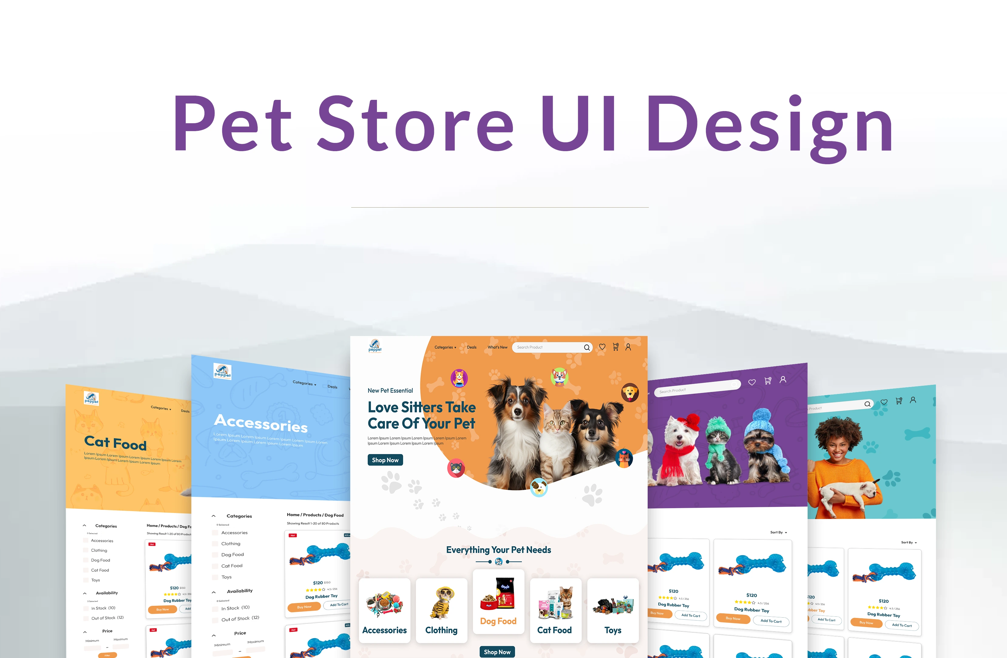 Colorful and lively UI design for a pet essentials website that captures the playful spirit of pets. The layout includes bright colours and engaging visuals.