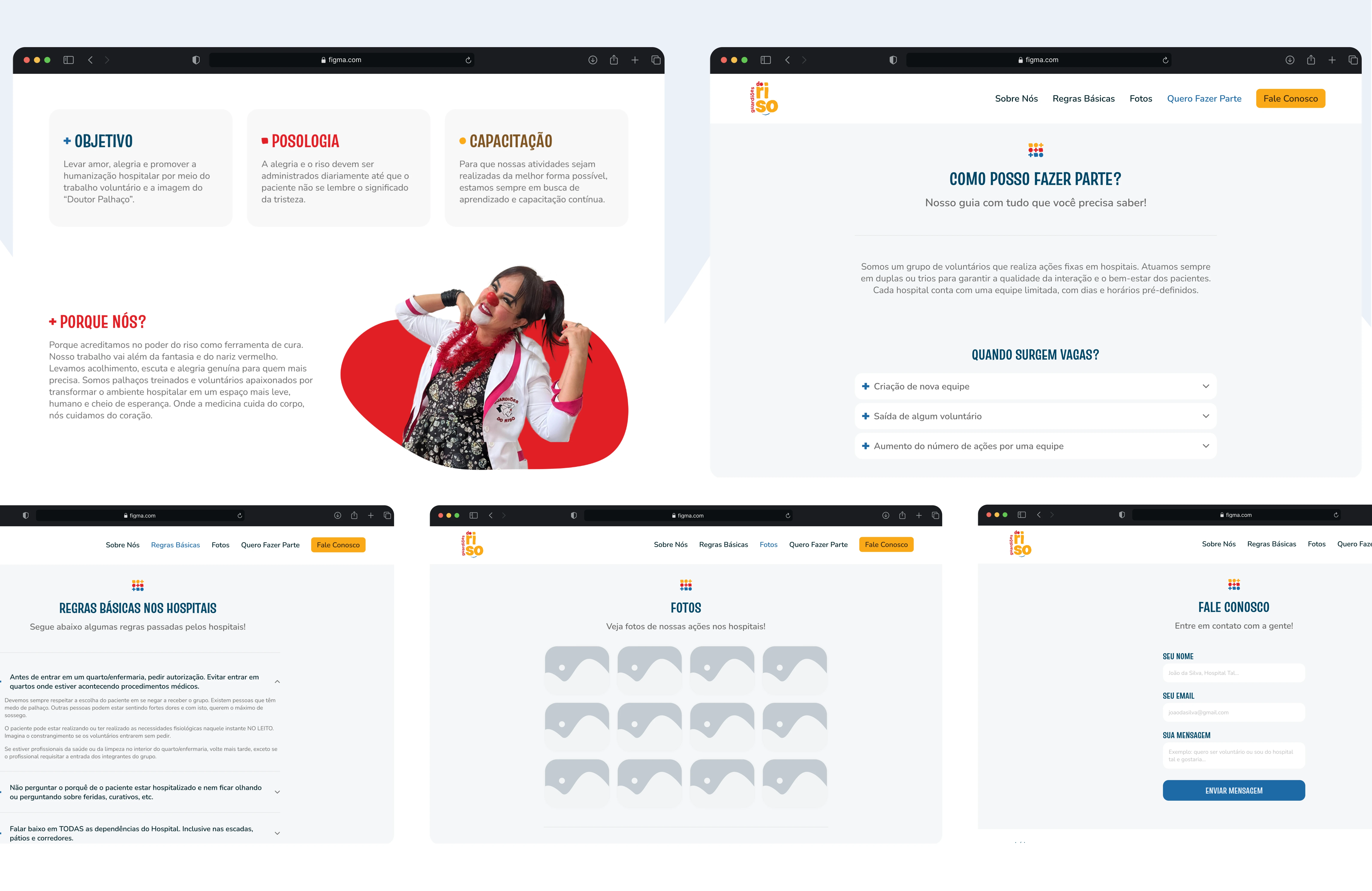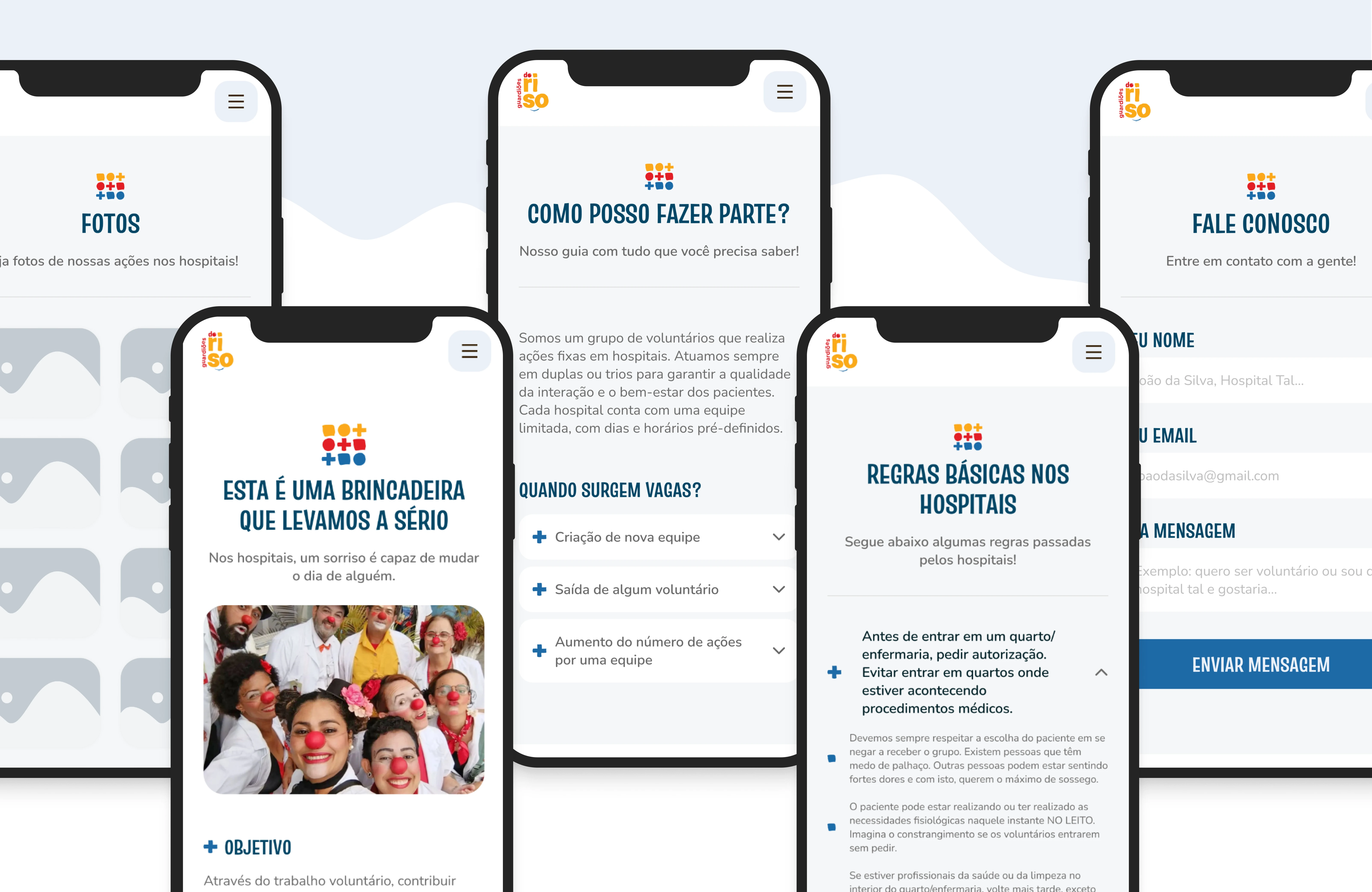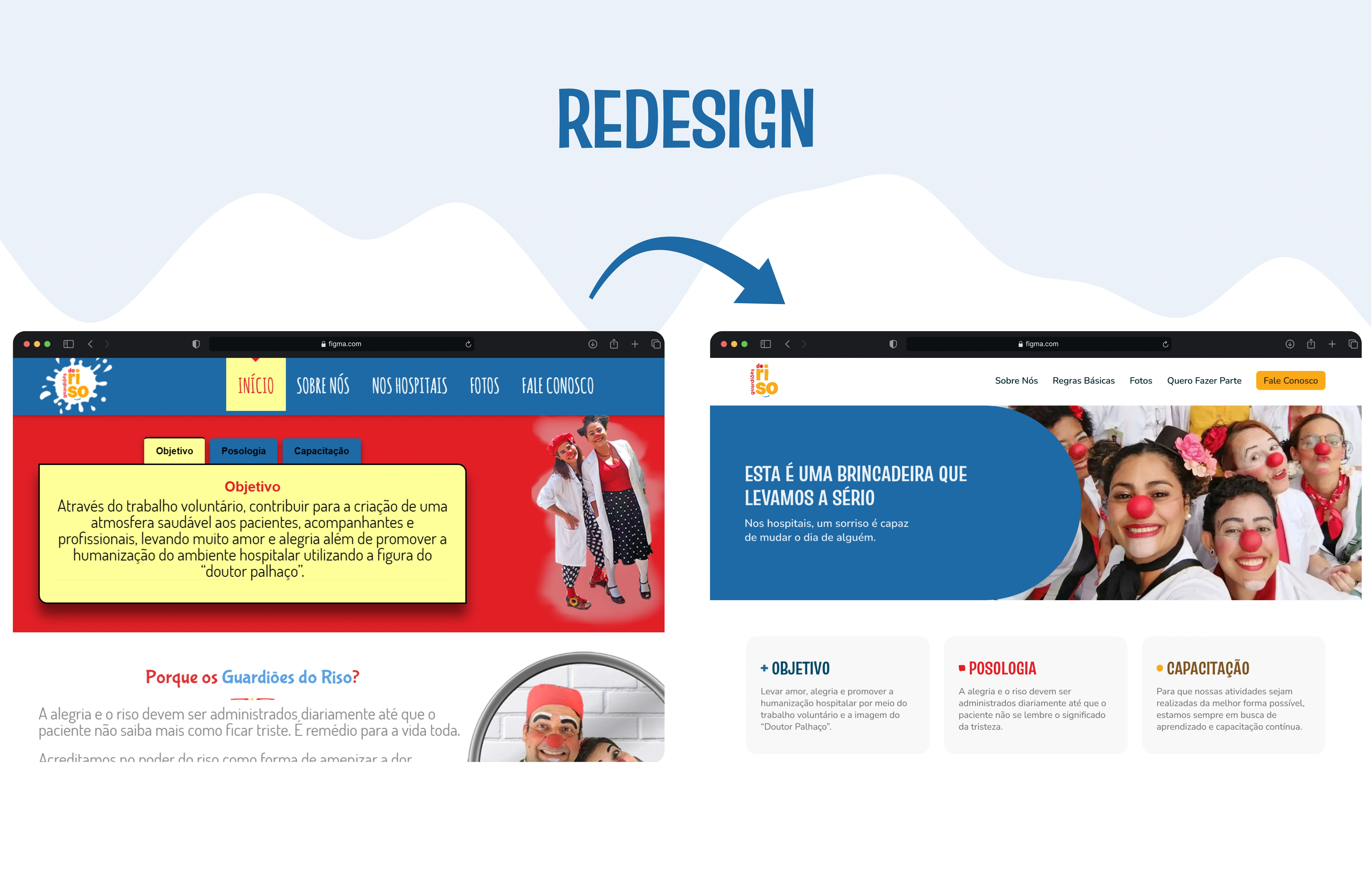 O grupo de voluntários Guardiões do Riso possui um site que, precisando ser reformulado, por não ser responsivo no mobile, teve um redesign completo, baseando-se nas cores da logotipo, o tom divertido, mas mantendo o profissionalismo, por ser um projeto sério.