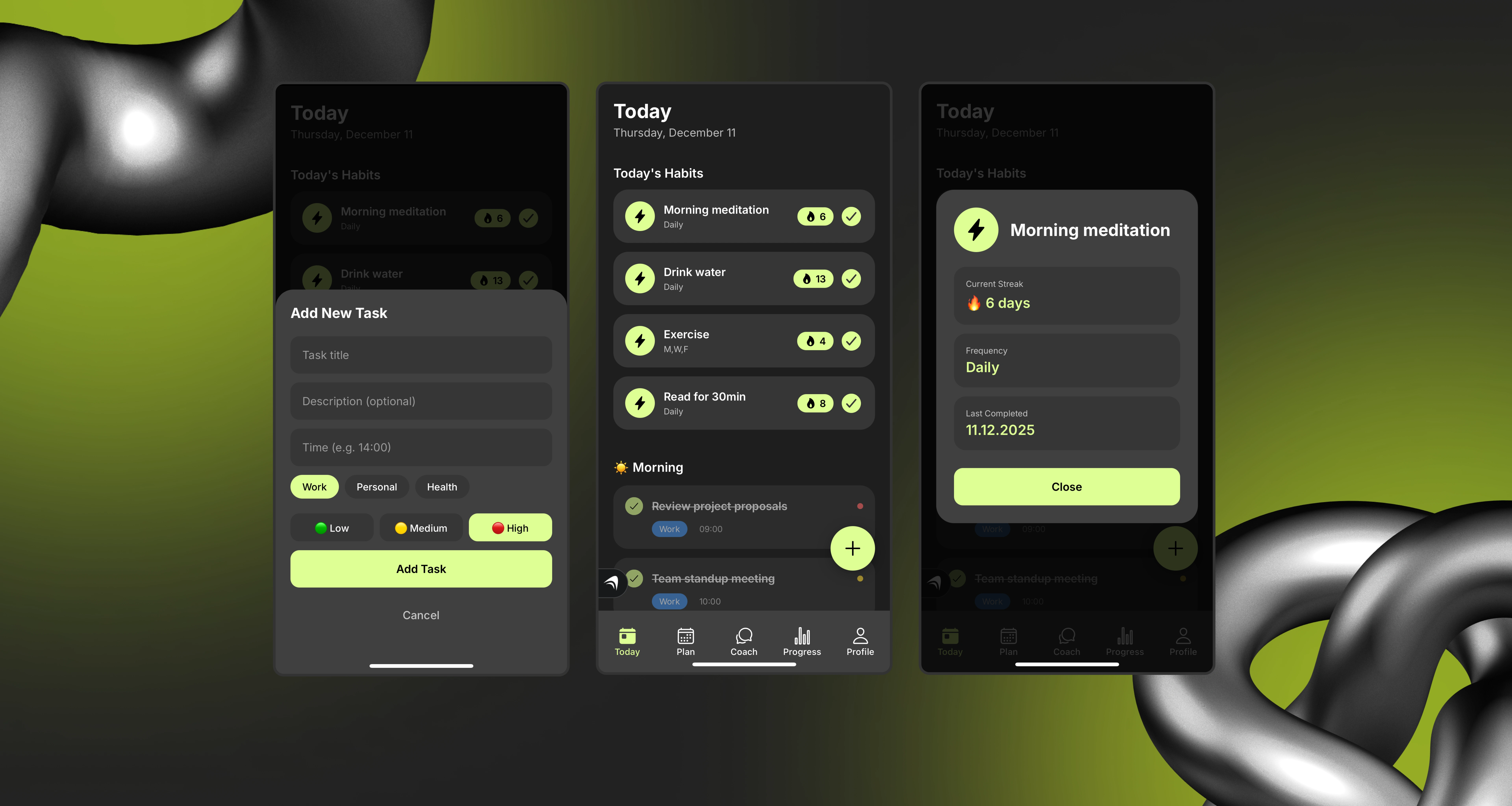 Component system (TaskCard, HabitCard, Timeline, Coach bubbles, etc.)