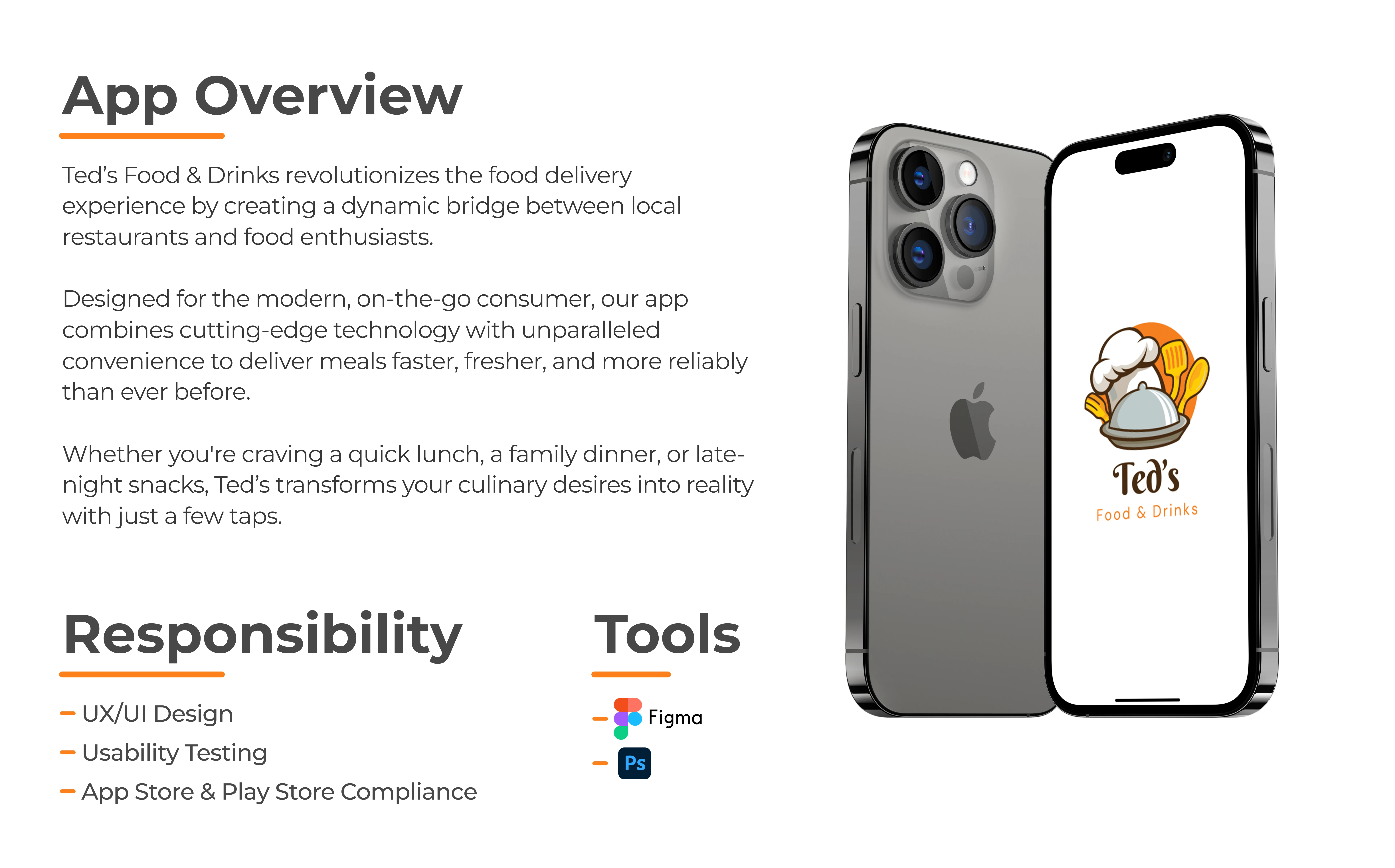Ted's Food & Drinks is a seamless app for ordering global cuisines from local eateries, with real-time tracking and personalized recommendations.