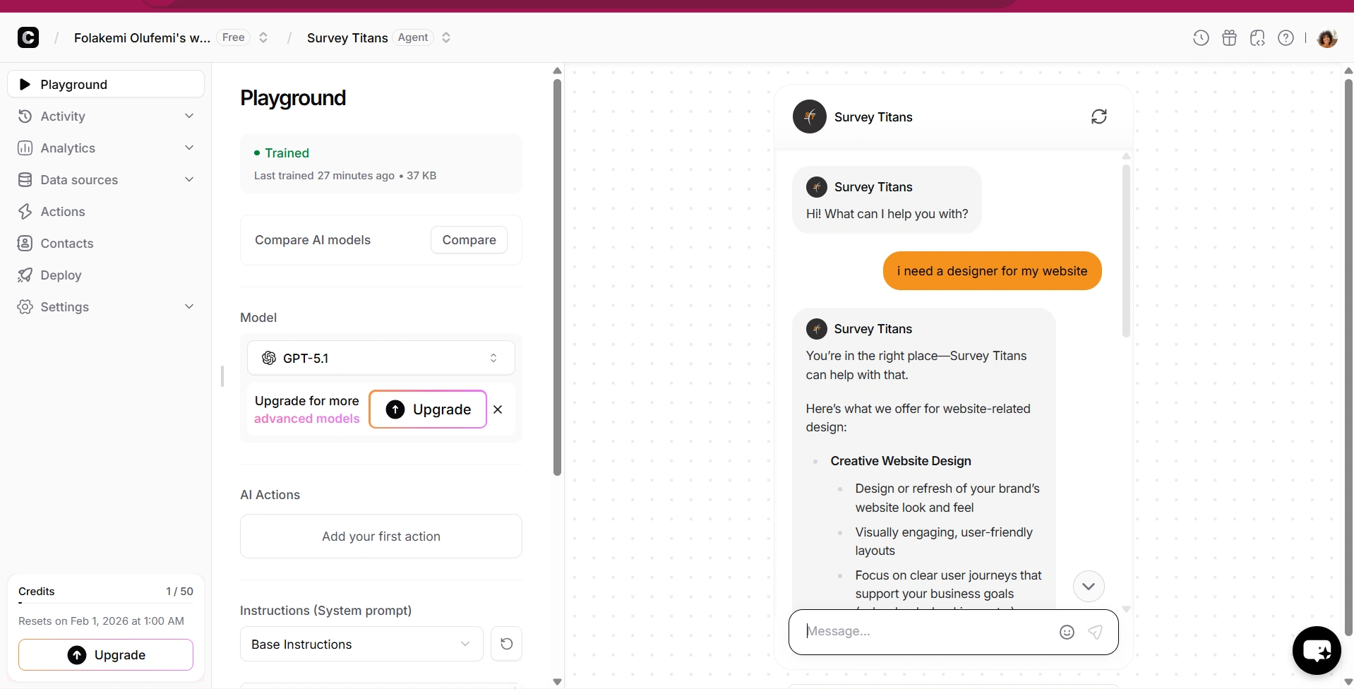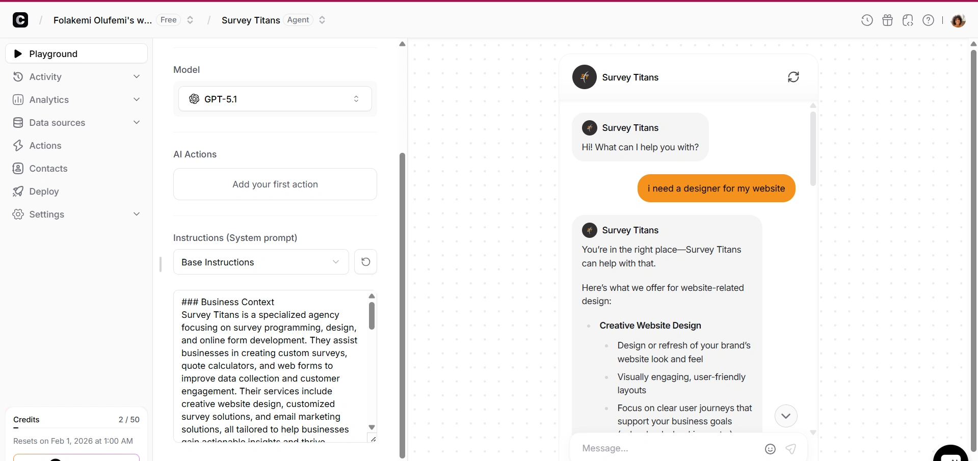 I built a custom-trained AI agent for Survey Titans using Chatbase to automate 24/7 respondent support and streamline survey creation inquiries. The agent now handles Tier-1 support tickets autonomously, allowing the core team to focus on high-value enterprise clients.