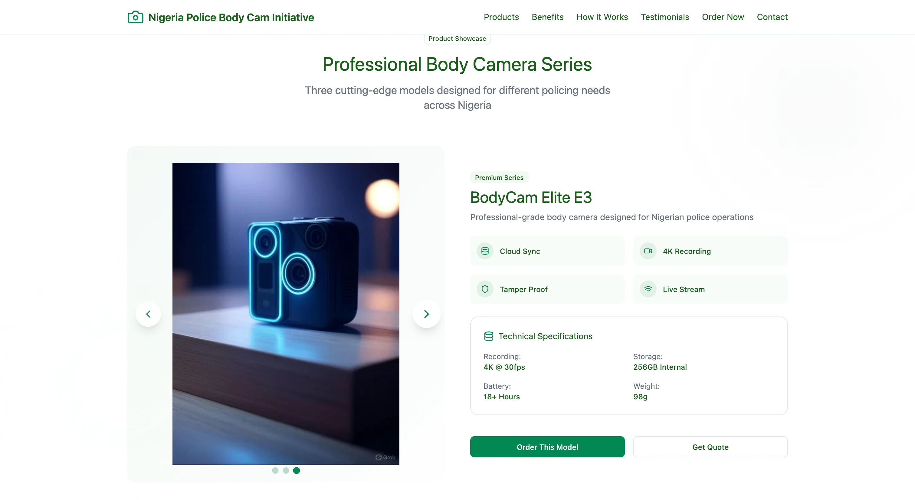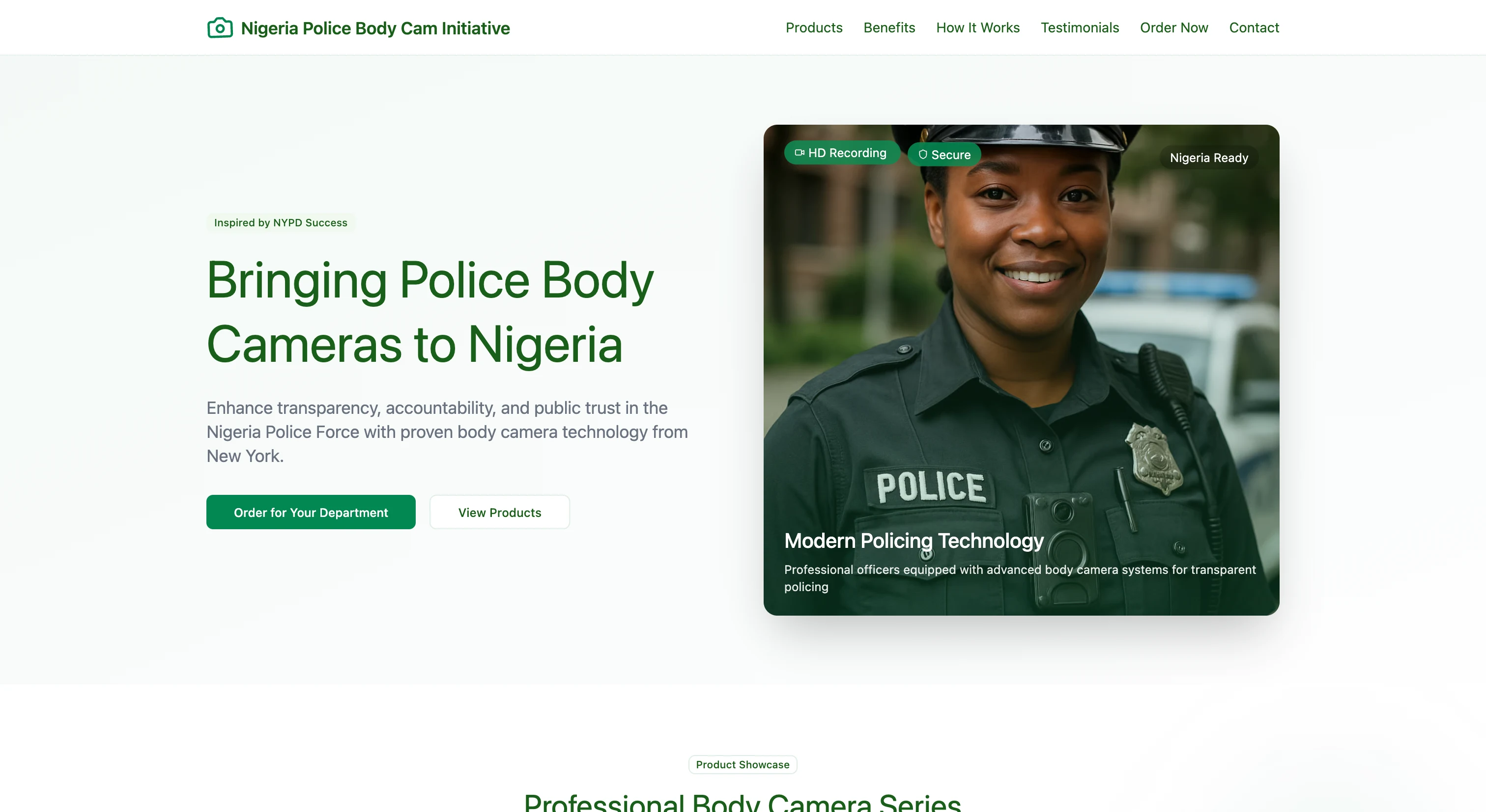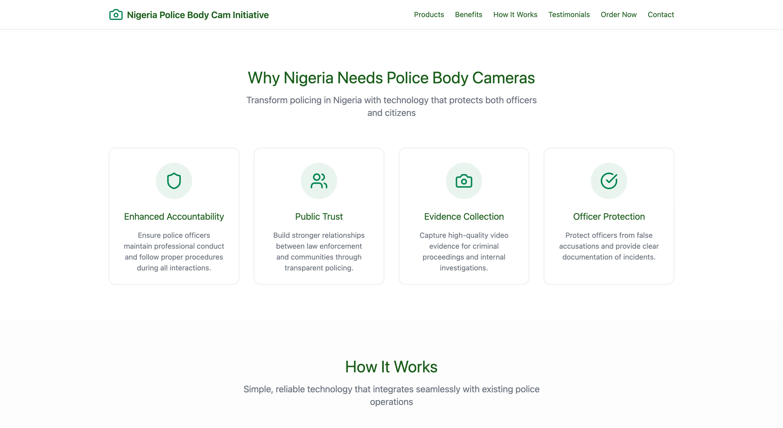 The platform aims to educate the public about Nigeria’s emerging body camera initiative, highlighting its legal context, benefits (e.g., accountability, evidence), and challenges (like funding, data security). The goal: transform complex topics into accessible, trustworthy web content, blending strong UX, interactive visuals, and AI-generated narrative.