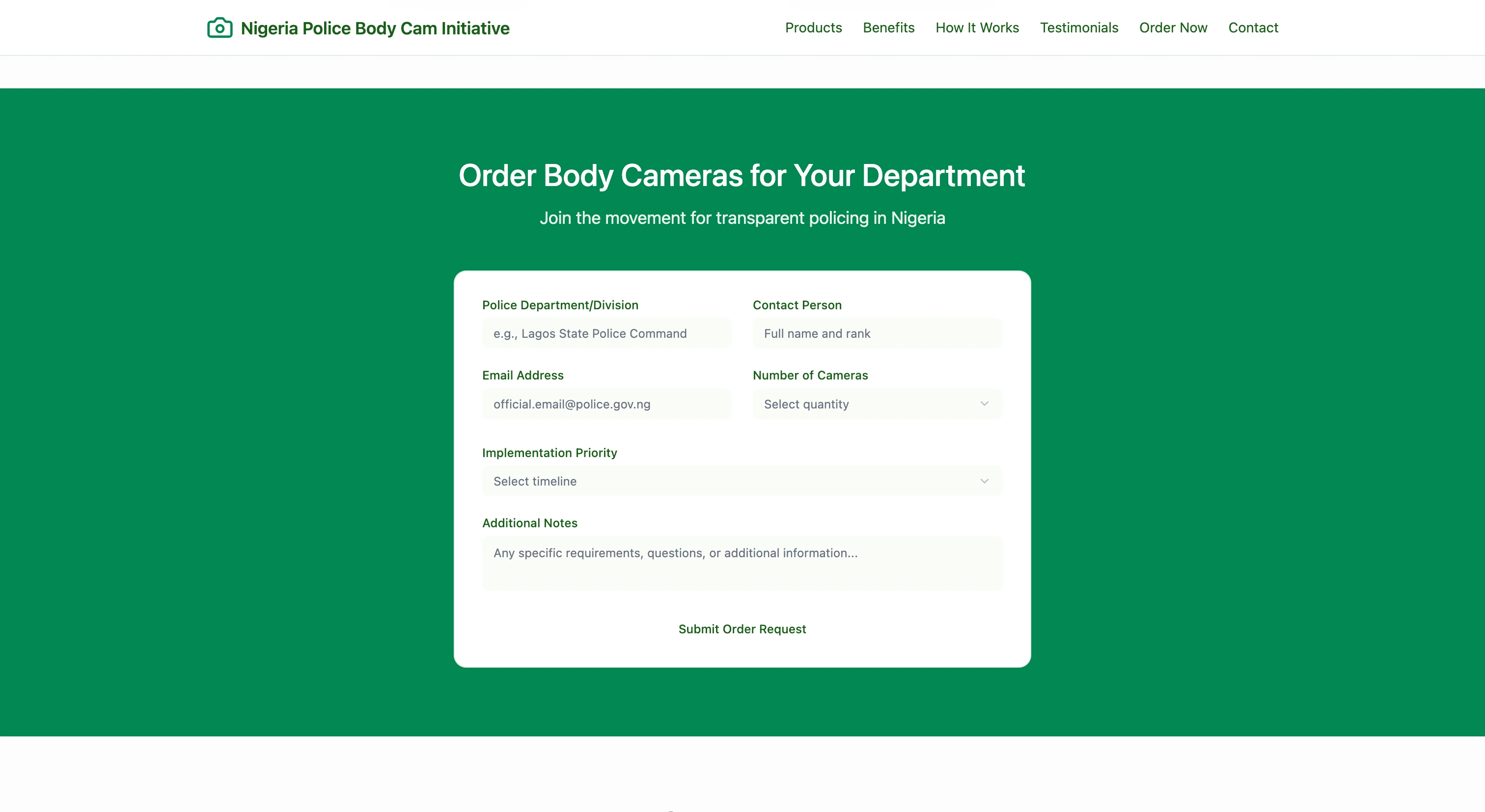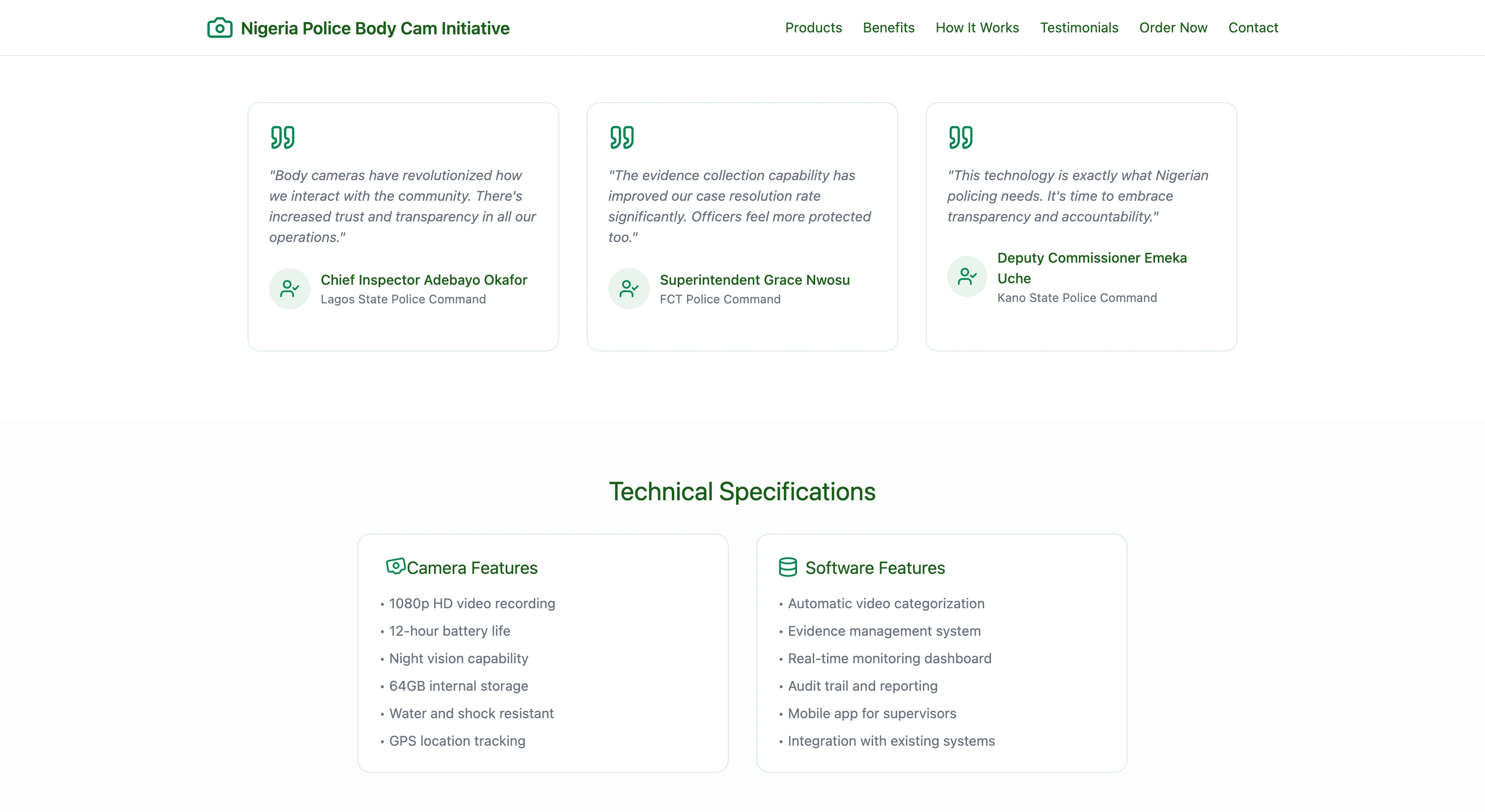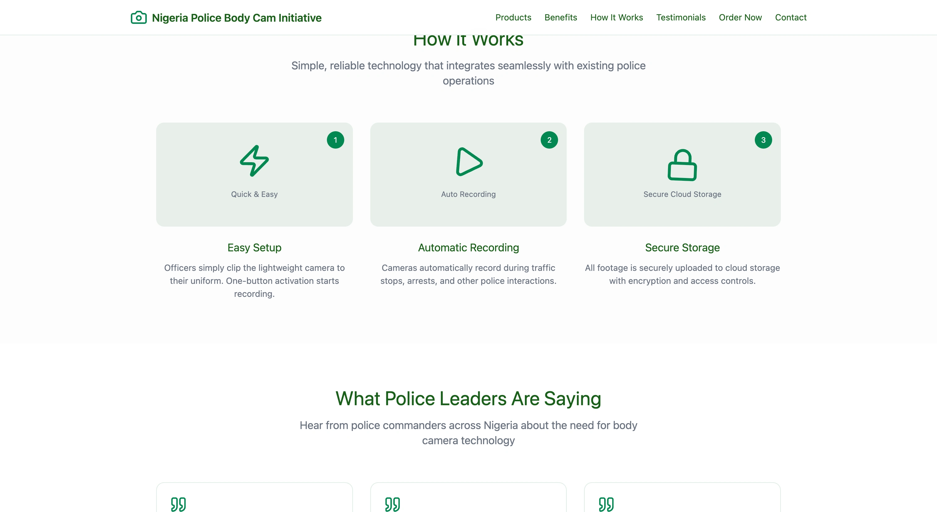 The platform aims to educate the public about Nigeria’s emerging body camera initiative, highlighting its legal context, benefits (e.g., accountability, evidence), and challenges (like funding, data security). The goal: transform complex topics into accessible, trustworthy web content, blending strong UX, interactive visuals, and AI-generated narrative.
