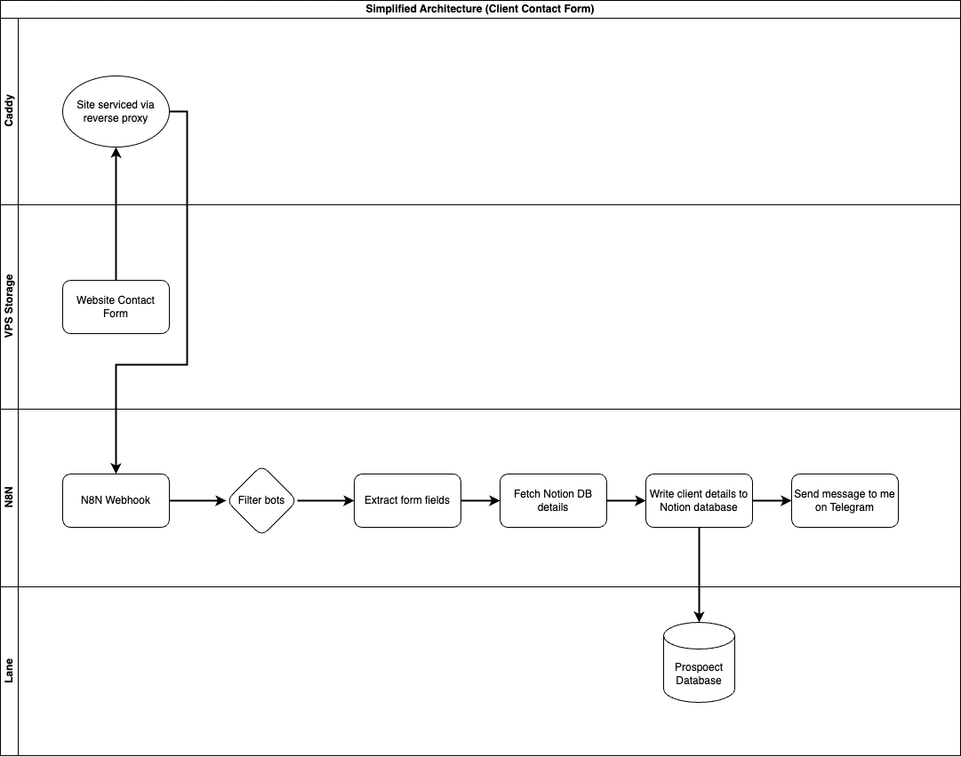 The system captures form submissions from my website, served through a Caddy reverse proxy on a private VPS, and routes them through an n8n webhook. Submissions are filtered for bots and spam, parsed into usable fields, and enriched with data from my Notion database.