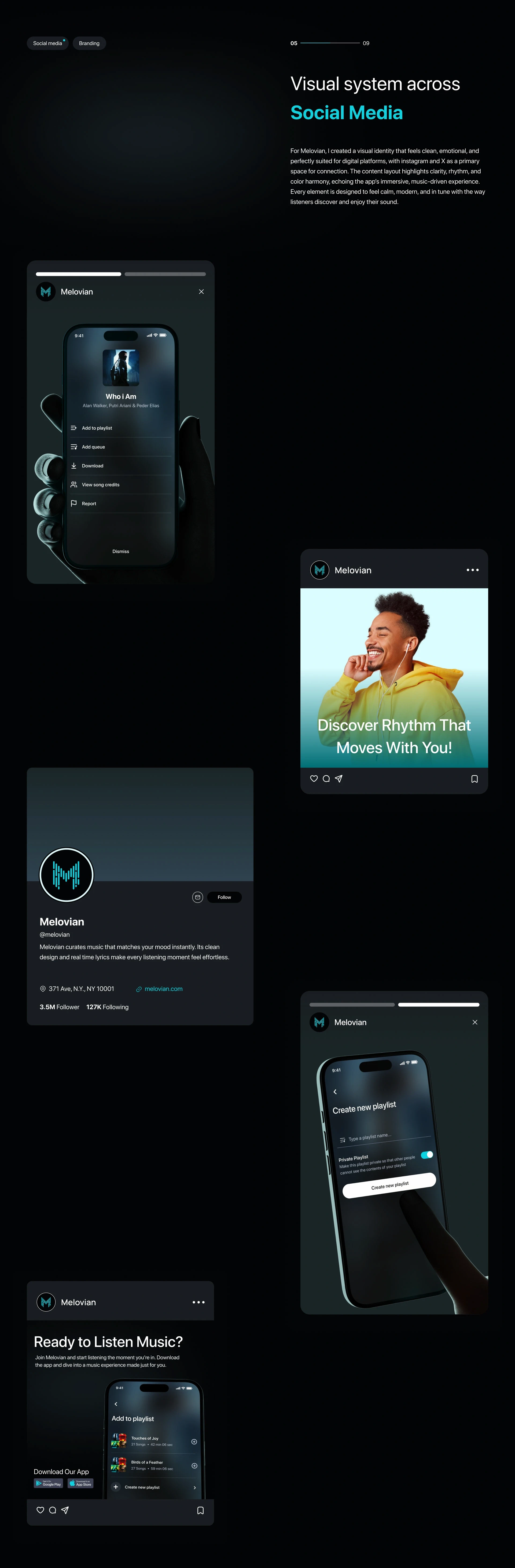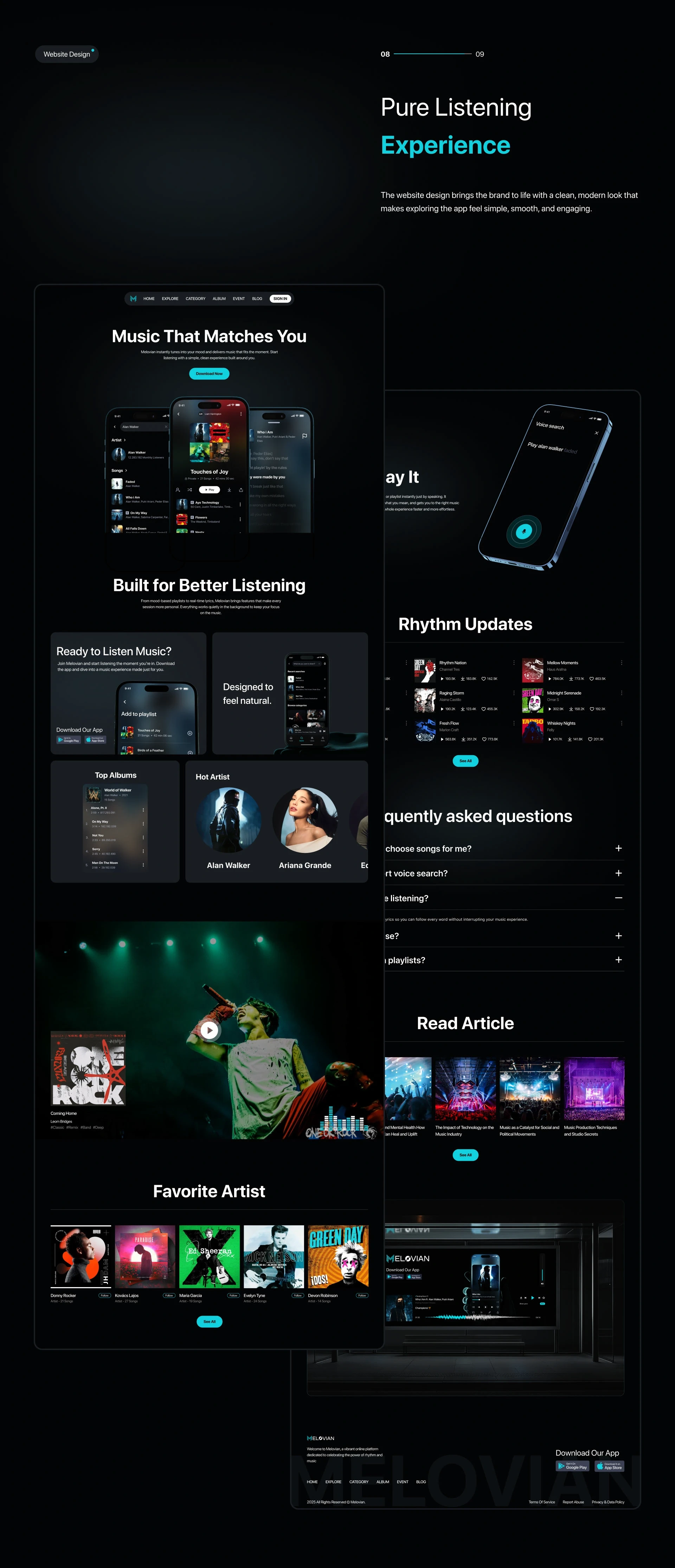 The website design extends the same mood-driven personality with clean sections, artist showcases, and content blocks—perfect for onboarding and marketing.