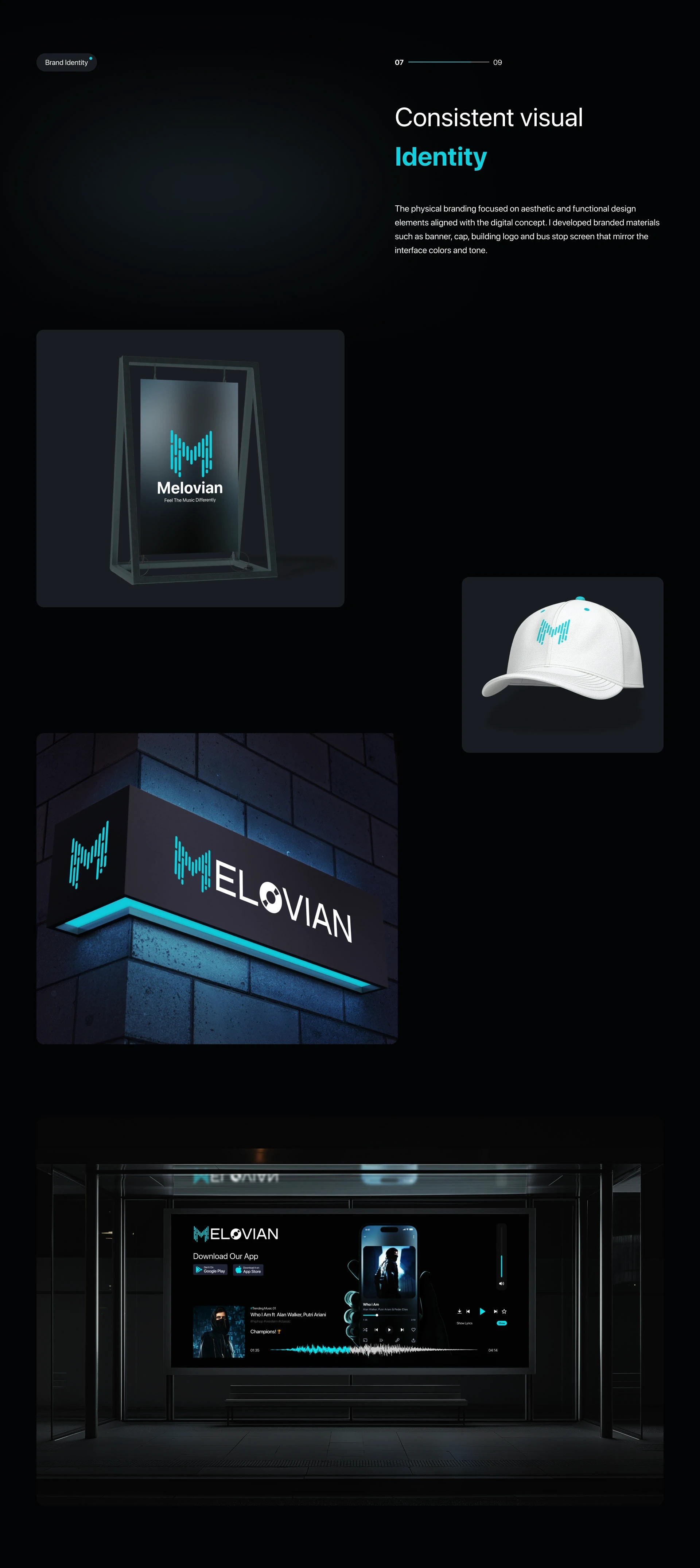 The signage, cap, and billboard-style visuals show a cohesive brand rollout—making the concept feel like a real startup launch.