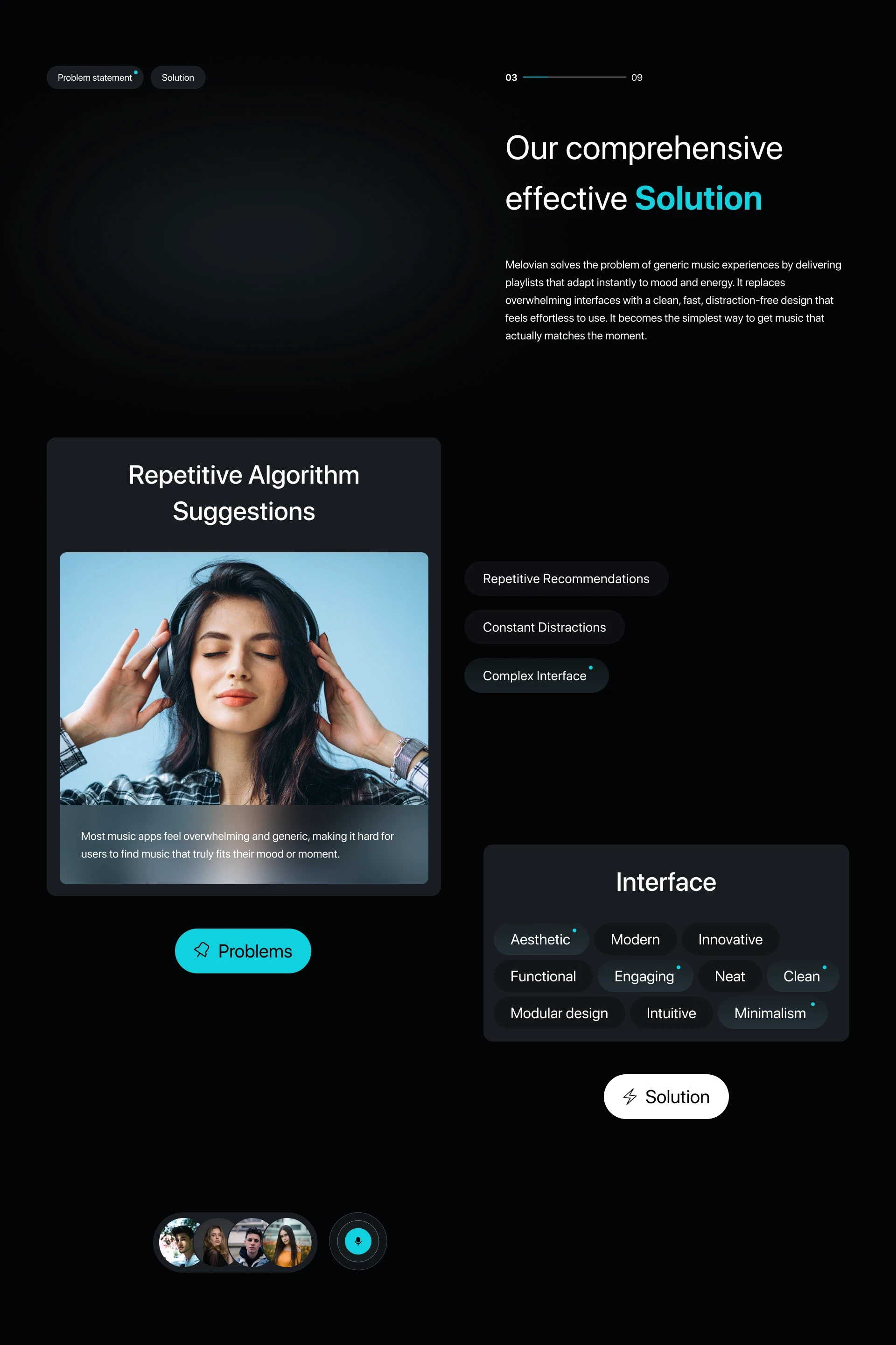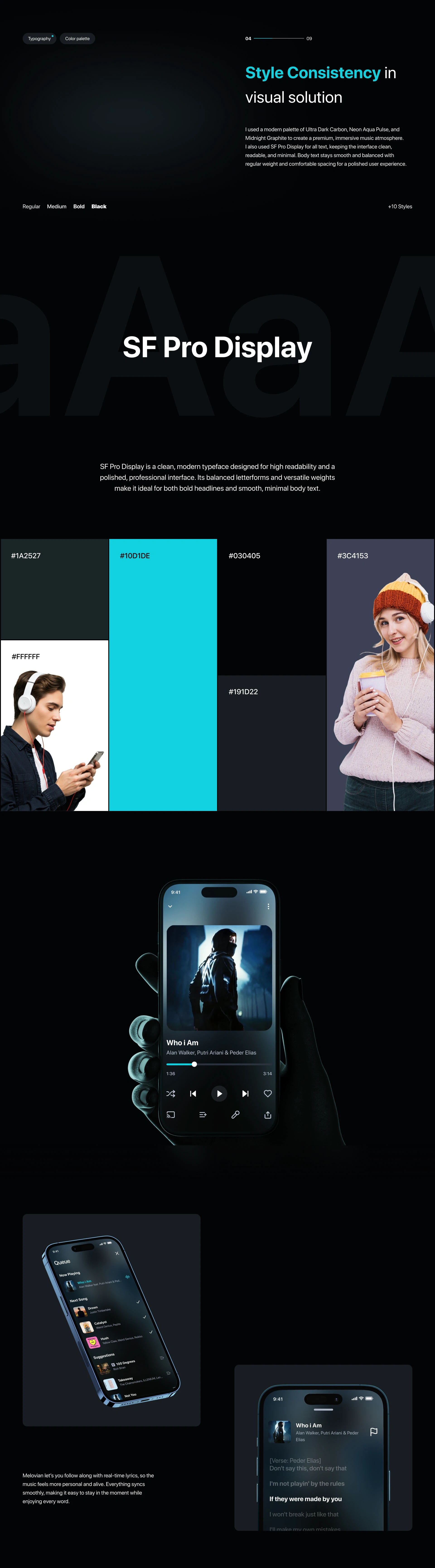 The story frames the product as mood-aware and distraction-free, while the logo grid shows intentional construction—ready for real-world scaling.