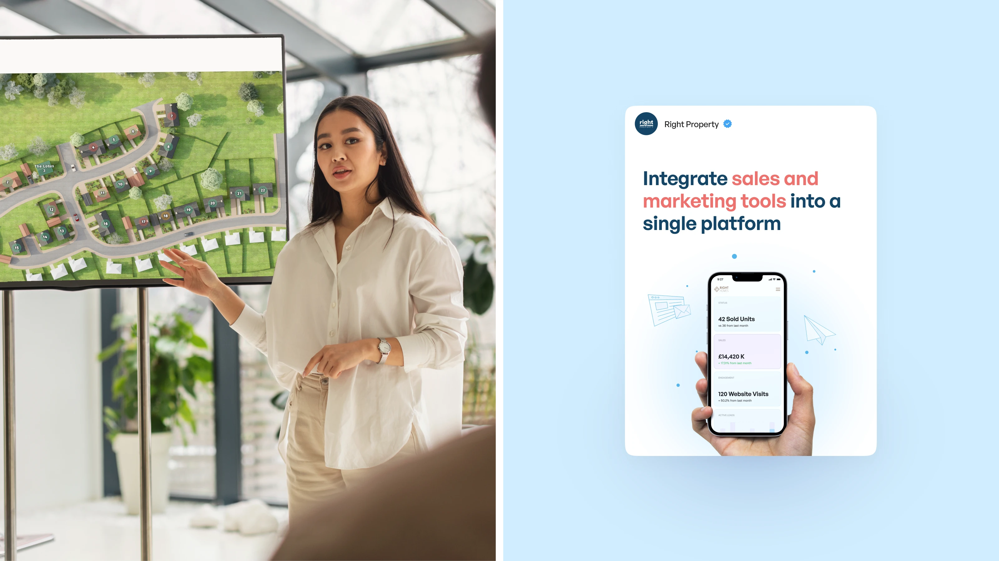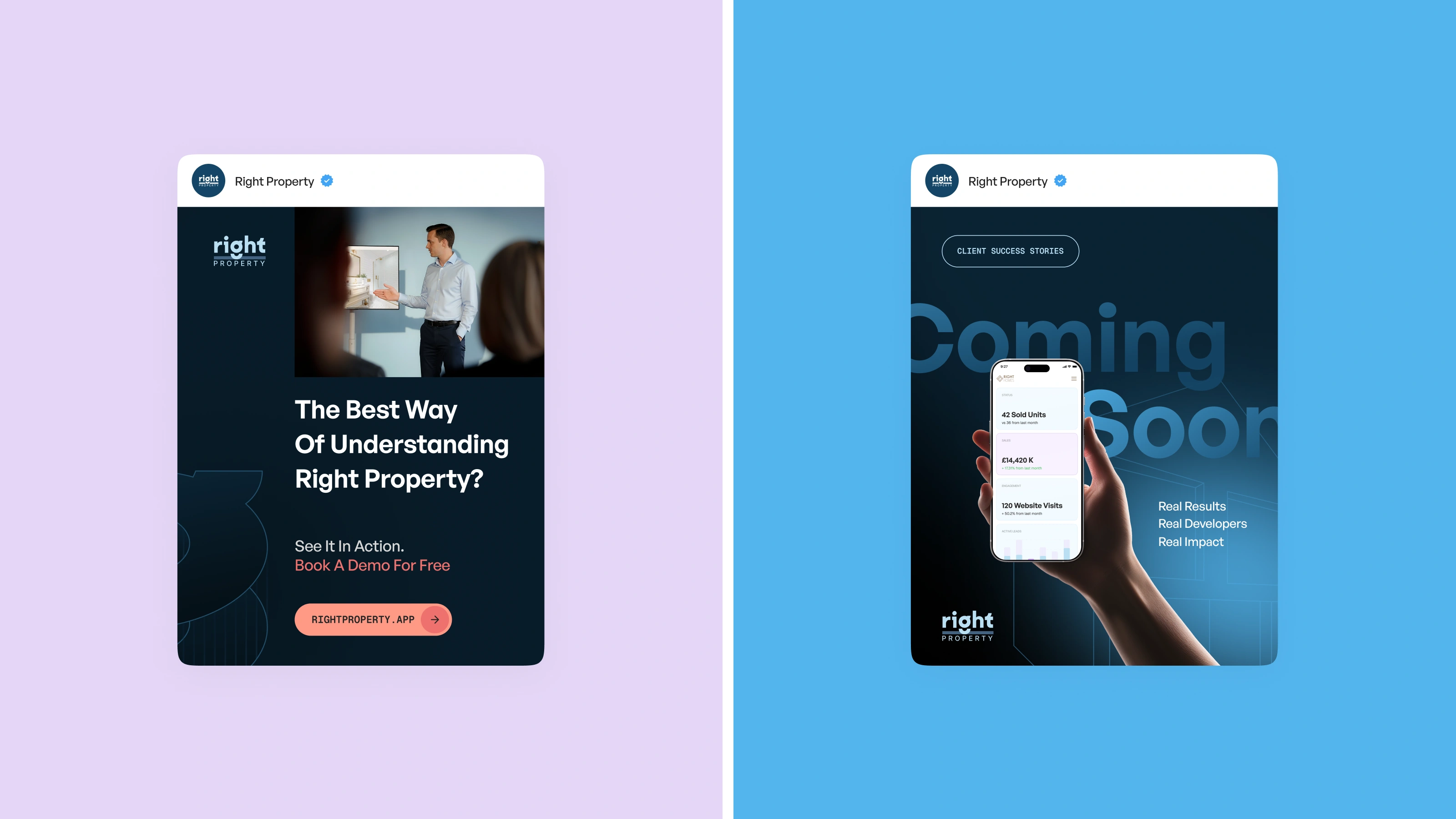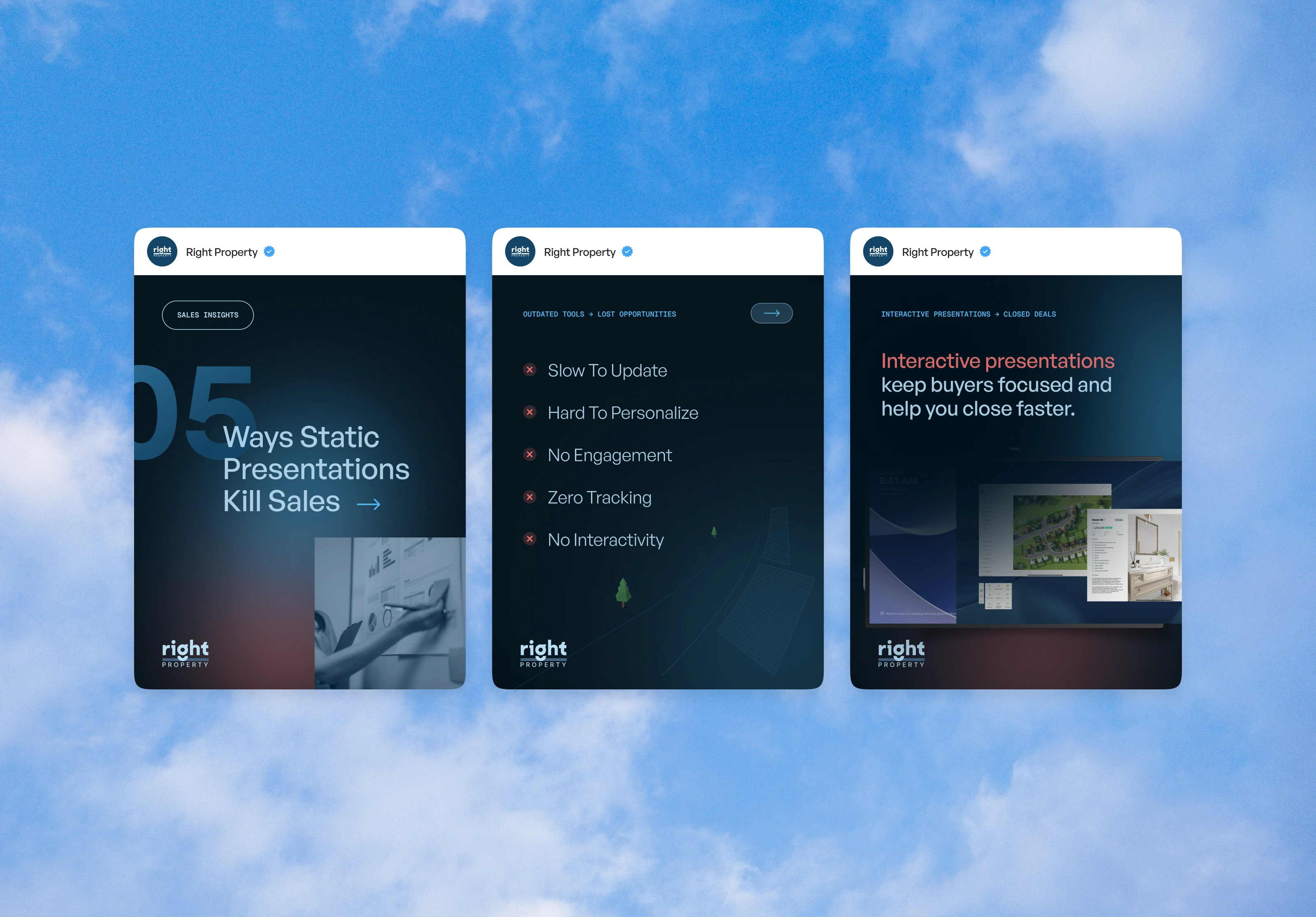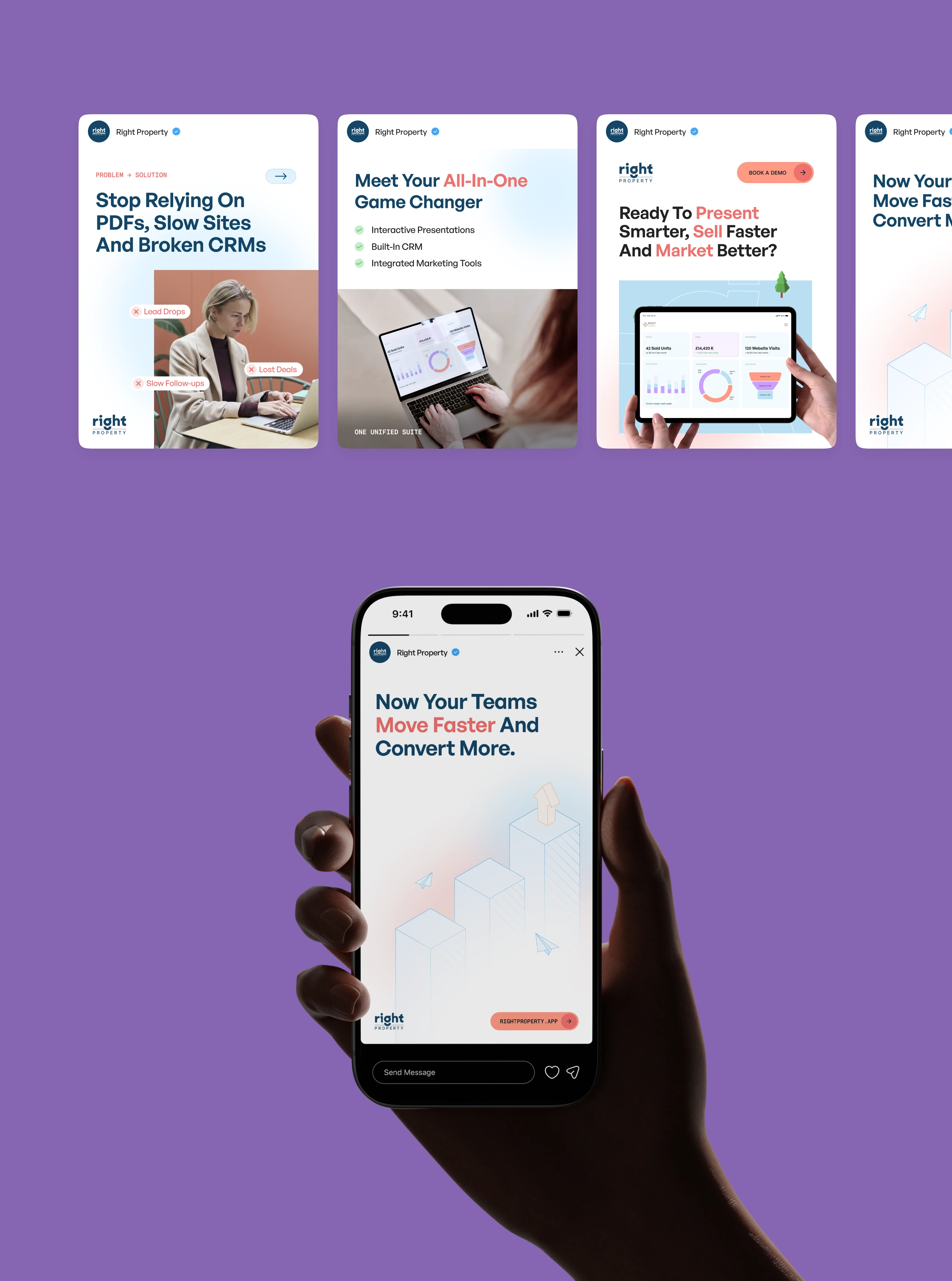 These social visuals follow a clear marketing narrative — highlighting the challenges real estate teams face with outdated tools and presenting Right Property as the modern, integrated solution. By combining product visuals, concise messaging, and structured storytelling, the designs guide viewers from problem awareness to product value, making the platform’s benefits easy to understand and engaging across social platforms.