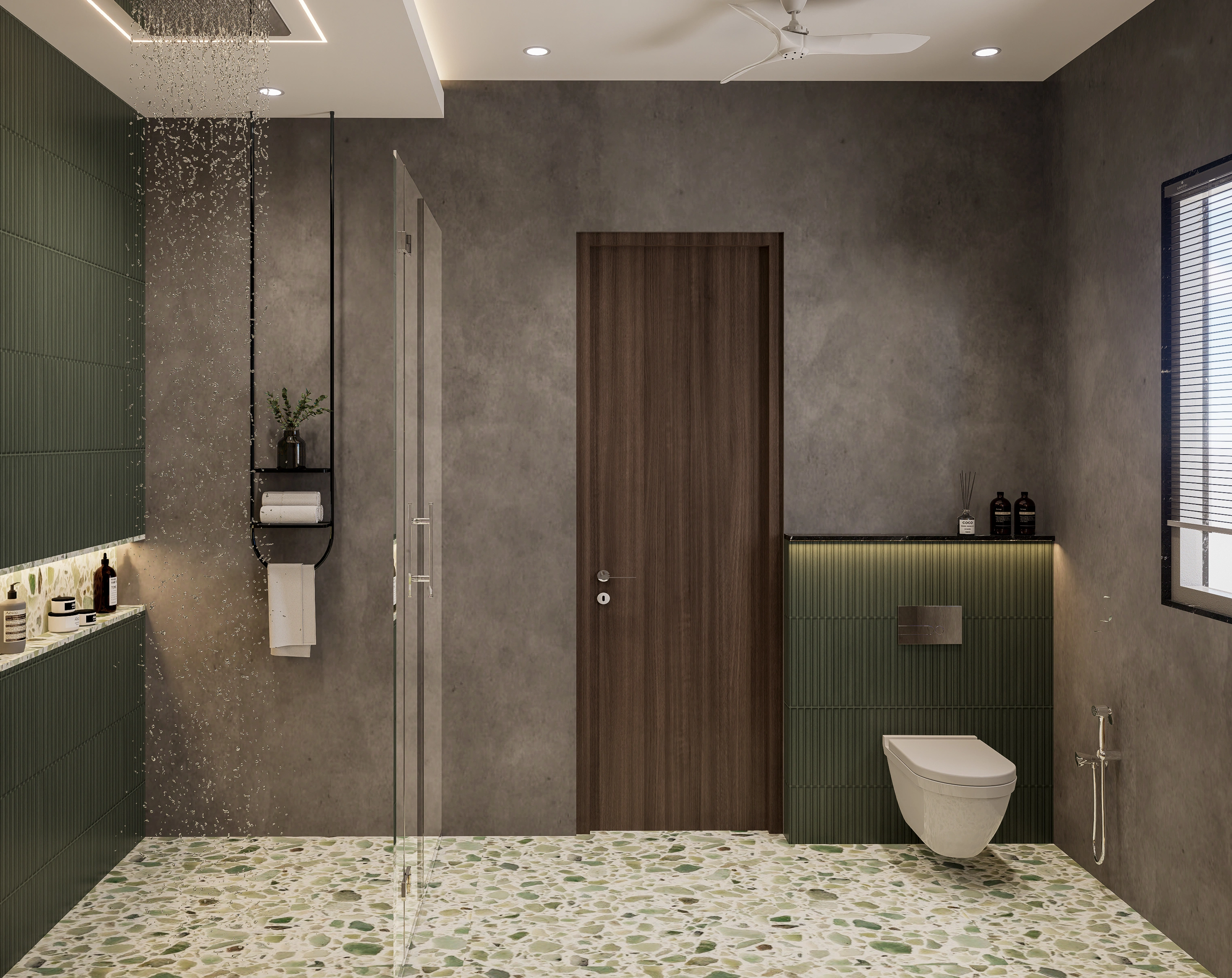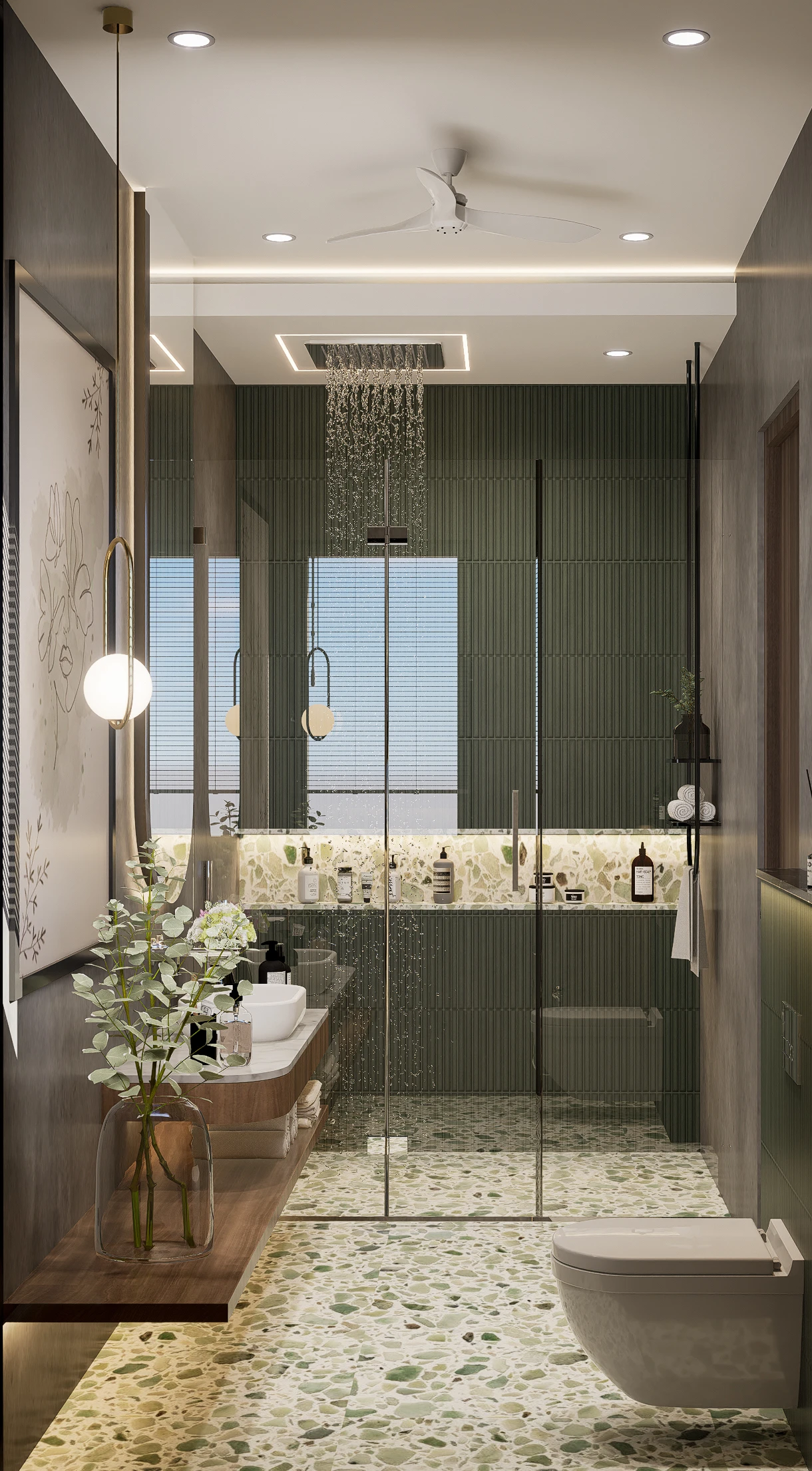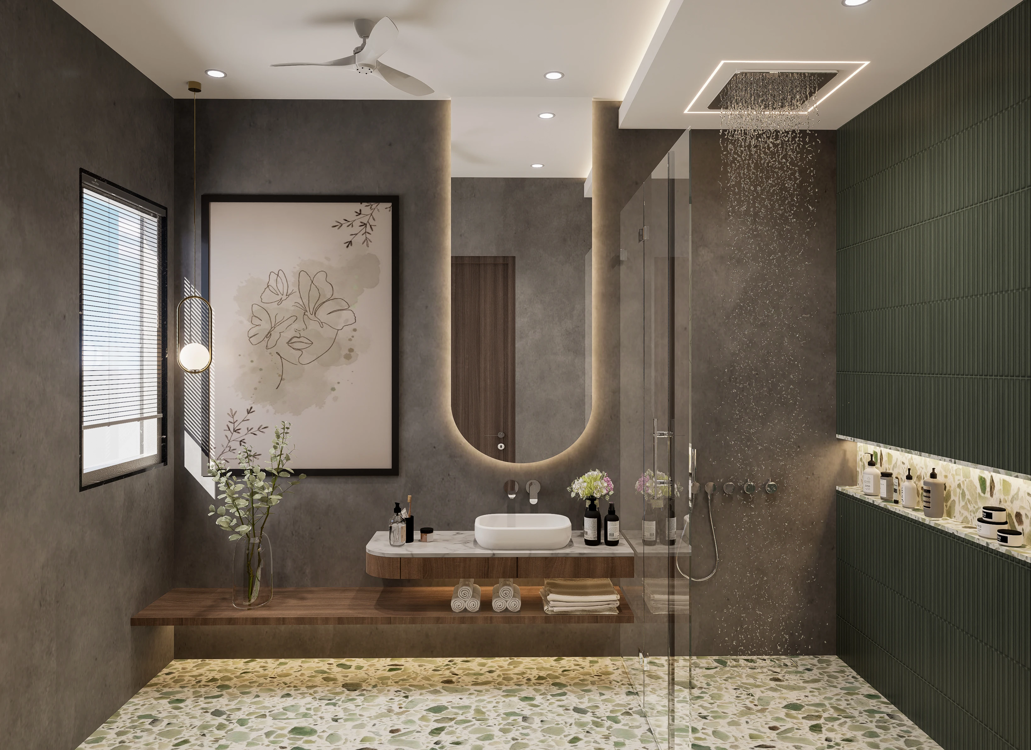 A refined washroom interior showcasing a harmonious blend of natural textures and modern elegance. Features include a sleek vanity with marble countertop, ambient lighting, a walk-in rain shower, and tasteful decorative elements, creating a tranquil and sophisticated space.