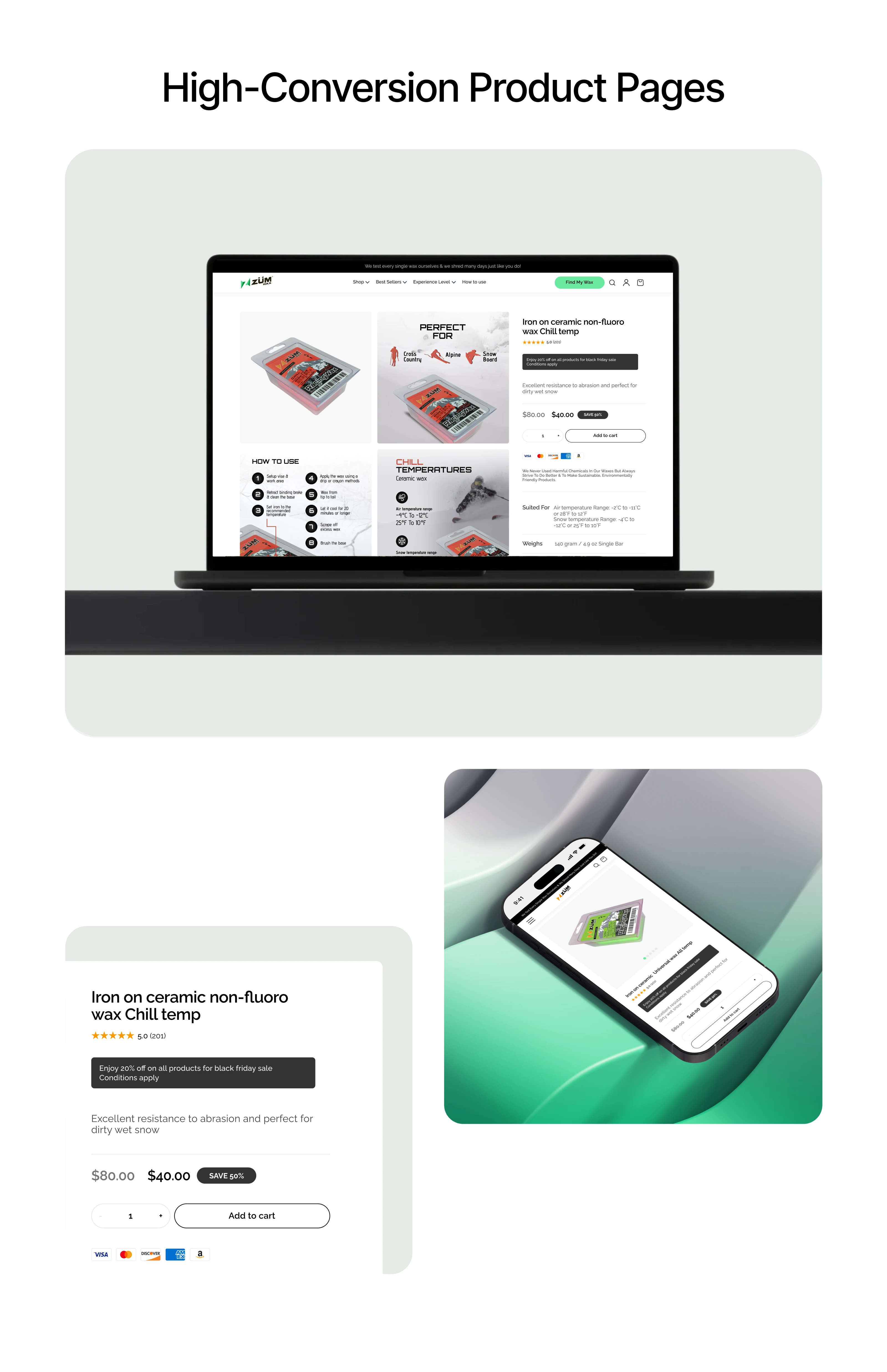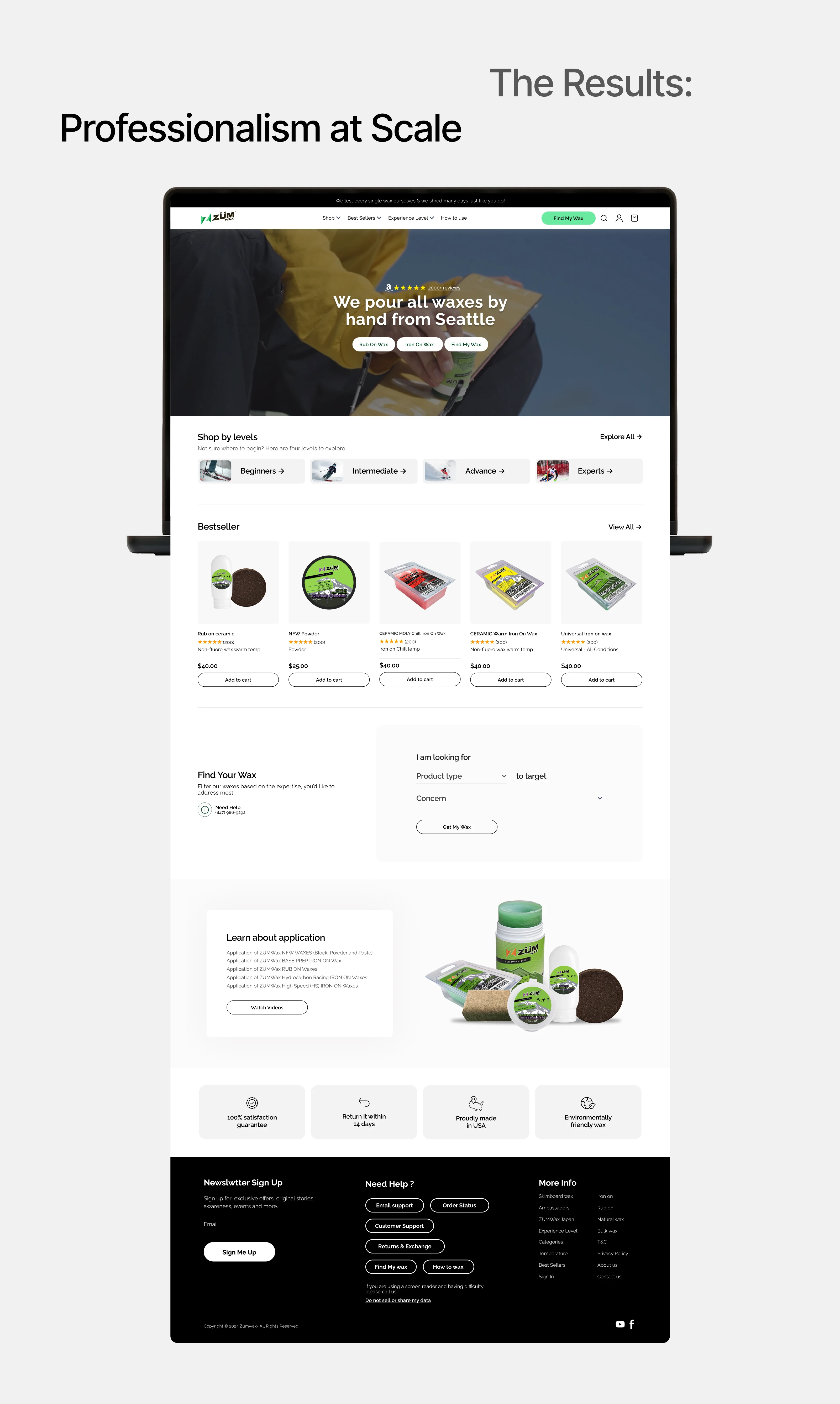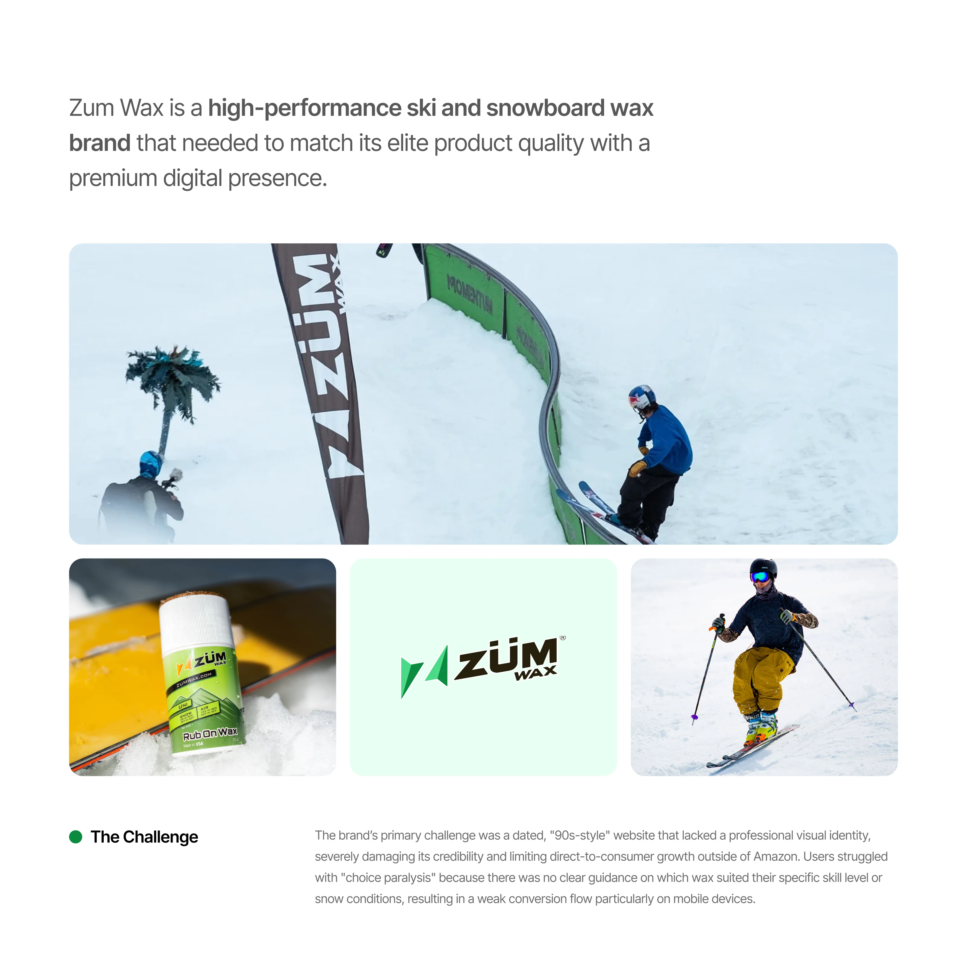 Zum Wax is a high-performance ski and snowboard wax brand based in Seattle, known for hand-pouring every single wax they produce. The brand had an elite product lineup but their digital presence was outdated and failed to reflect the quality they stood for. A complete website redesign was needed to match their product standards and grow their direct-to-consumer sales.