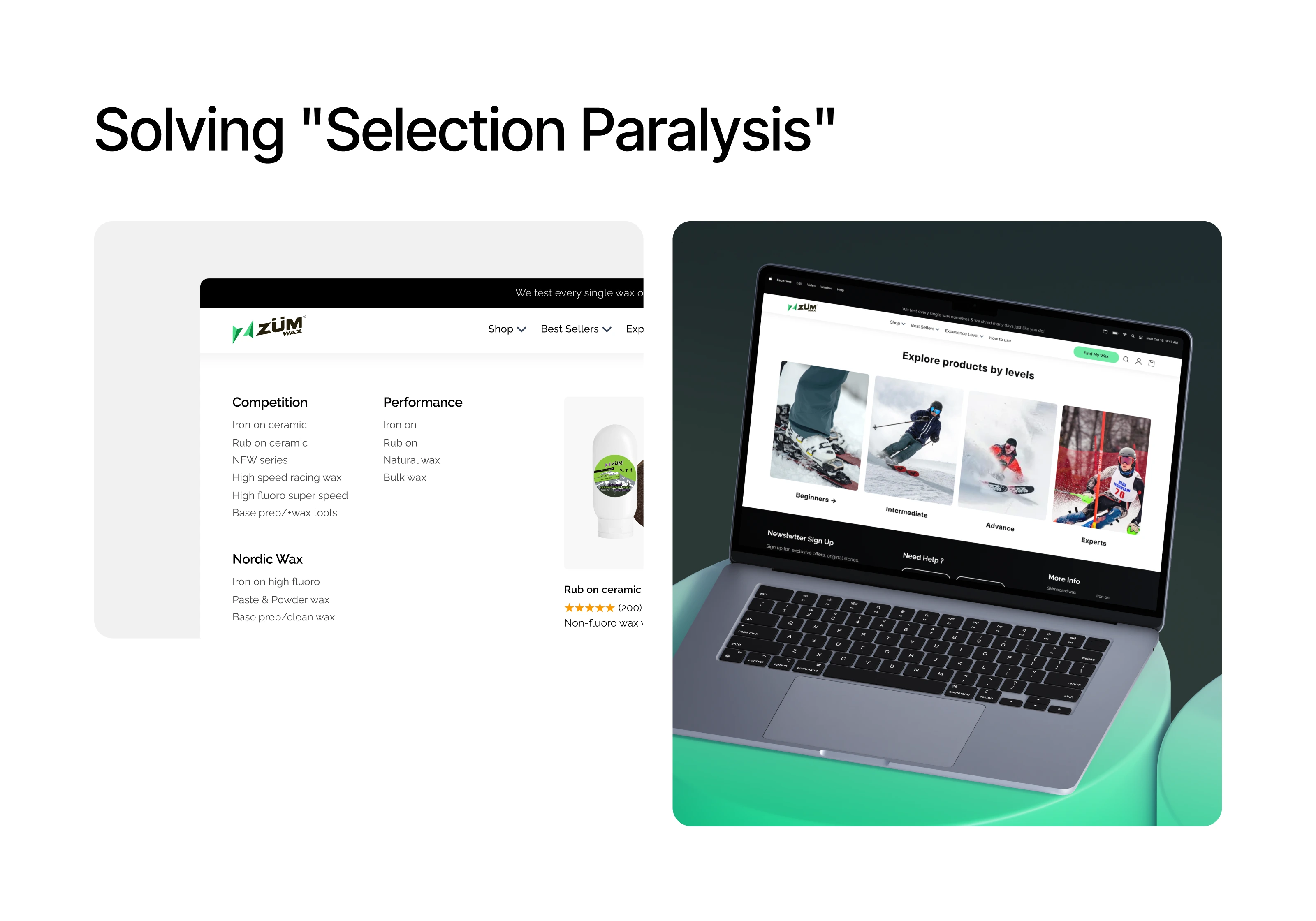 The primary challenge was "Selection Paralysis" users had no clear way to find the right wax for their skill level or snow conditions. With categories like Competition, Performance, and Nordic Wax all listed together, the experience felt overwhelming and unconverted.