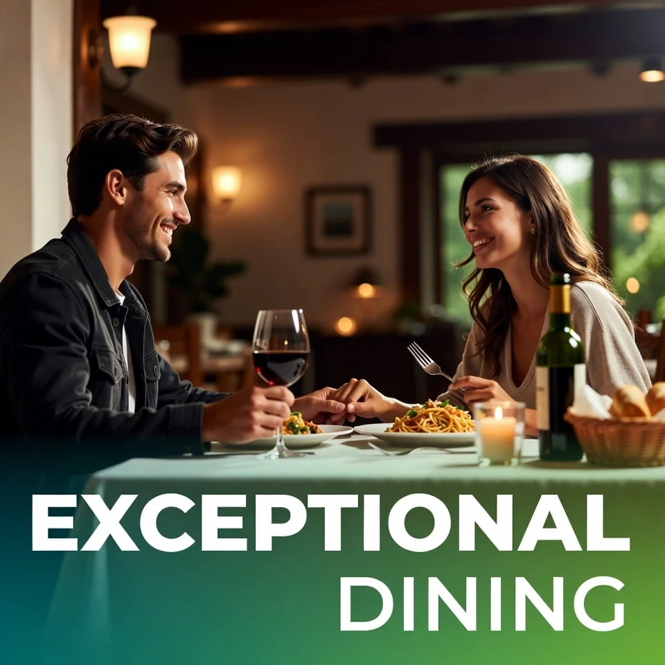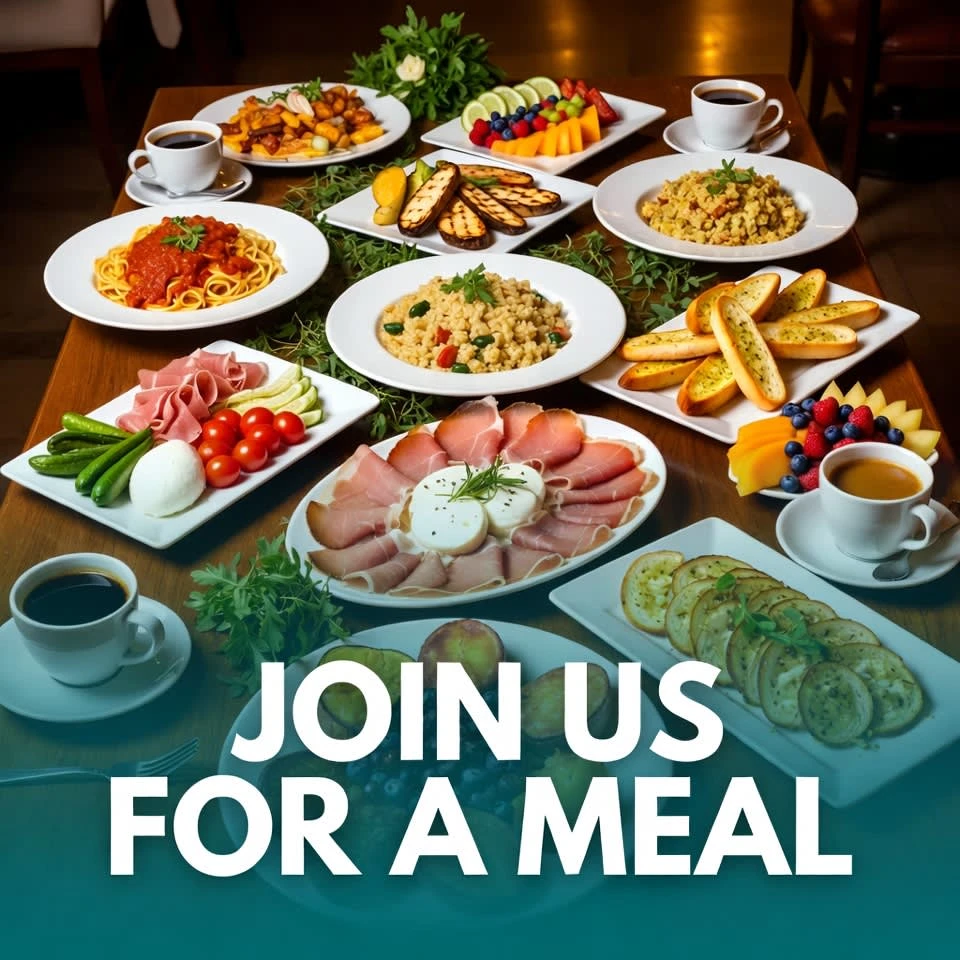 Prompt: Create a vibrant promotional restaurant advertisement image in a similar style: a top-down view of a beautifully arranged Italian-inspired buffet spread on a wooden table, featuring plates of fresh pasta with tomato sauce, grilled vegetables, risotto, slices of prosciutto, fresh mozzarella and tomatoes, garlic bread, fruit platters with melon and berries, coffee cups, and decorative greenery. Use a teal overlay at the bottom with bold white text saying "JOIN US FOR A MEAL" Keep the composition elegant and appetizing, high-resolution, professional photography style.