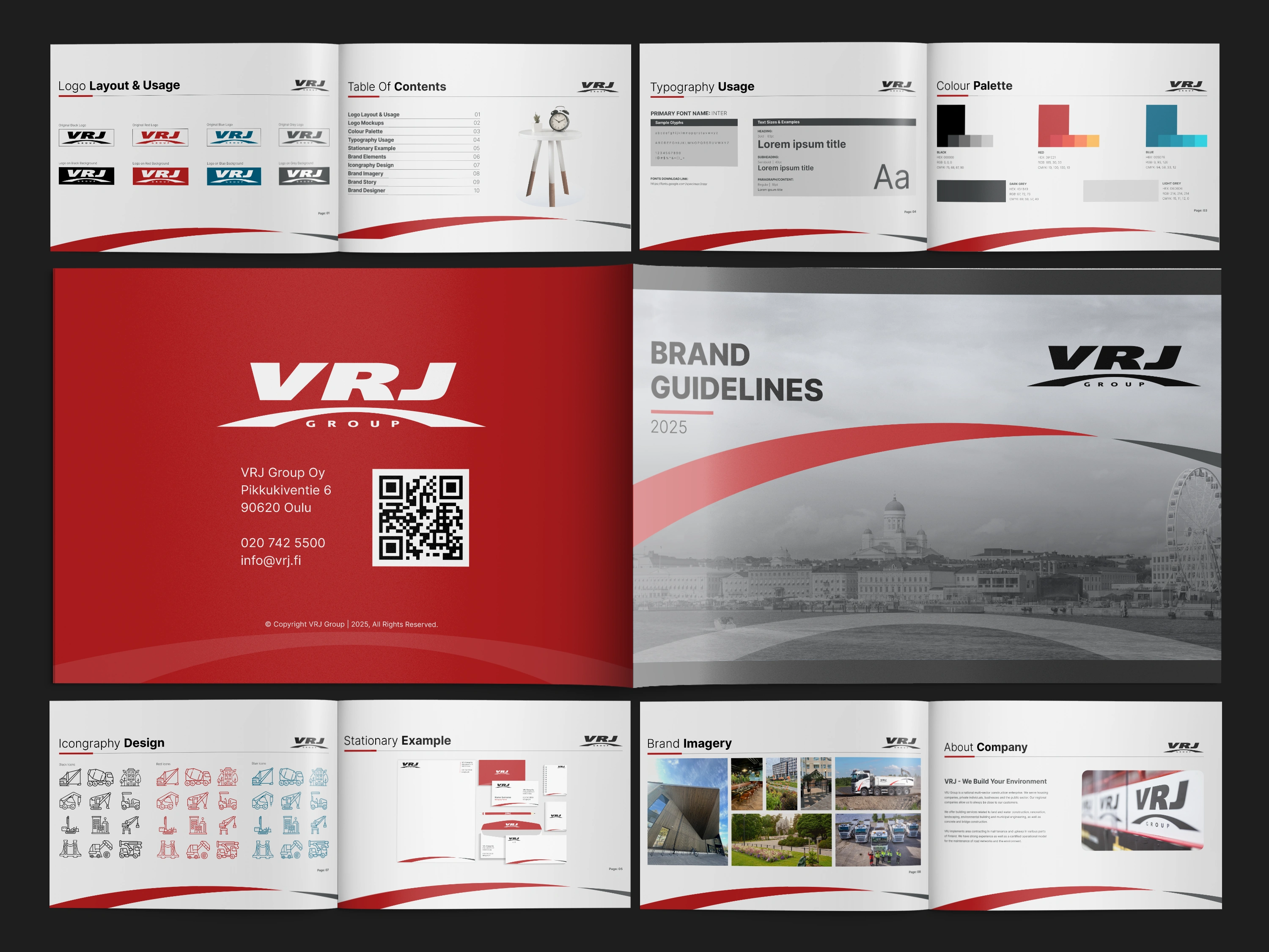 Designed a full multipage Brand Guideline for VRJ Group with logo rules, colors, typography, Imagery and stationery. Delivered editable vectors, AI, and a PDF.