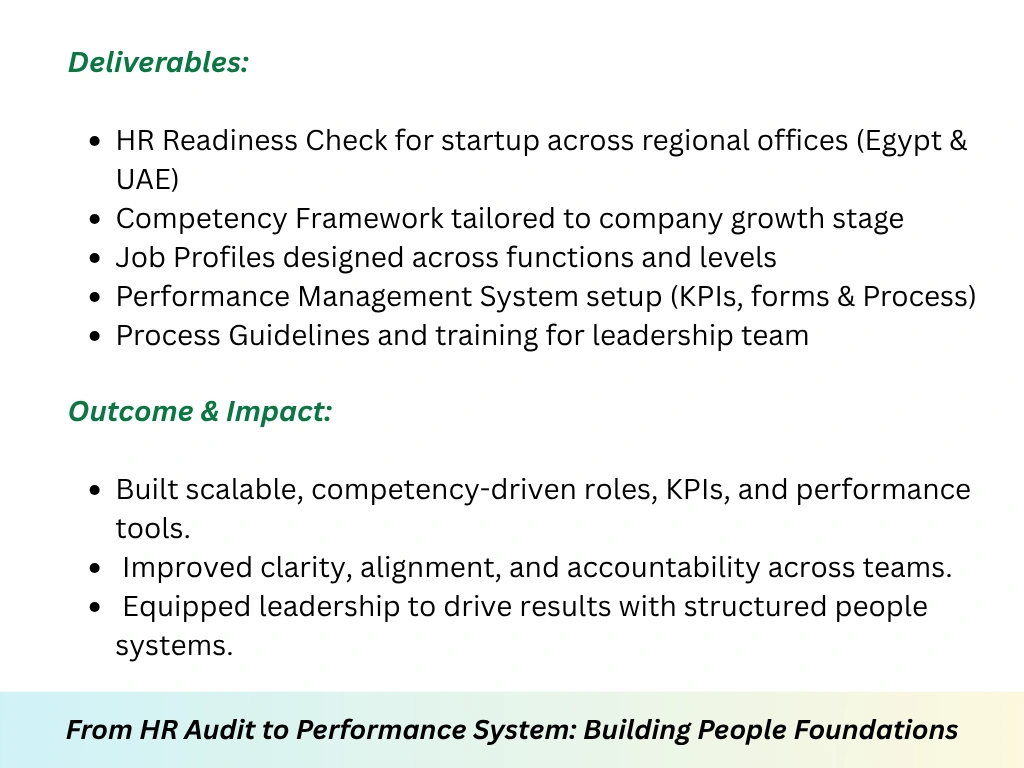 End-to-End HR Solution for a fintech scale-up (Egypt & UAE): audit, competency framework, job profiles, and performance management system (tools & process).