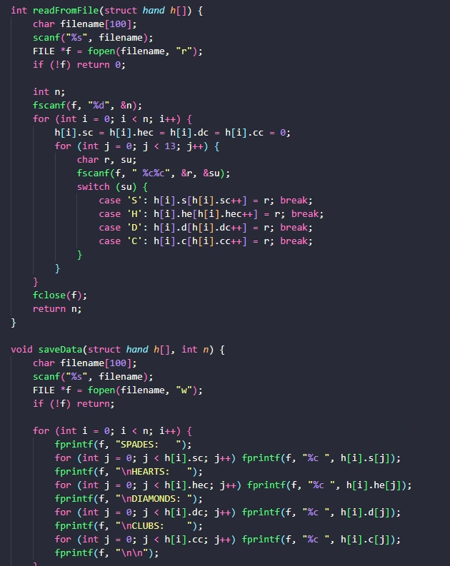 Bridge program extended: readFromFile reads hand count & N hands from text file; saveData writes hands to file, matching printHand format. Built on Part 1 in C.