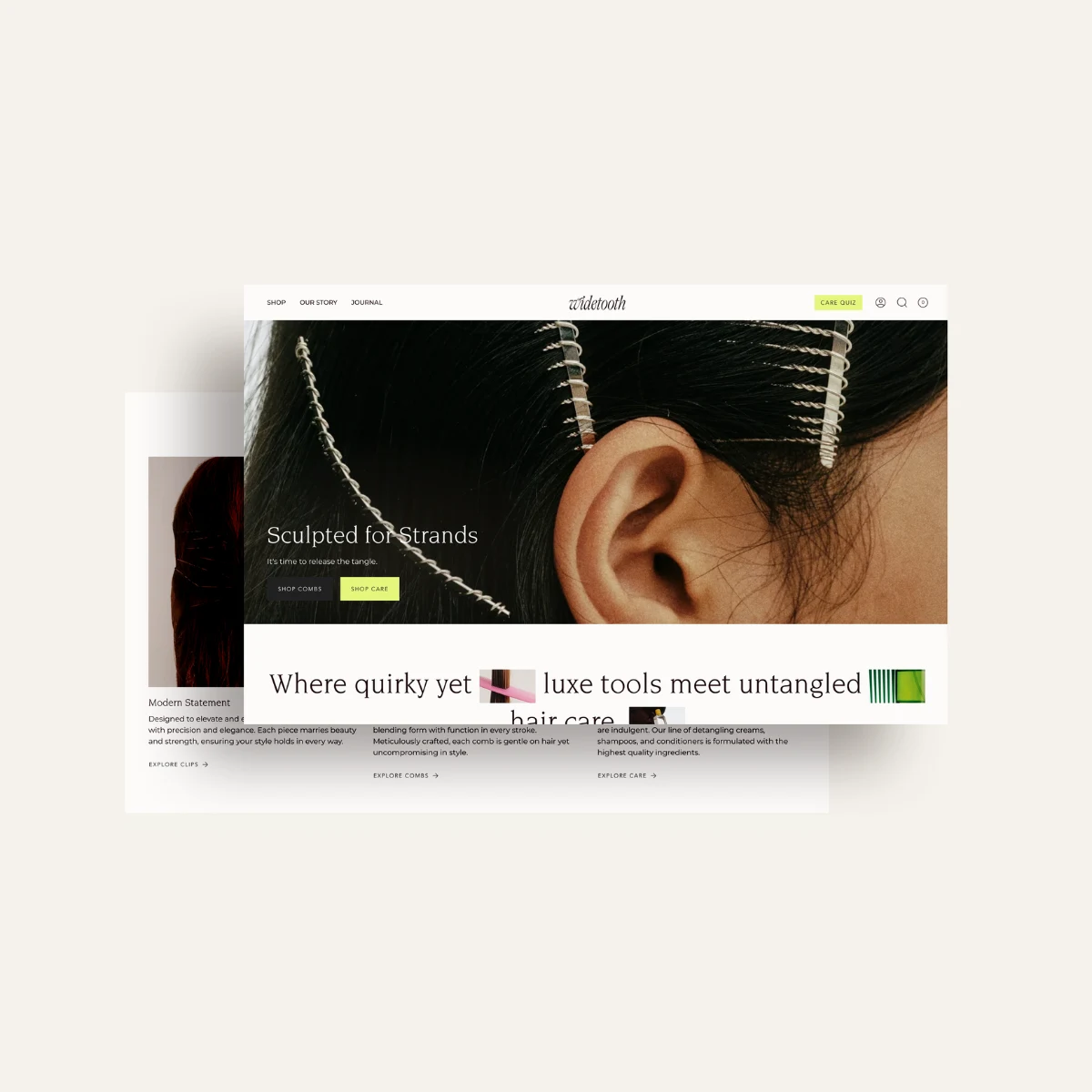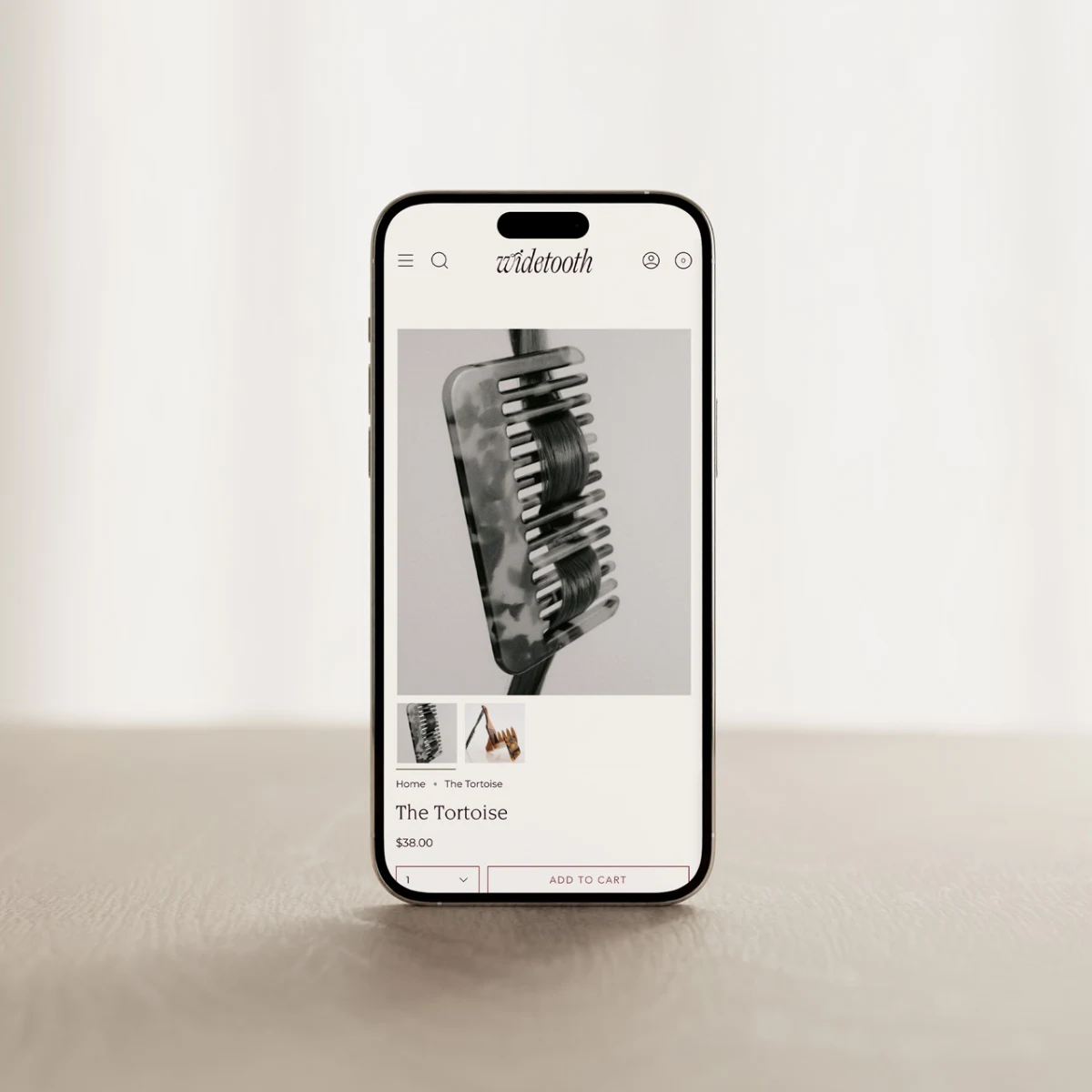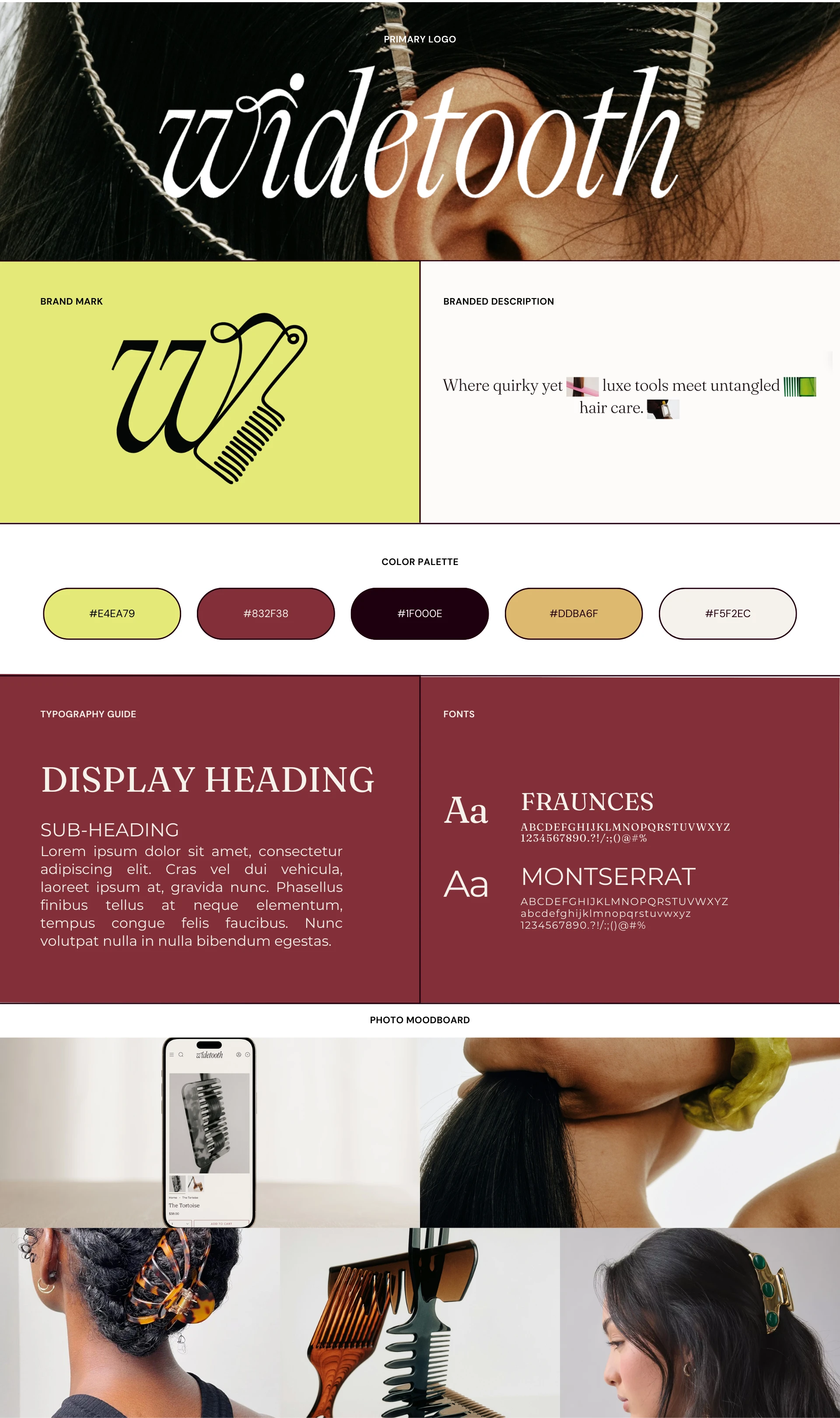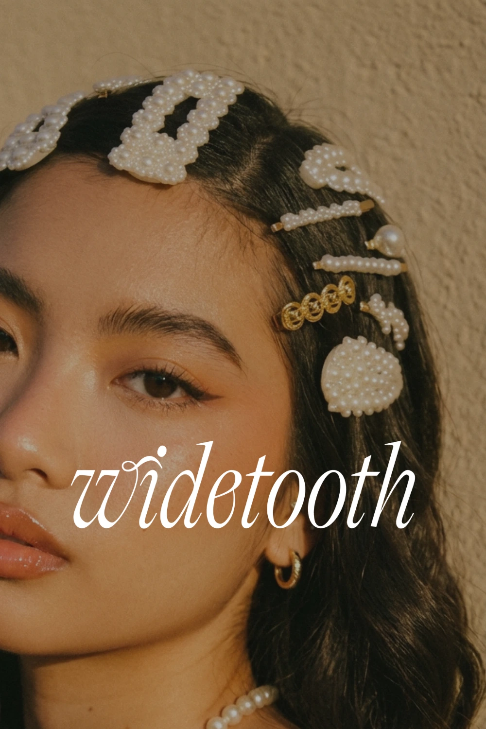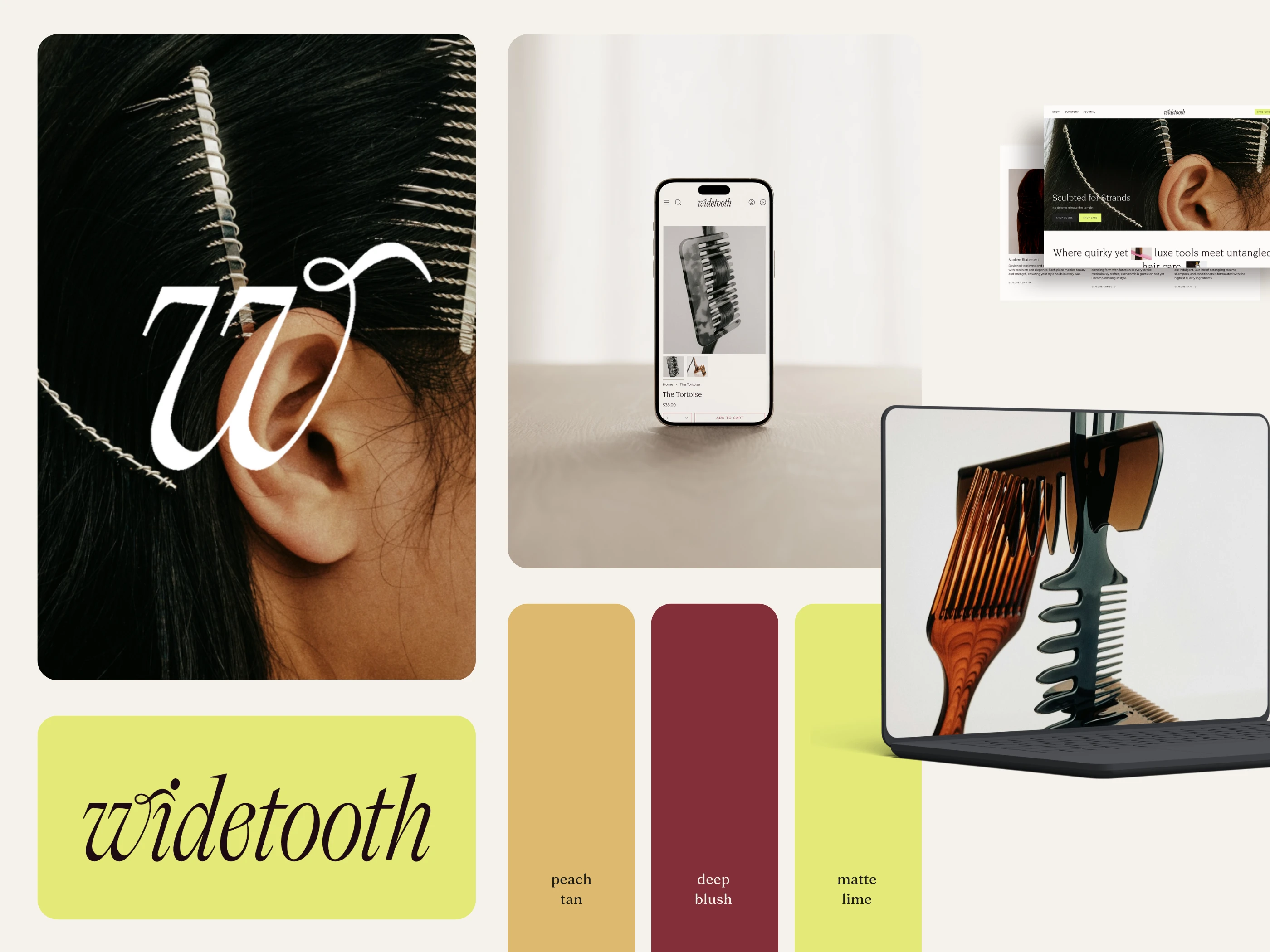 The visual identity leans into the tension between editorial luxury and a little bit of weird, in the best way. A custom wordmark built on Fraunces pairs the elegance of a high-fashion serif with a literal comb illustration woven into the letterforms, making the brand mark function as both logo and product story. The palette of matte lime, deep blush, and peach tan gives Widetooth a shelf presence that feels fresh without chasing any obvious trend, and leaves plenty of room to grow as the product line expands beyond combs and clips into serums and beyond.