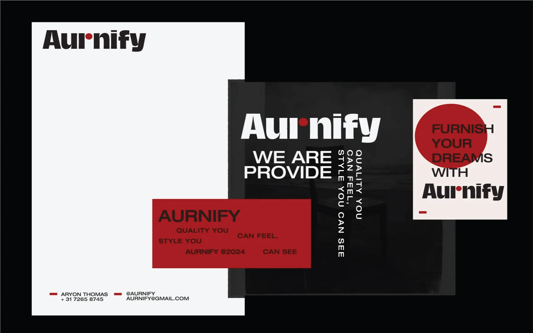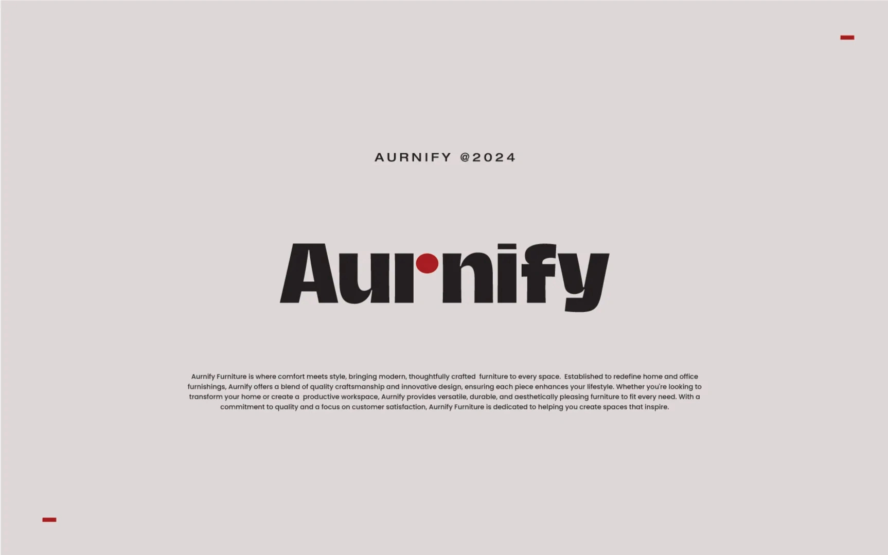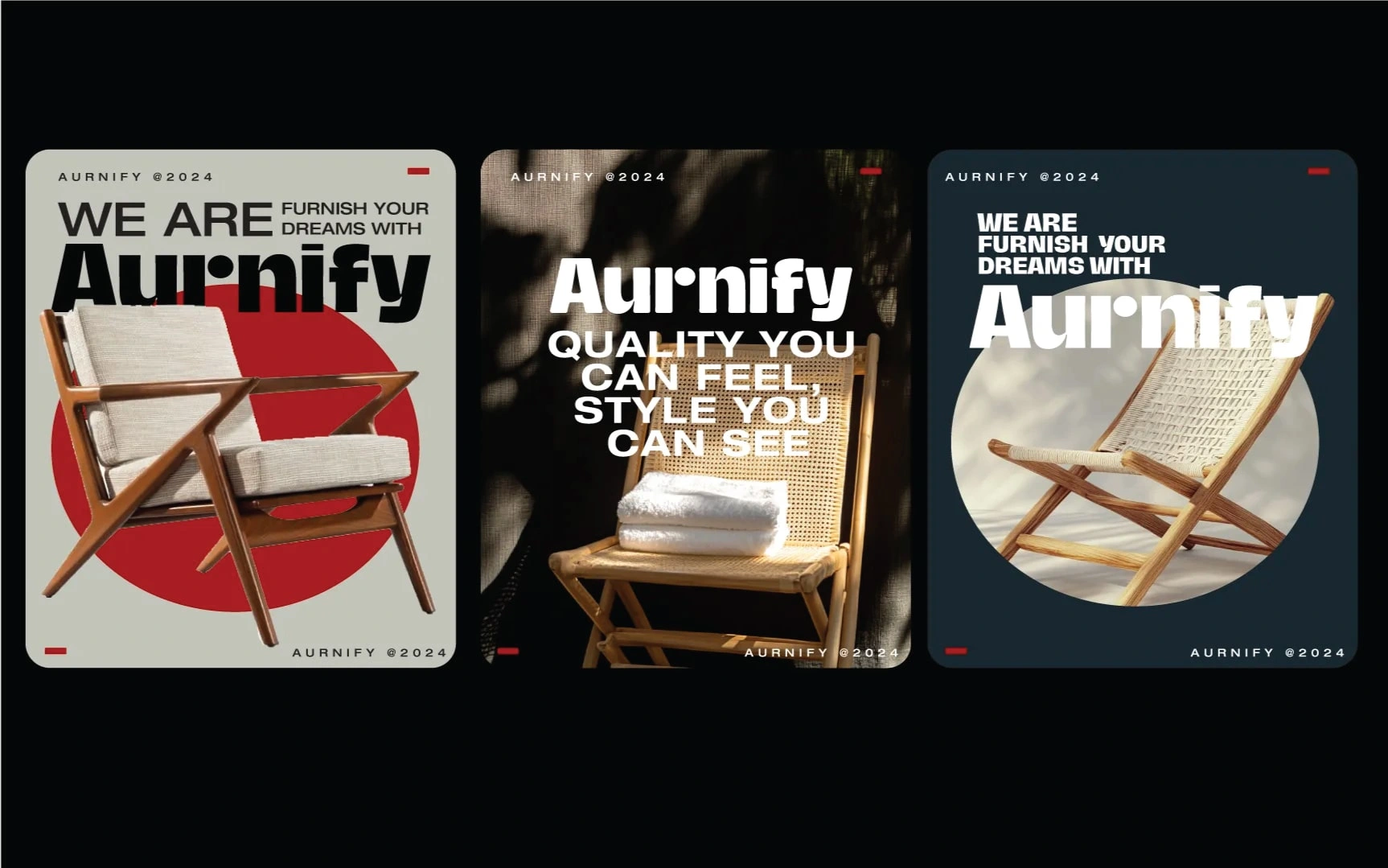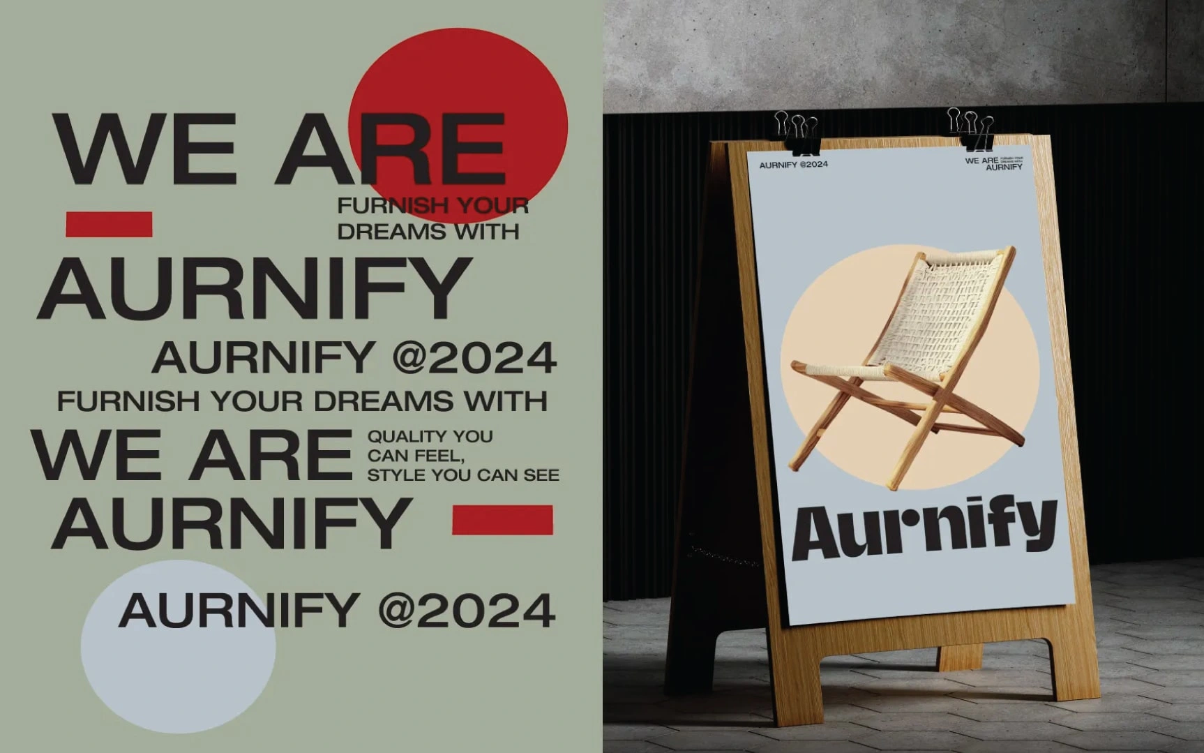Aurnify positions itself as a premium, modern furniture brand that blends craftsmanship with clean, bold aesthetics. Its visual language is distinct, memorable, and rooted in a minimalist yet assertive style ideal for a furniture brand that wants to project both comfort and confidence.