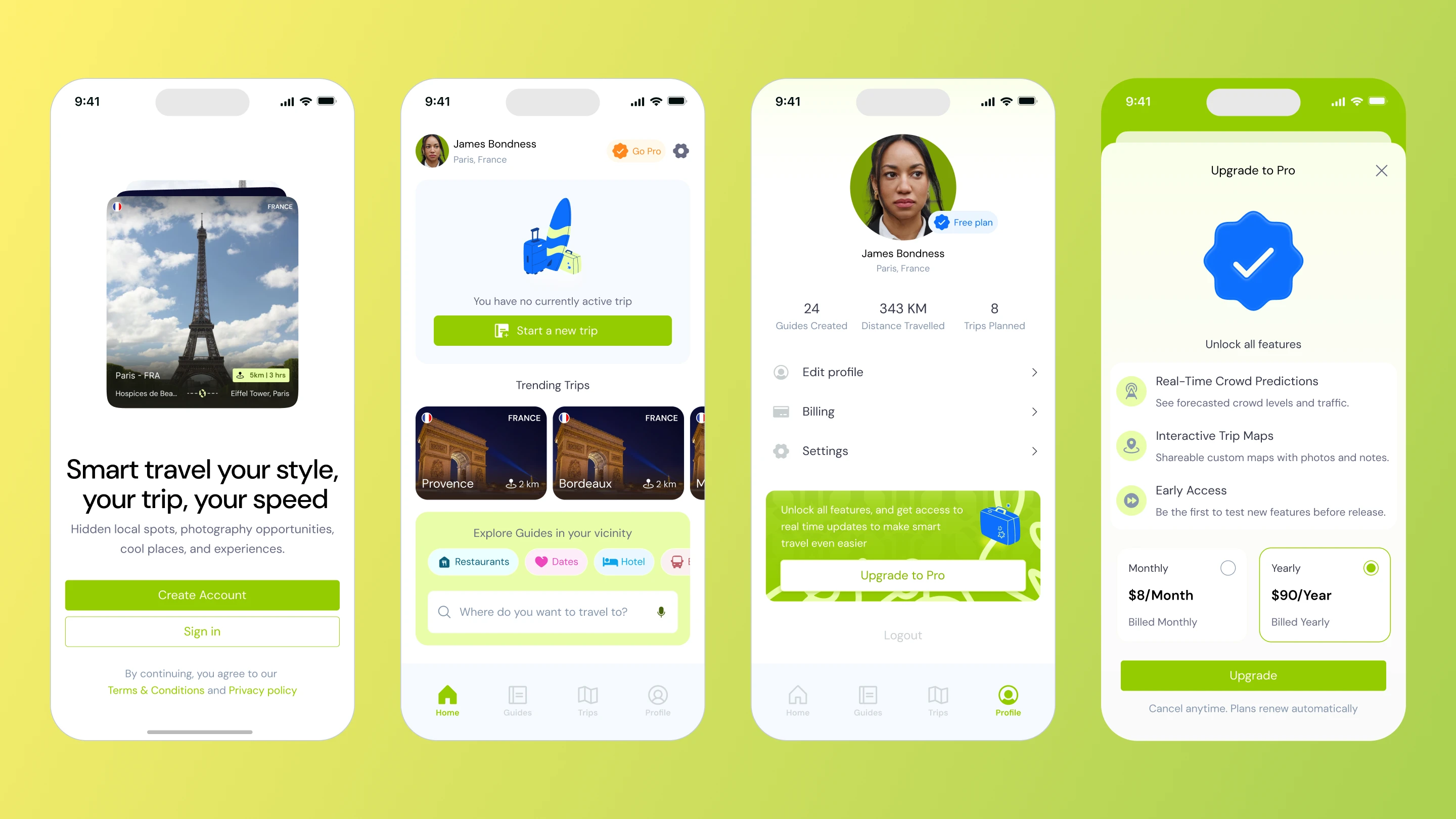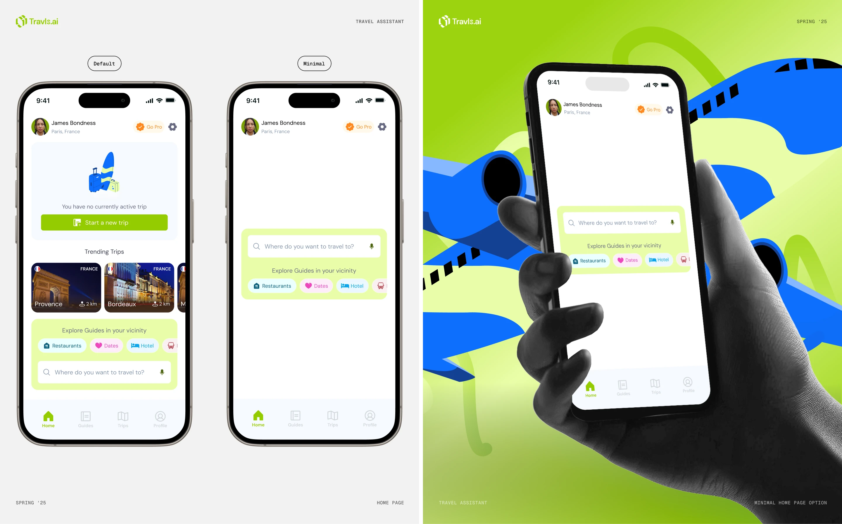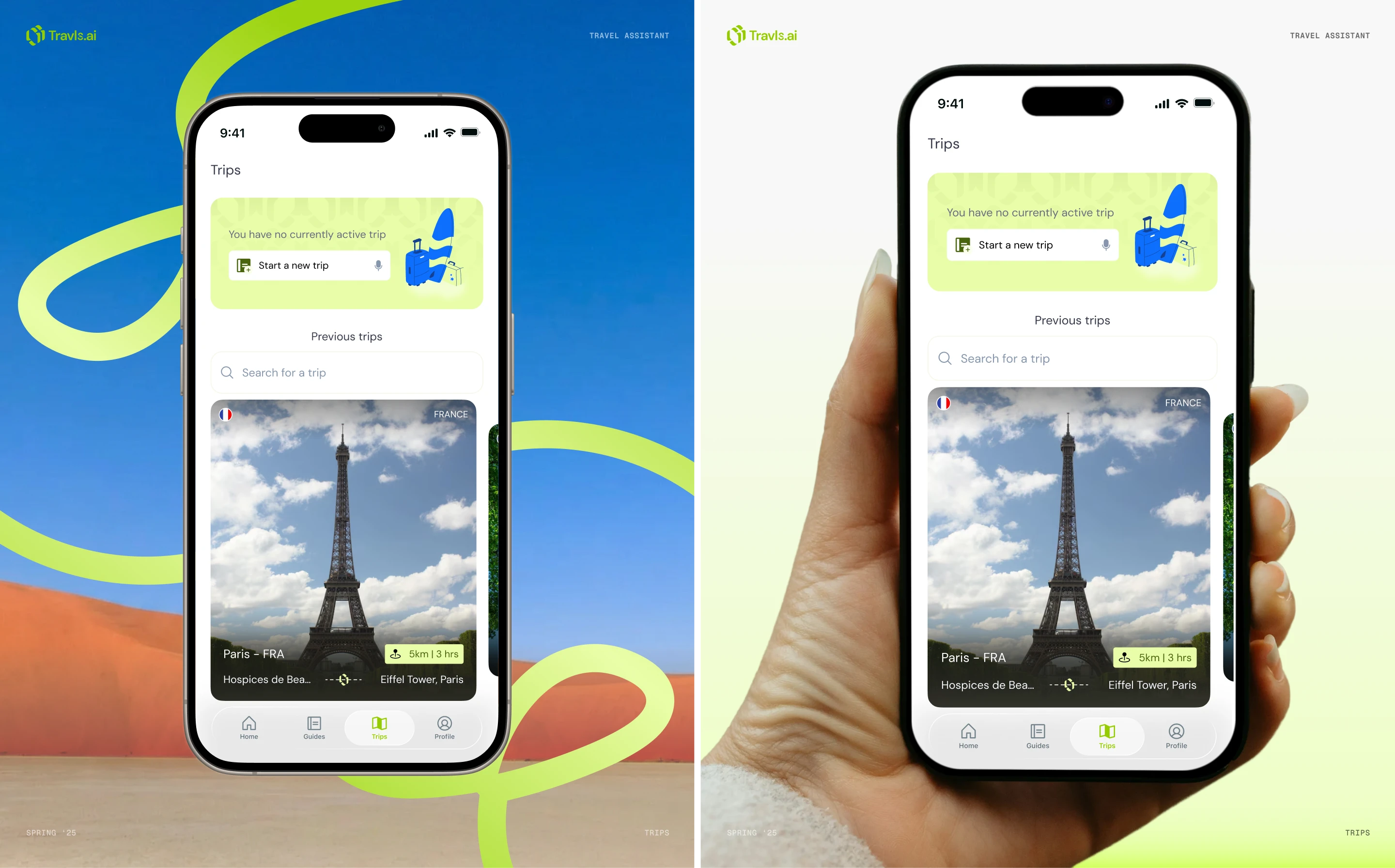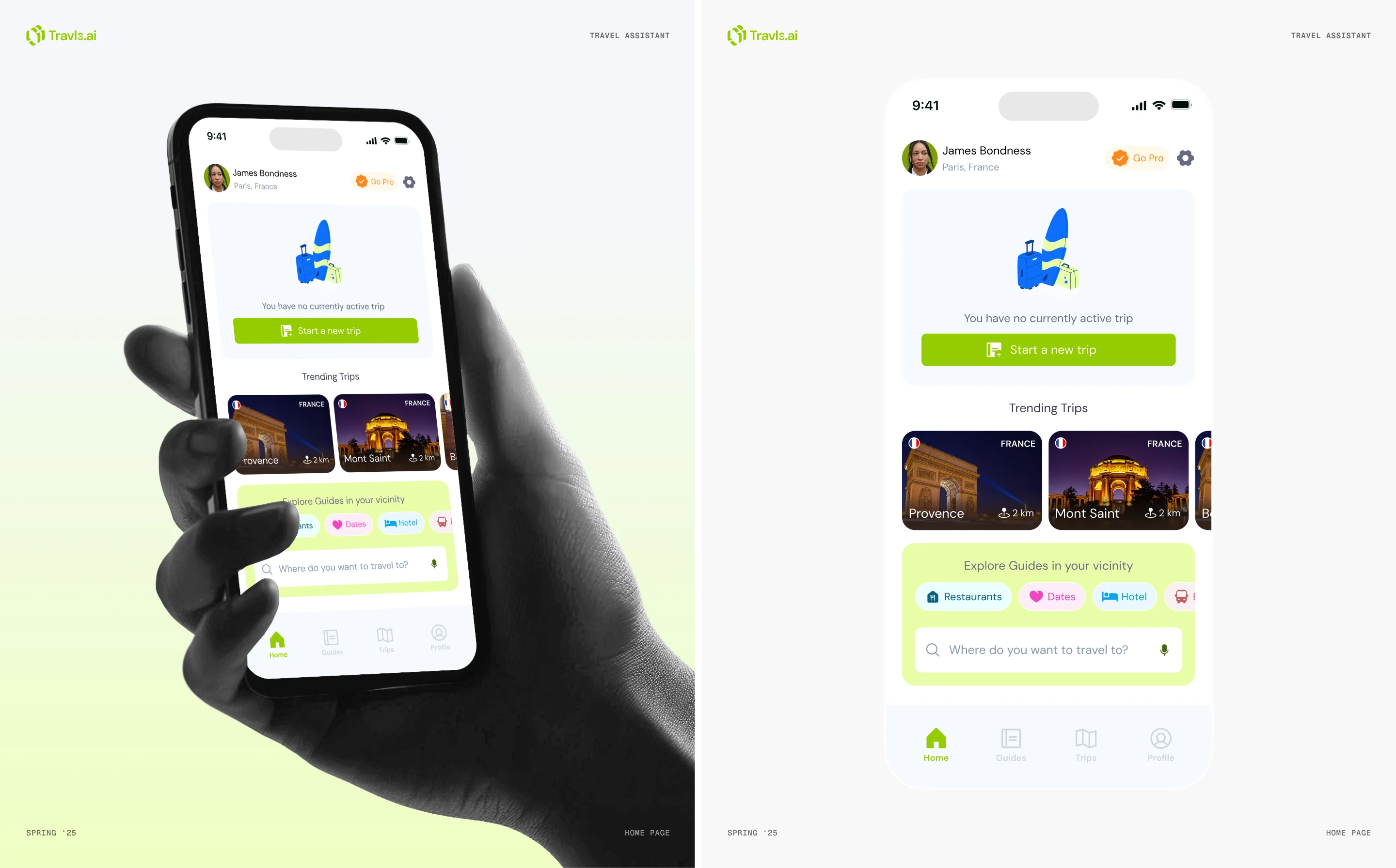 Travls delivers a unified place to create trips, explore nearby spots, and move through cities confidently. The app uses a soft visual style, simple navigation, and a clear structure for trips and guides. Core screens highlight upcoming trips, local recommendations, and profile tracking.