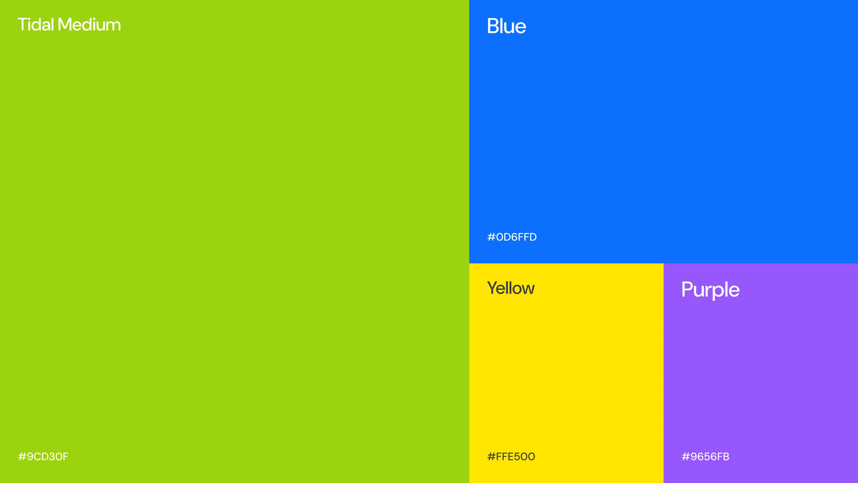 Brand color palette of Neon Green, Blue, Yellow and Purple.