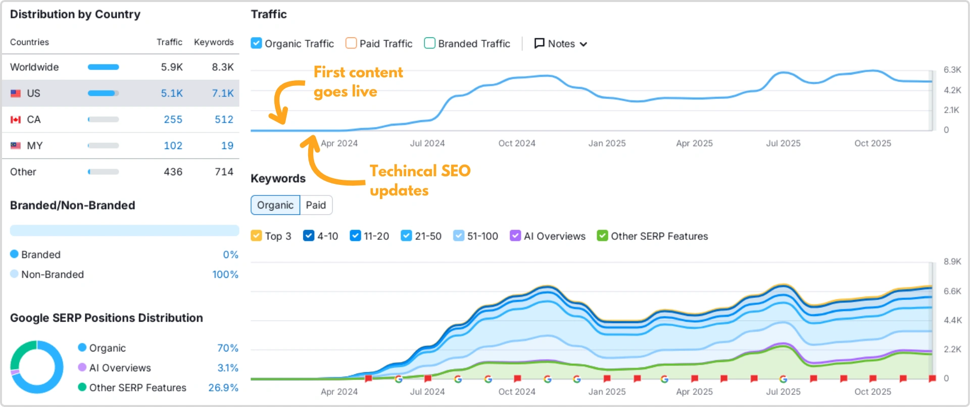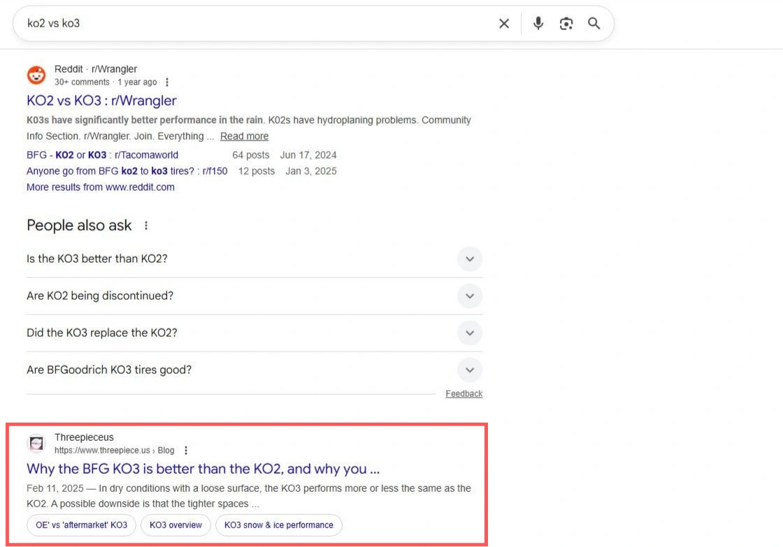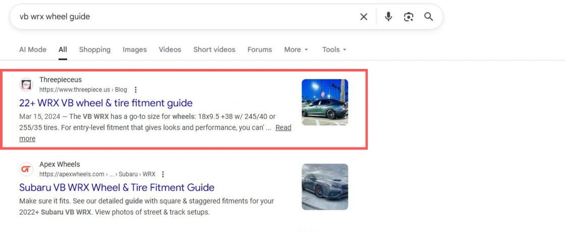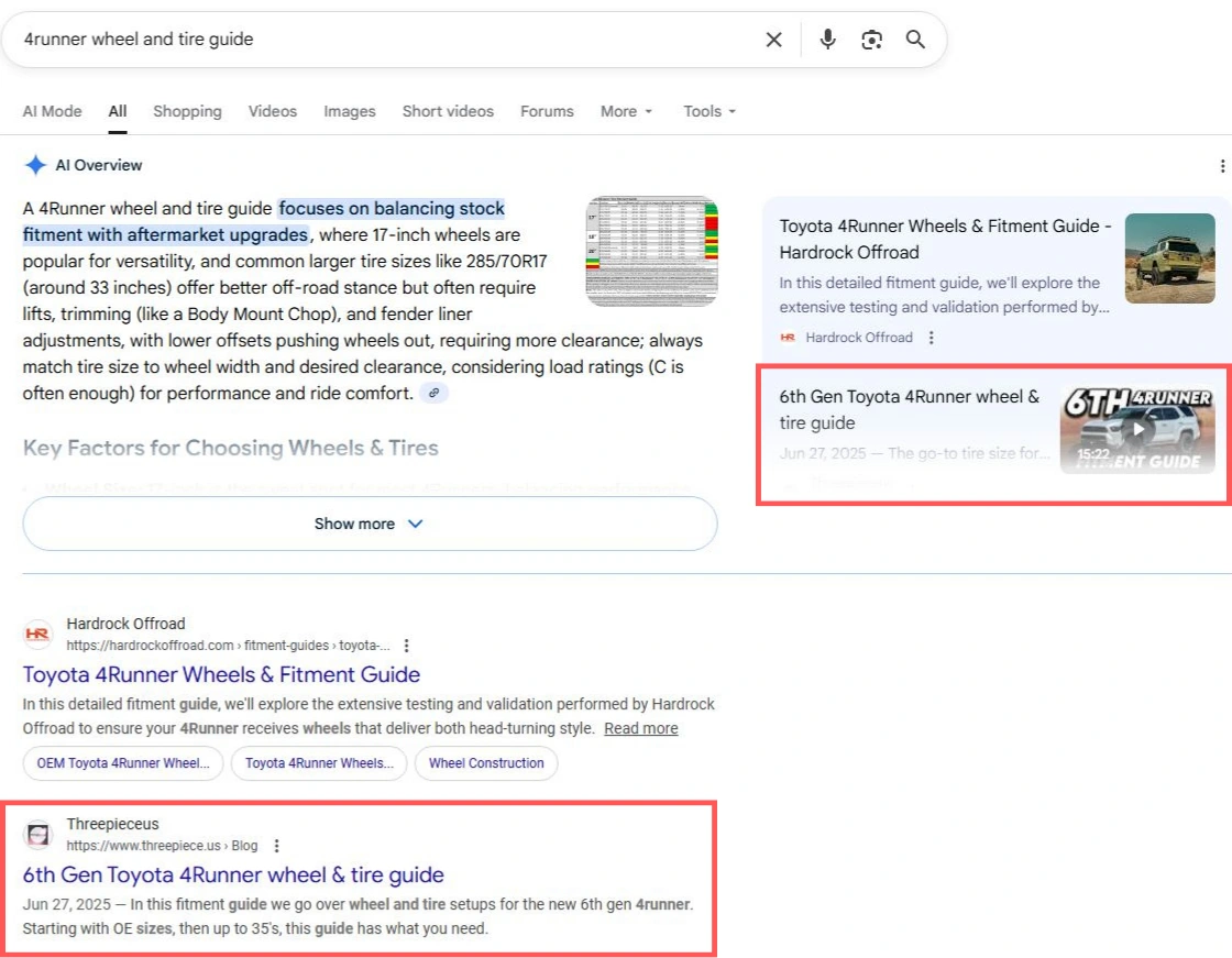 Wheel & tire ‘fitment guides’ are the priority and account for most of the work. Almost all of them rank top 5 for high-intent search terms, with many ranking top 3.